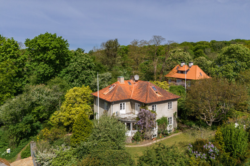 Den här pampiga villan uppfördes 1934 på en högt belägen tomt med sundets blå vatten som närmaste granne.