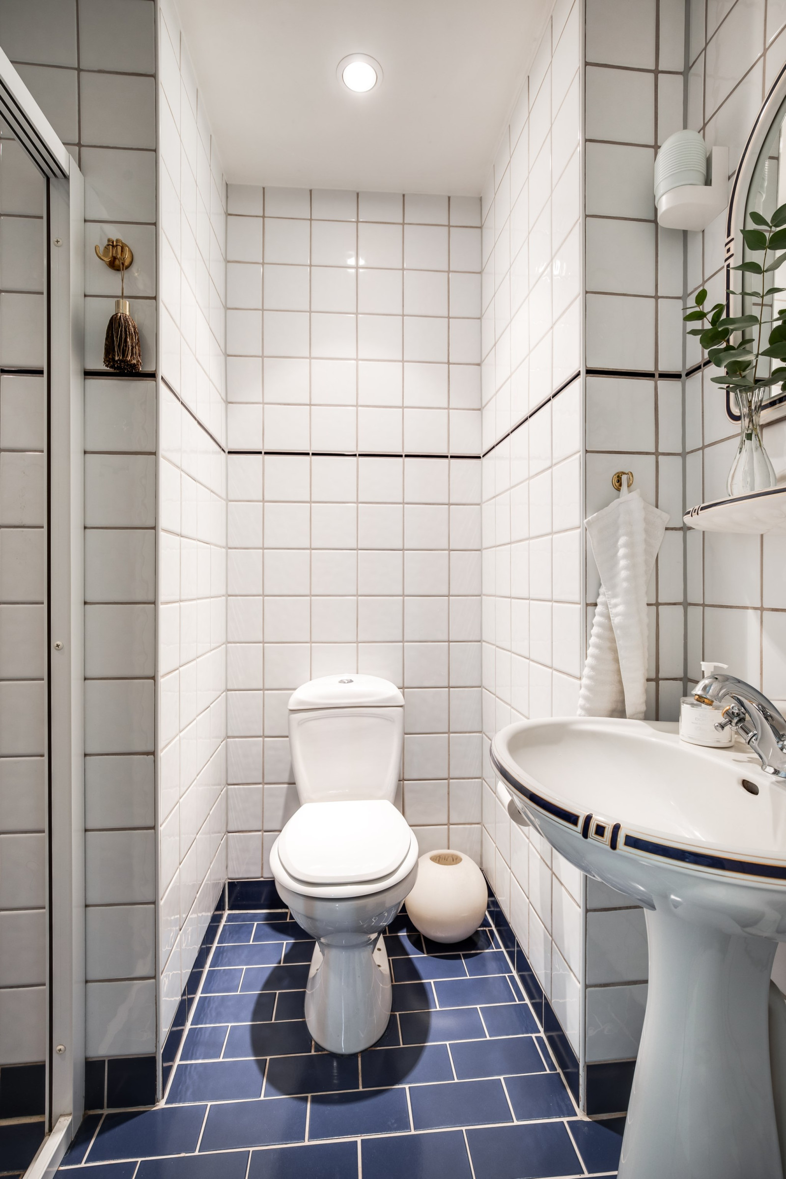 Klinkergolv och kaklade väggar. Dusch, wc och handfat.