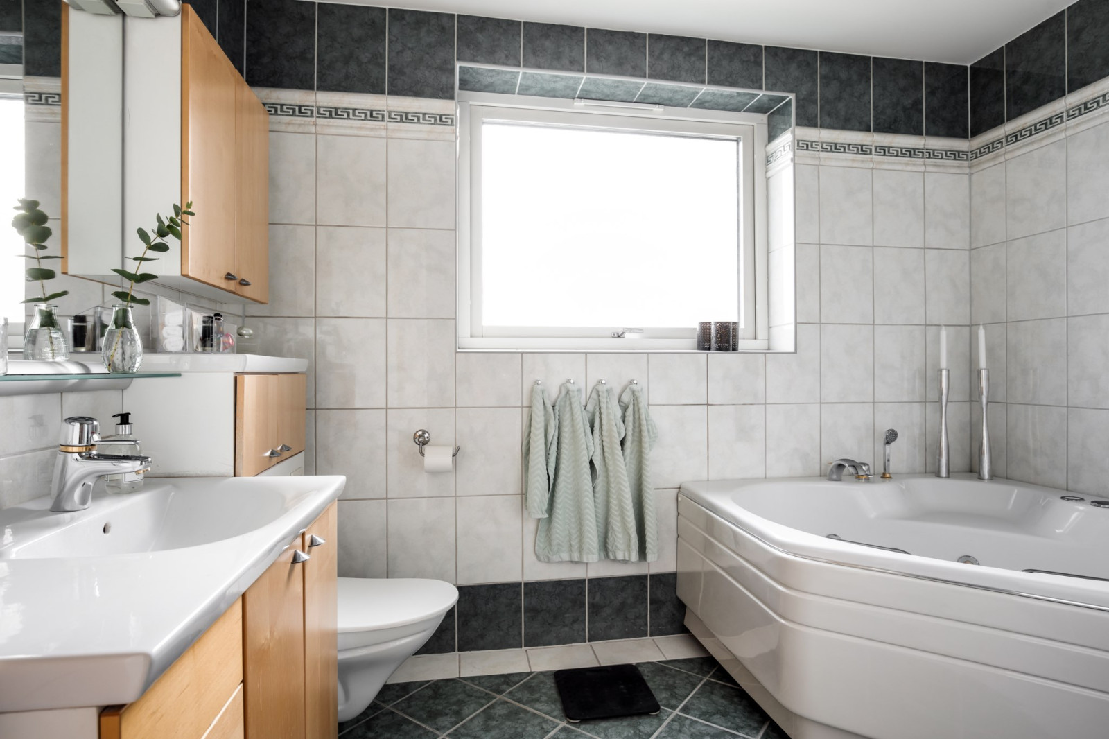 Klinkergolv och kaklade väggar. Badkar, handfat, badrumsskåp och wc.