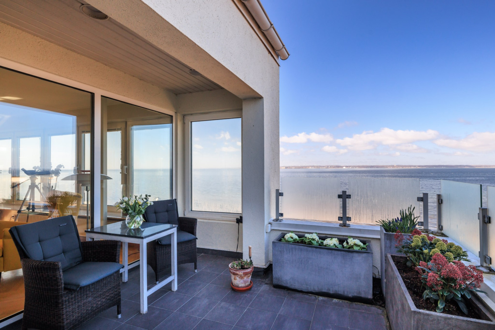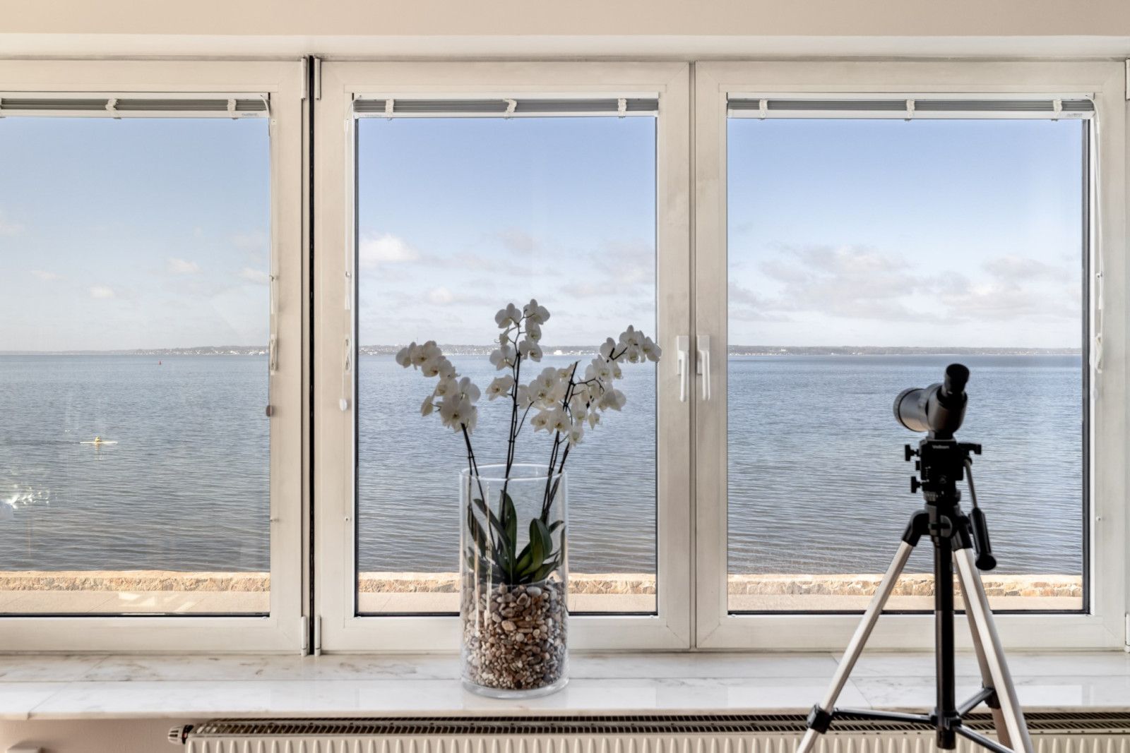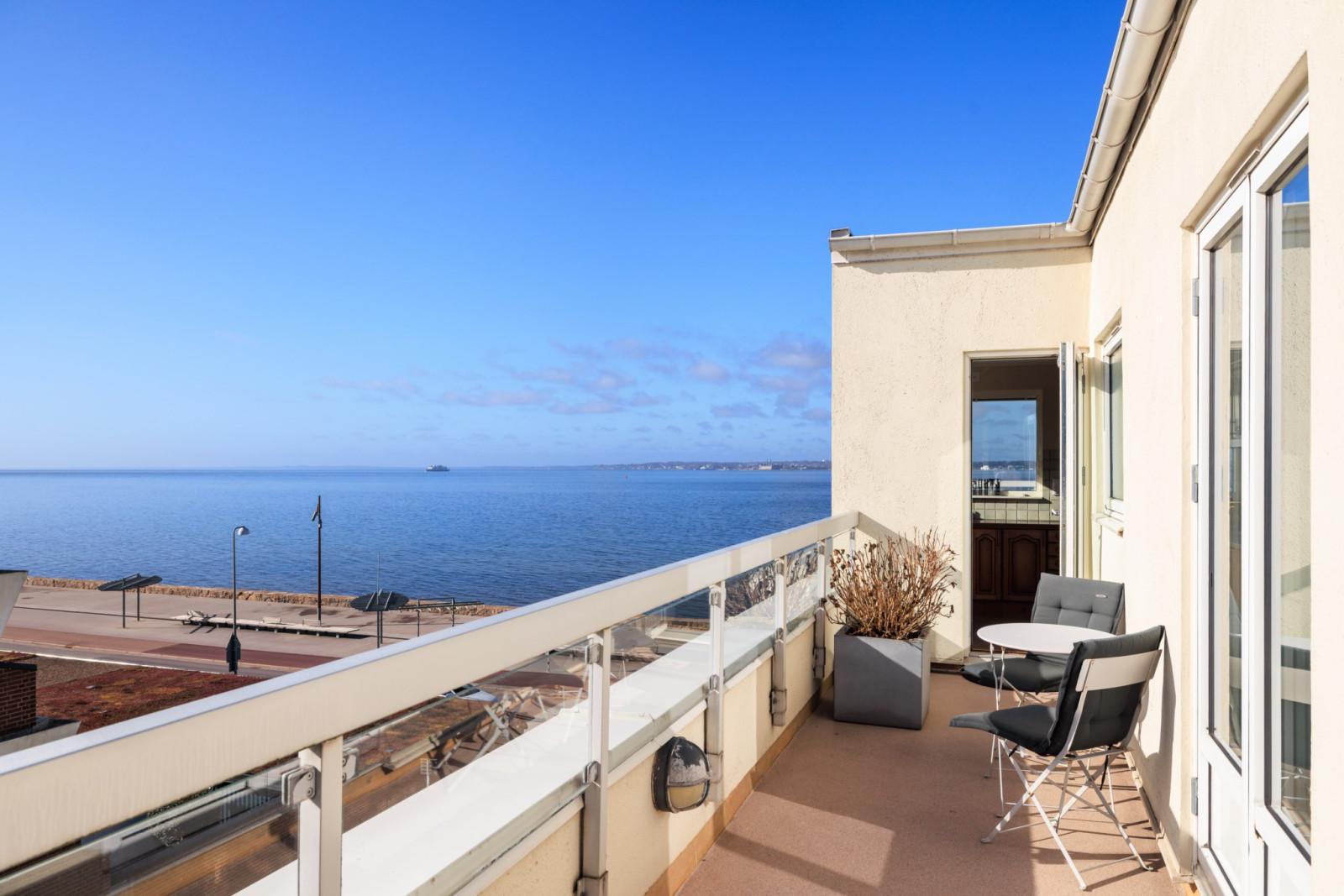 Redan i hallen möts man av en känsla som sätter tonen – detta är ett hem i en klass för sig. Den hänförande, obrutna 180-gradersutsikten över Öresund skapar en atmosfär som är svår att överträffa. Här, högst upp i huset, bor man med ett sällsynt lugn som ger en privat sfär helt fri från insyn.