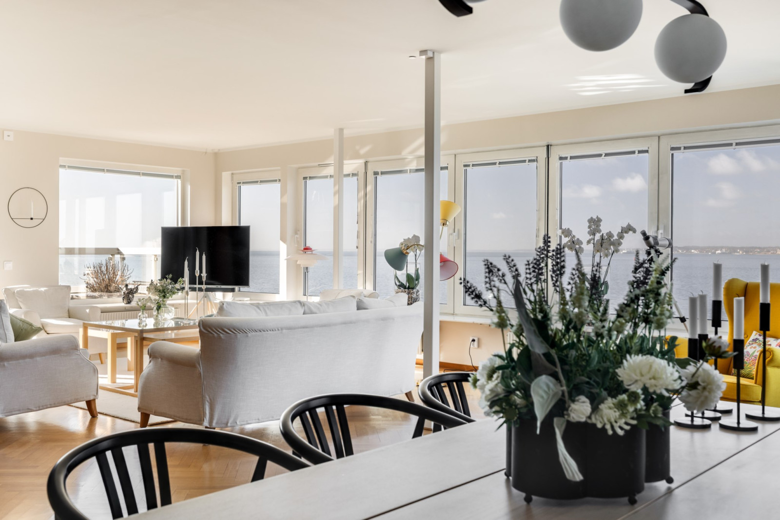 Ljuset flödar generöst genom de stora fönsterpartierna och låter havet närvara i varje rum – från kök och matsal till vardagsrum och sovrum. De tre stora balkongerna i olika väderstreck erbjuder en unik möjlighet att följa solen från morgonens första strålar till solnedgång. Bostadens sociala ytor är väl tilltagna, skapade för såväl vardagsliv som större sammankomster. Sovrummen har goda förvaringsmöjligheter i både garderober och klädkammare, samt bekvämt kompletterad med två badrum i nära anslutning.
