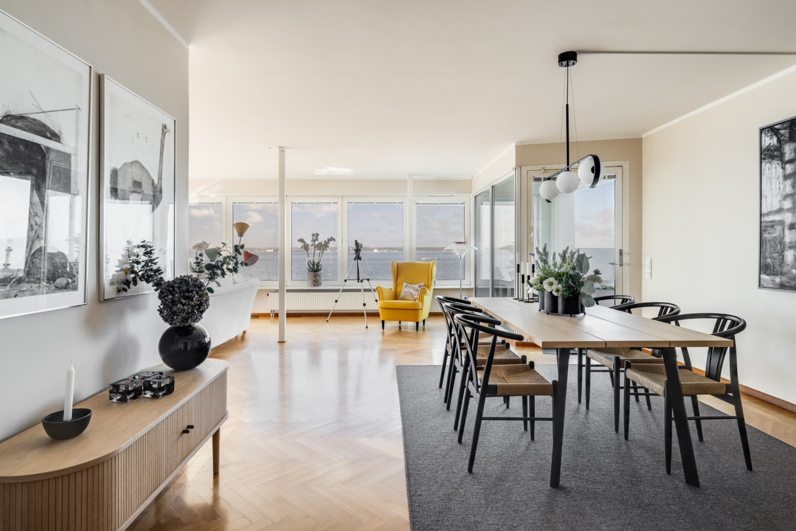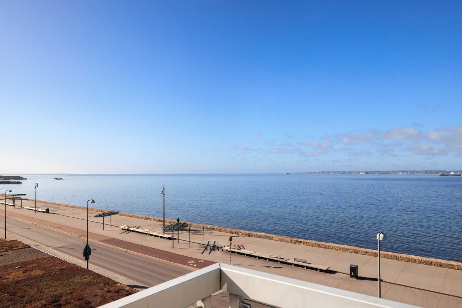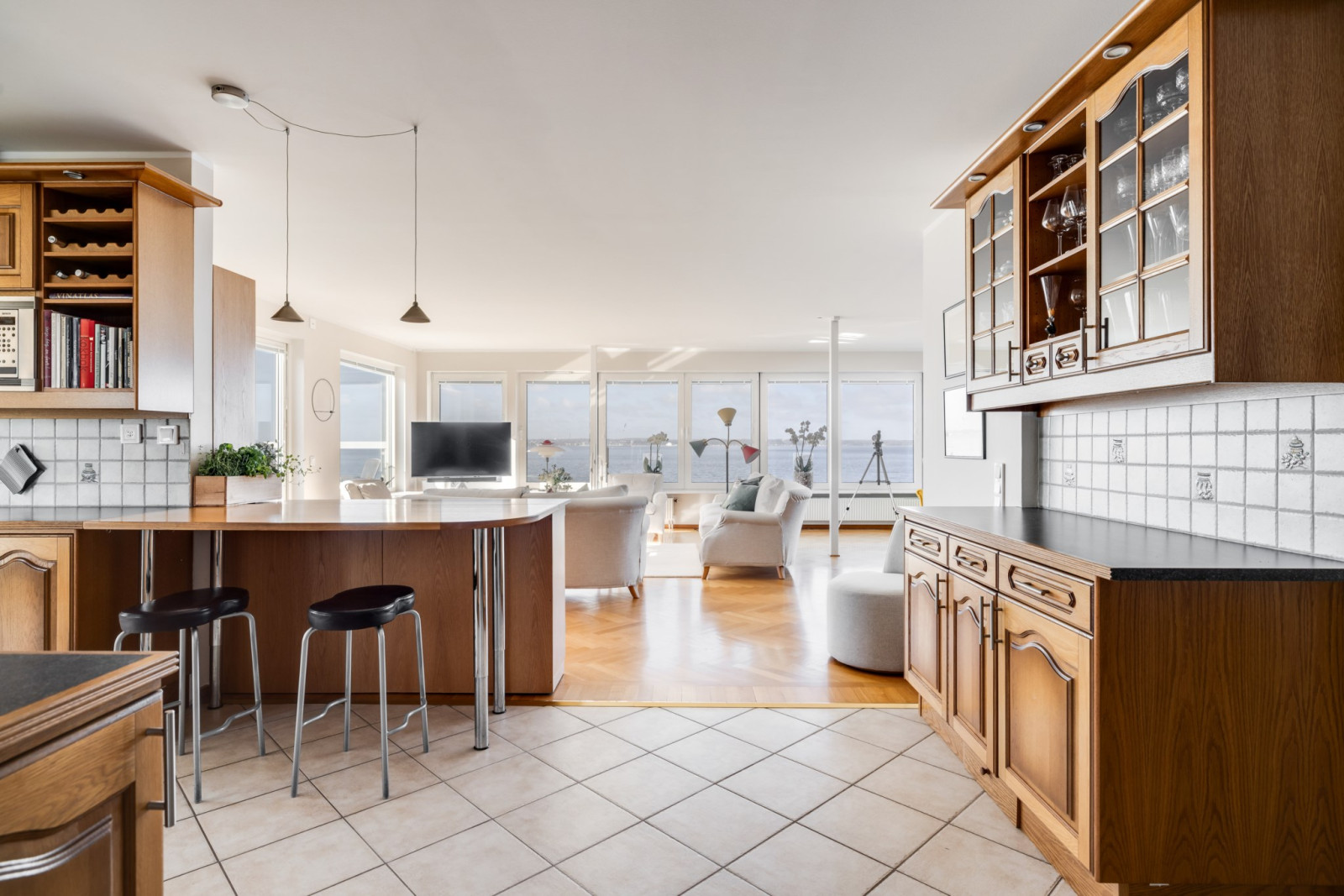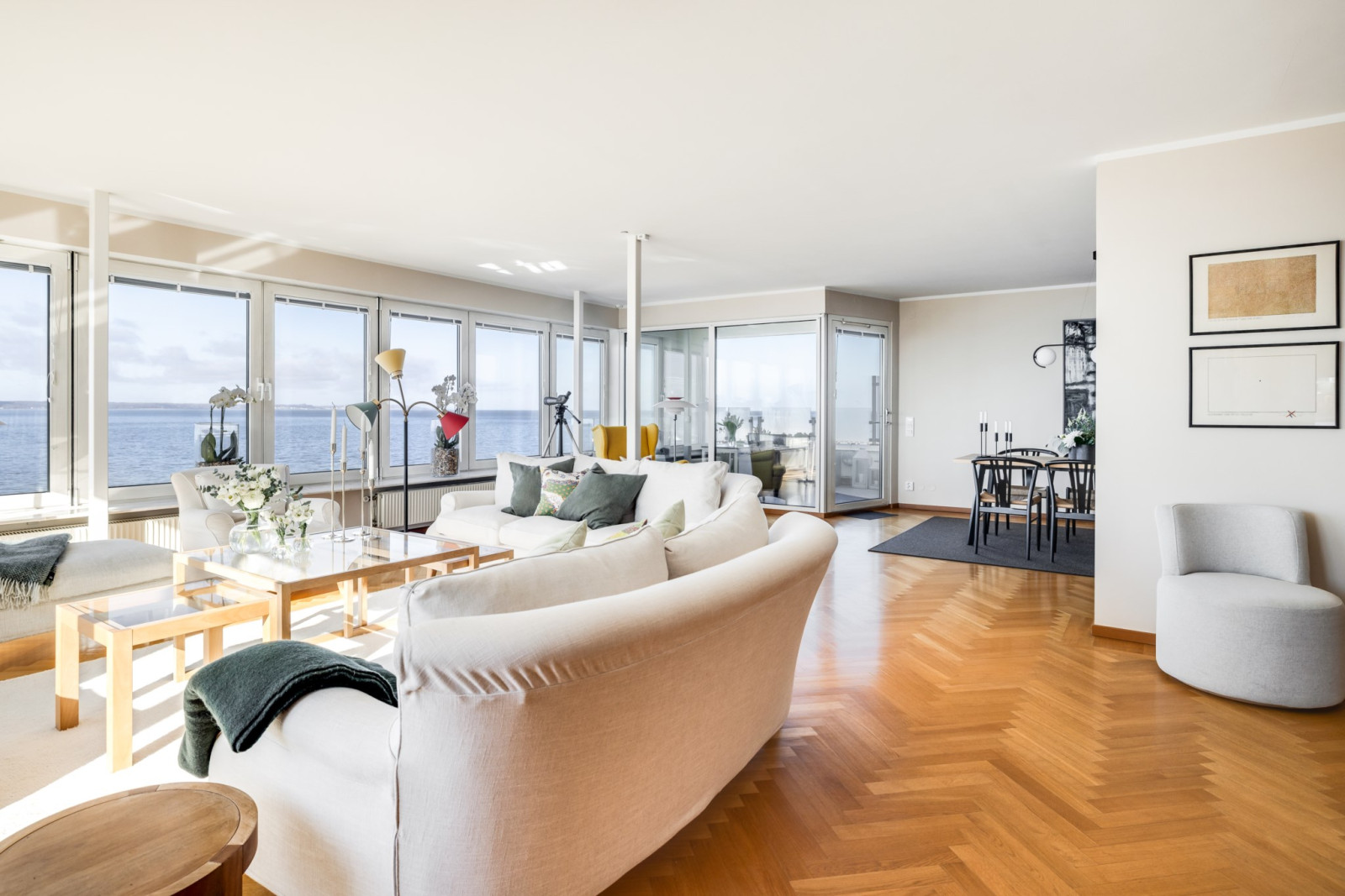 Enhetliga ekparkettgolv i sällskapsrummen, som är rymliga och öppna med stora glaspartier mot sundet och en oslagbar utsikt. Utgång till balkong i nordvästläge, delvis under tak.