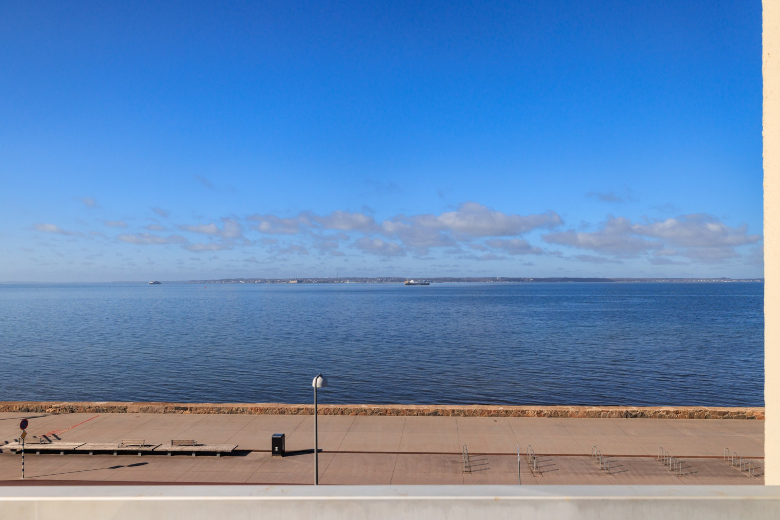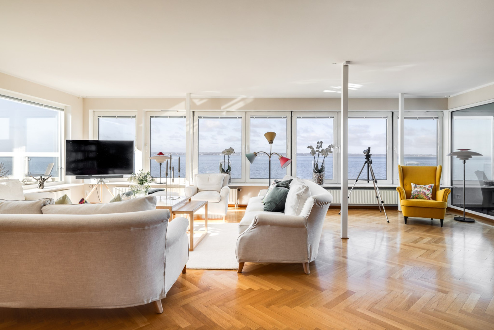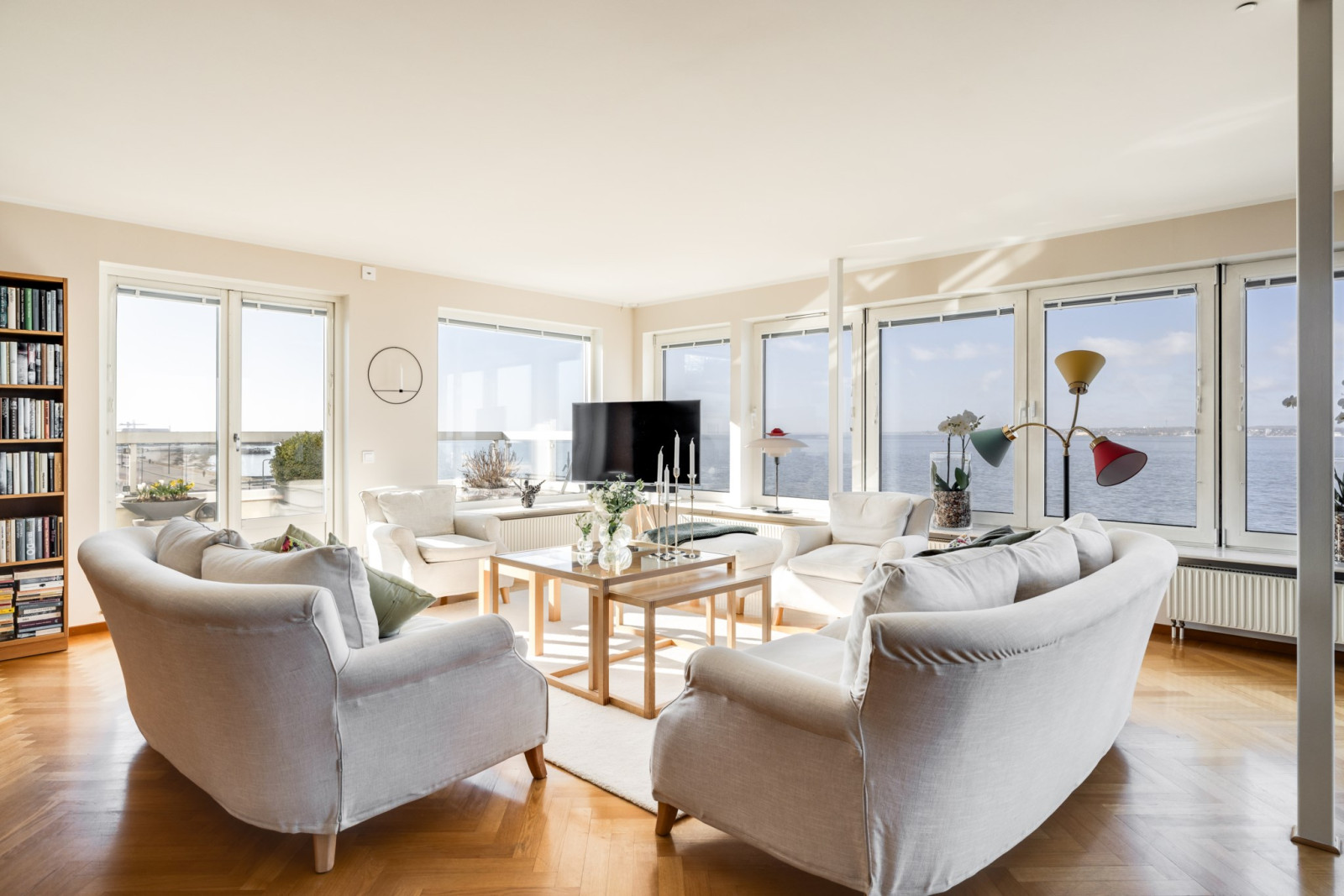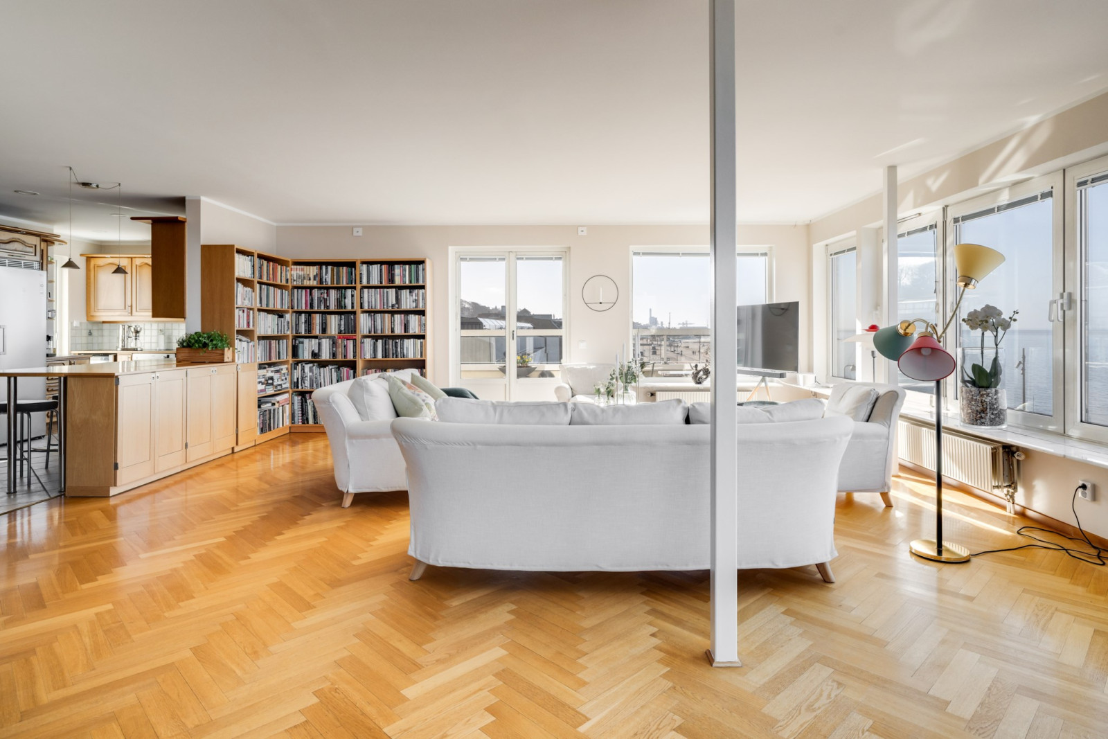 Enhetliga ekparkettgolv i sällskapsrummen, som är rymliga och öppna med stora glaspartier mot sundet och en oslagbar utsikt. Utgång till balkong i nordvästläge, delvis under tak.