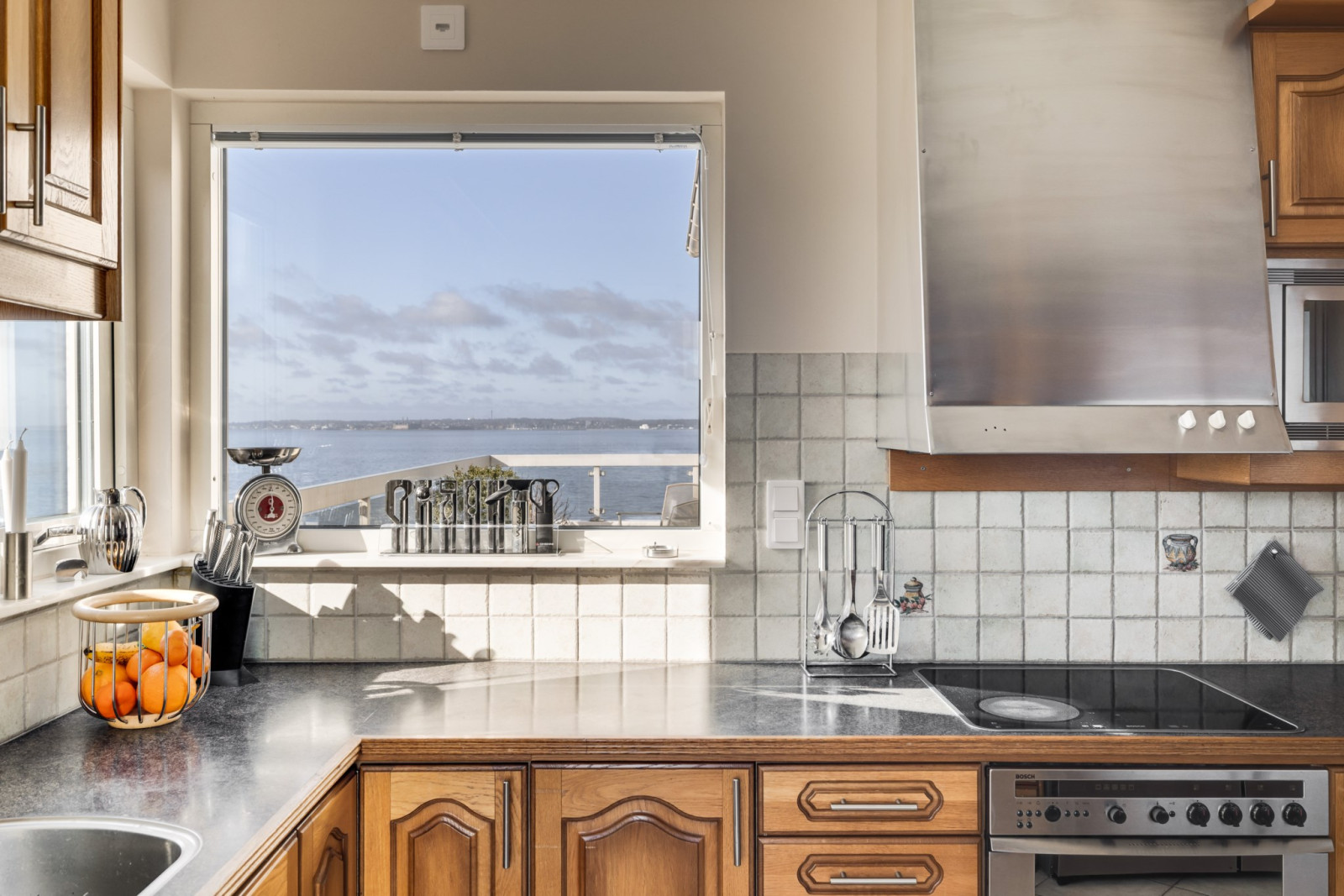 Välplanerat kök med träluckor och stora arbetsytor med samma hänförande utsikt, som sällskapsrummen. Maskinell utrustning bestående av spishäll, ugn, fläkt, diskmaskin, kyl och frys. Klinkergolv och utgång till balkong i söderläge.
