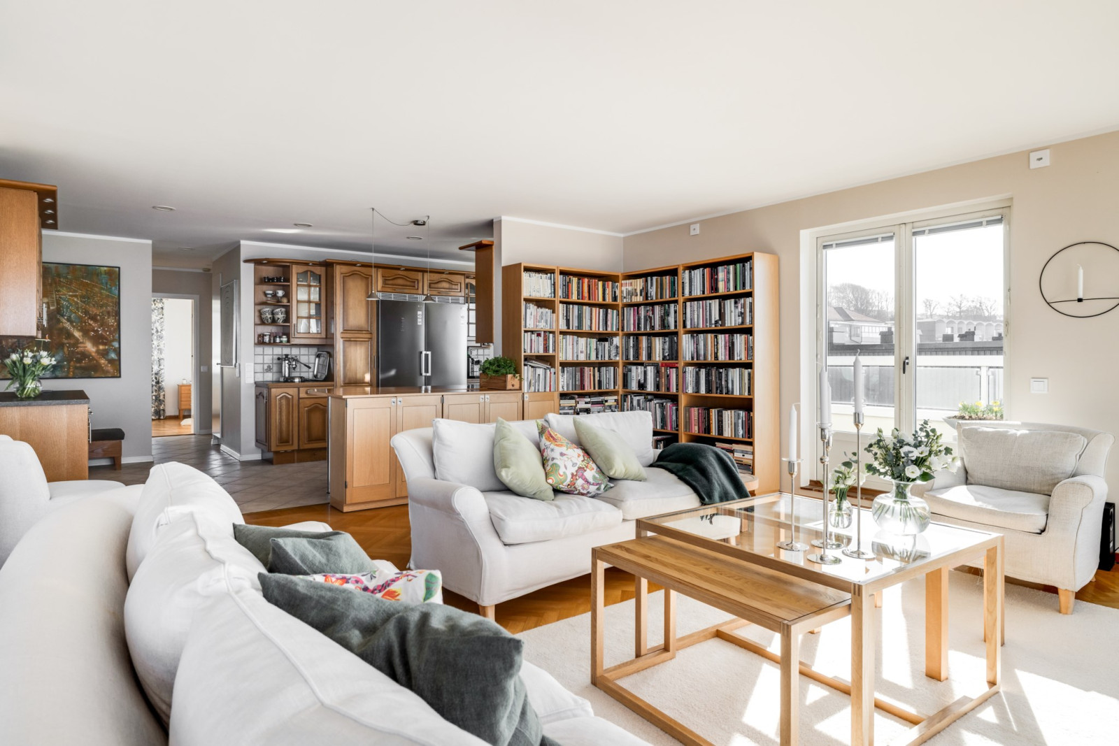 Öppen planlösning mot kök och utgång till balkong i sydvästläge.