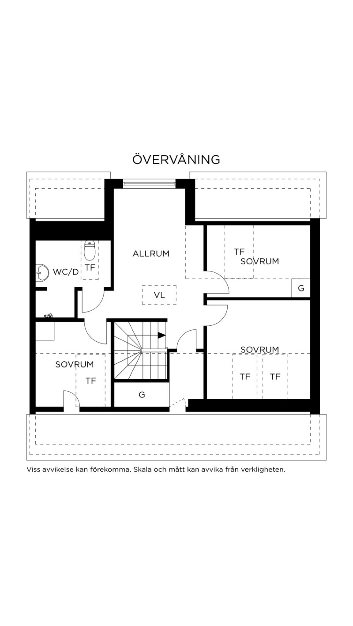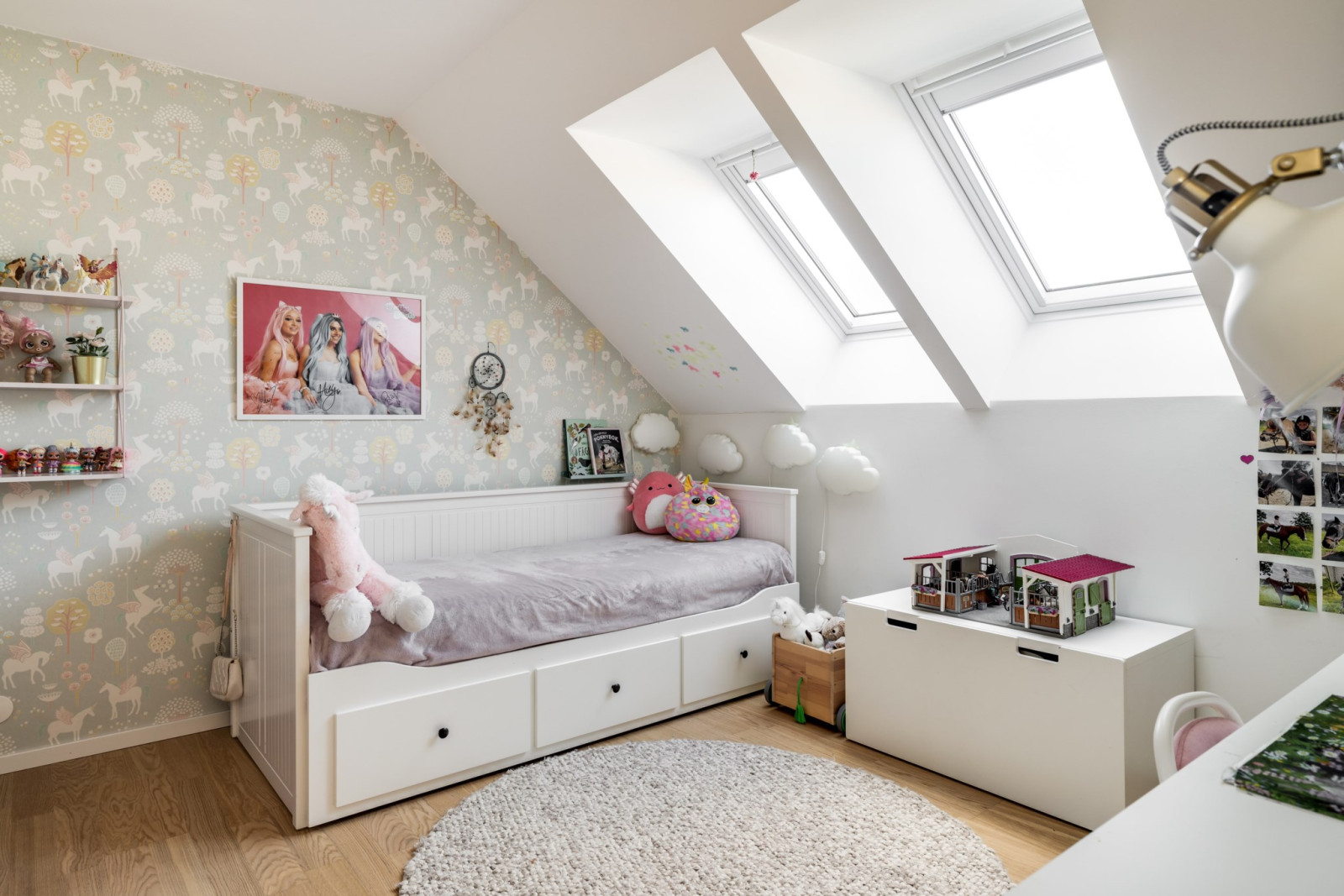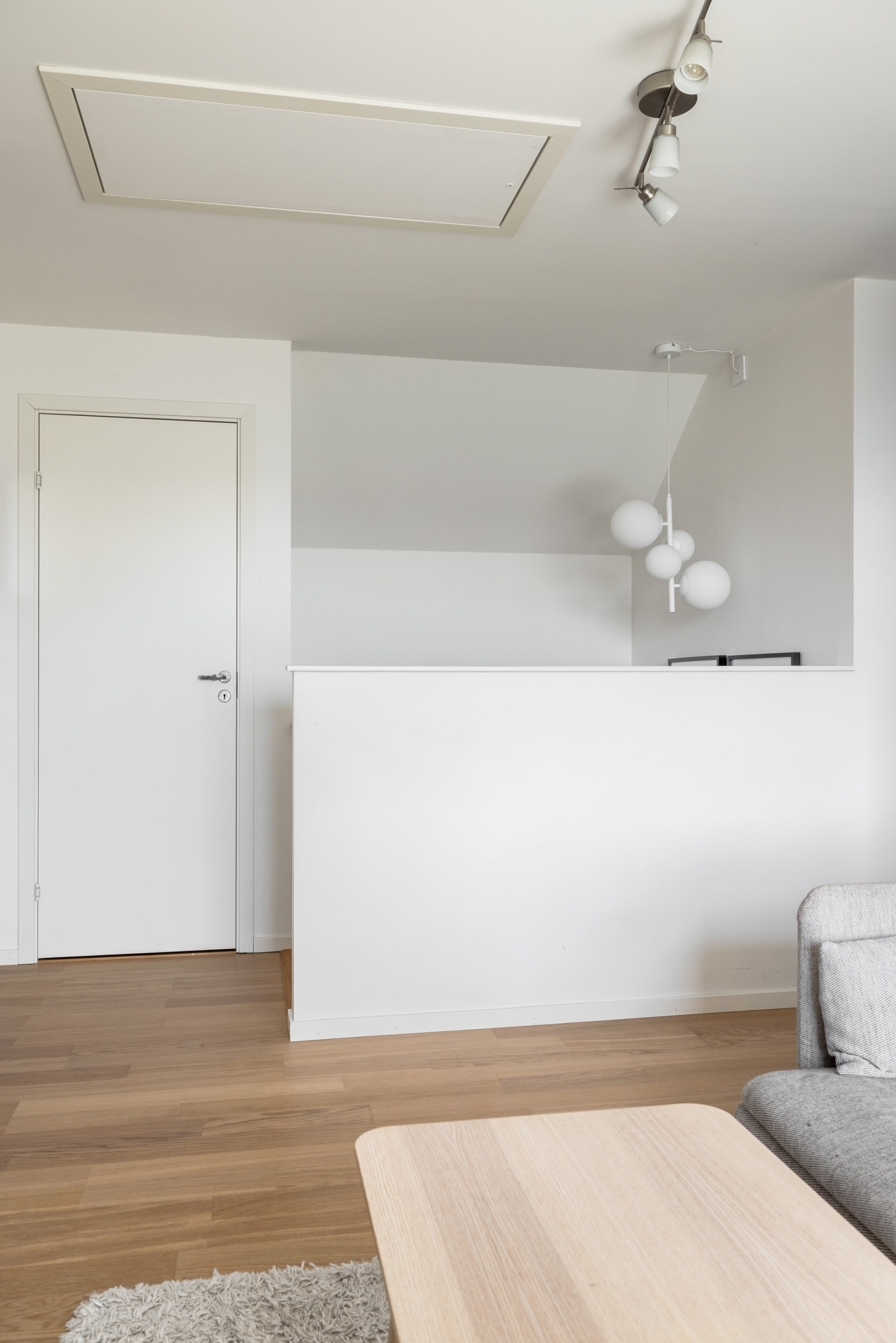 Trappan slutar i ett mysigt allrum om 13 kvm. Takkupan skänker både ljus och rymd.