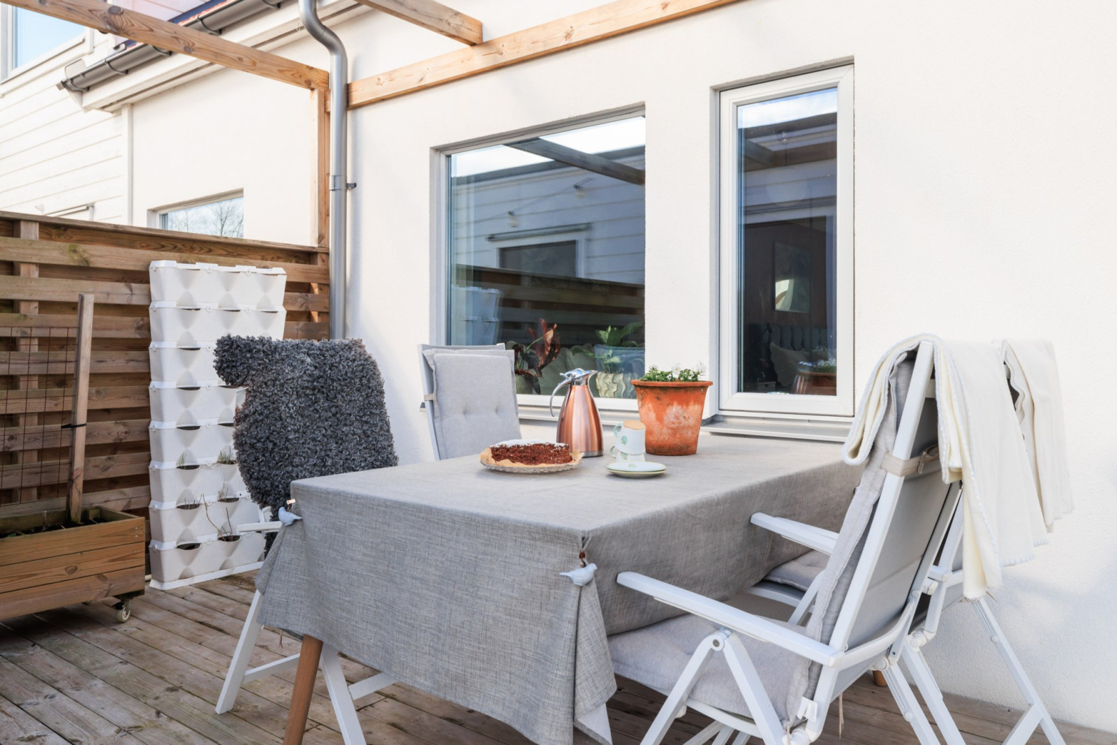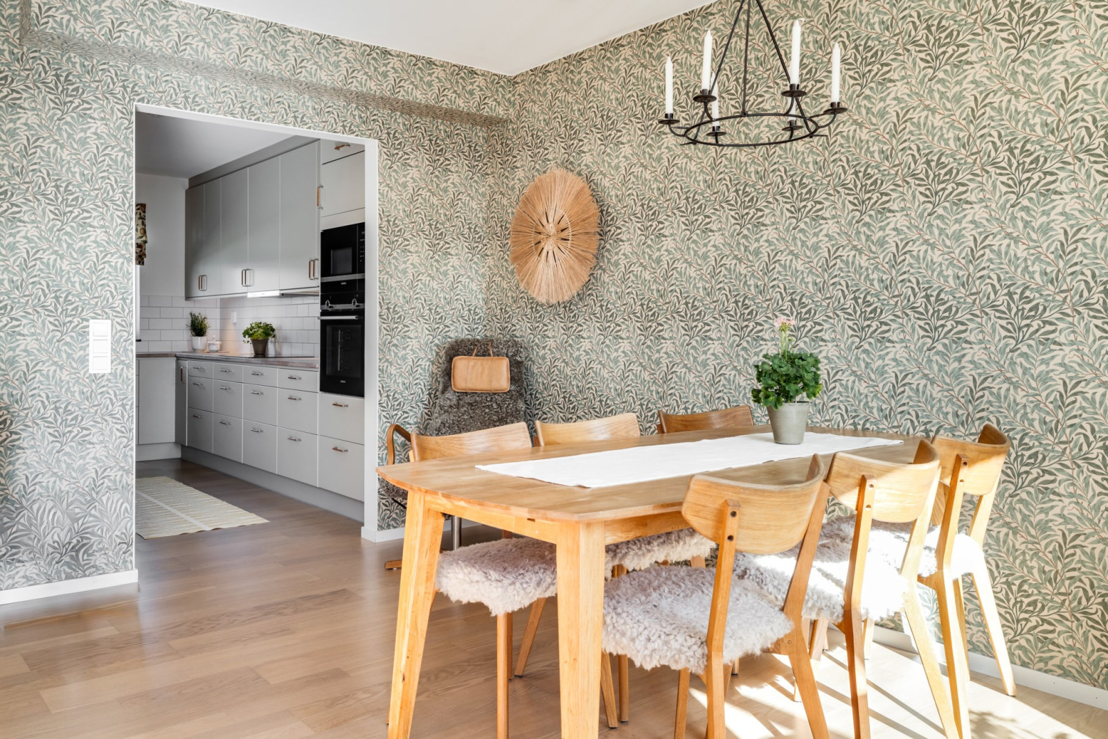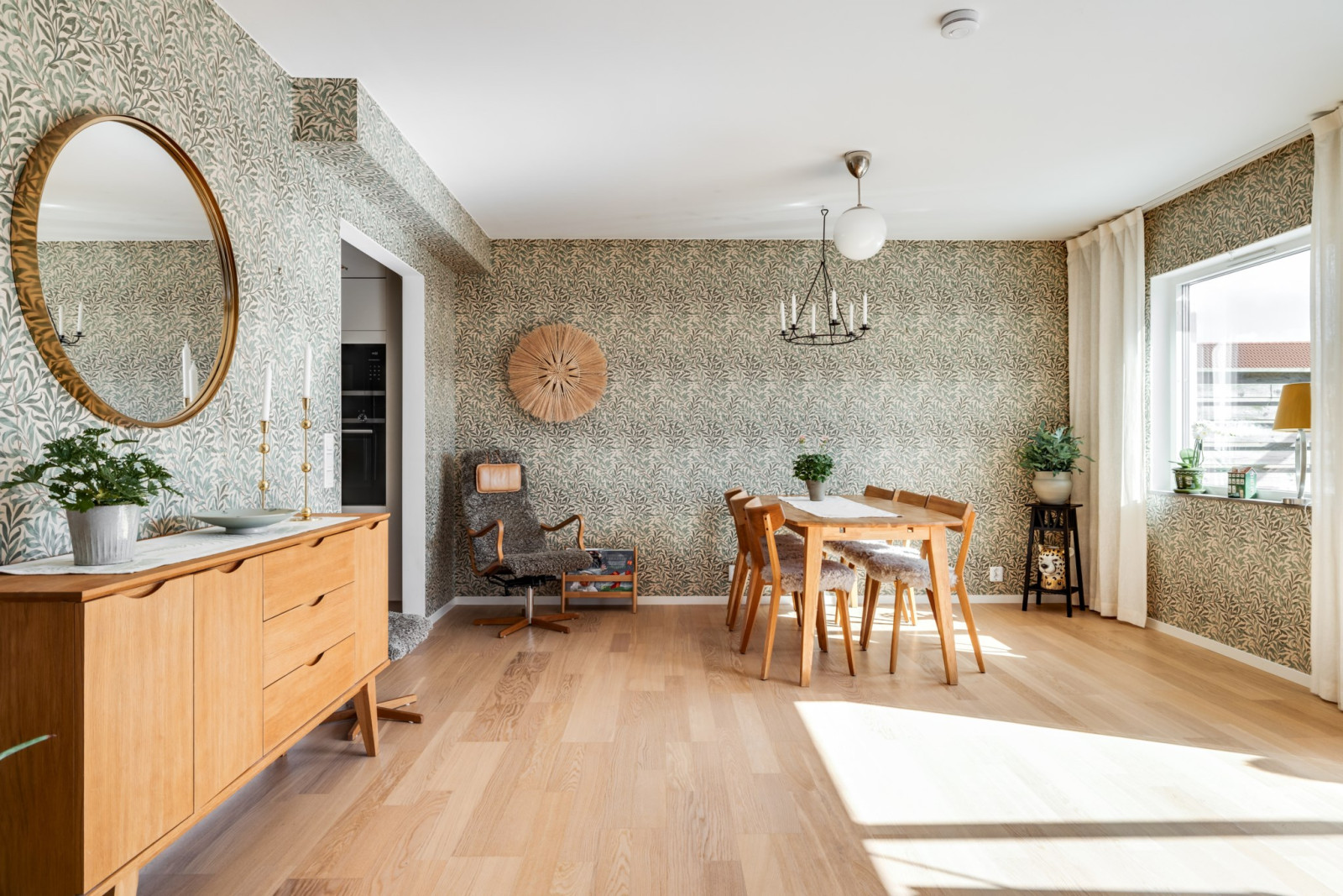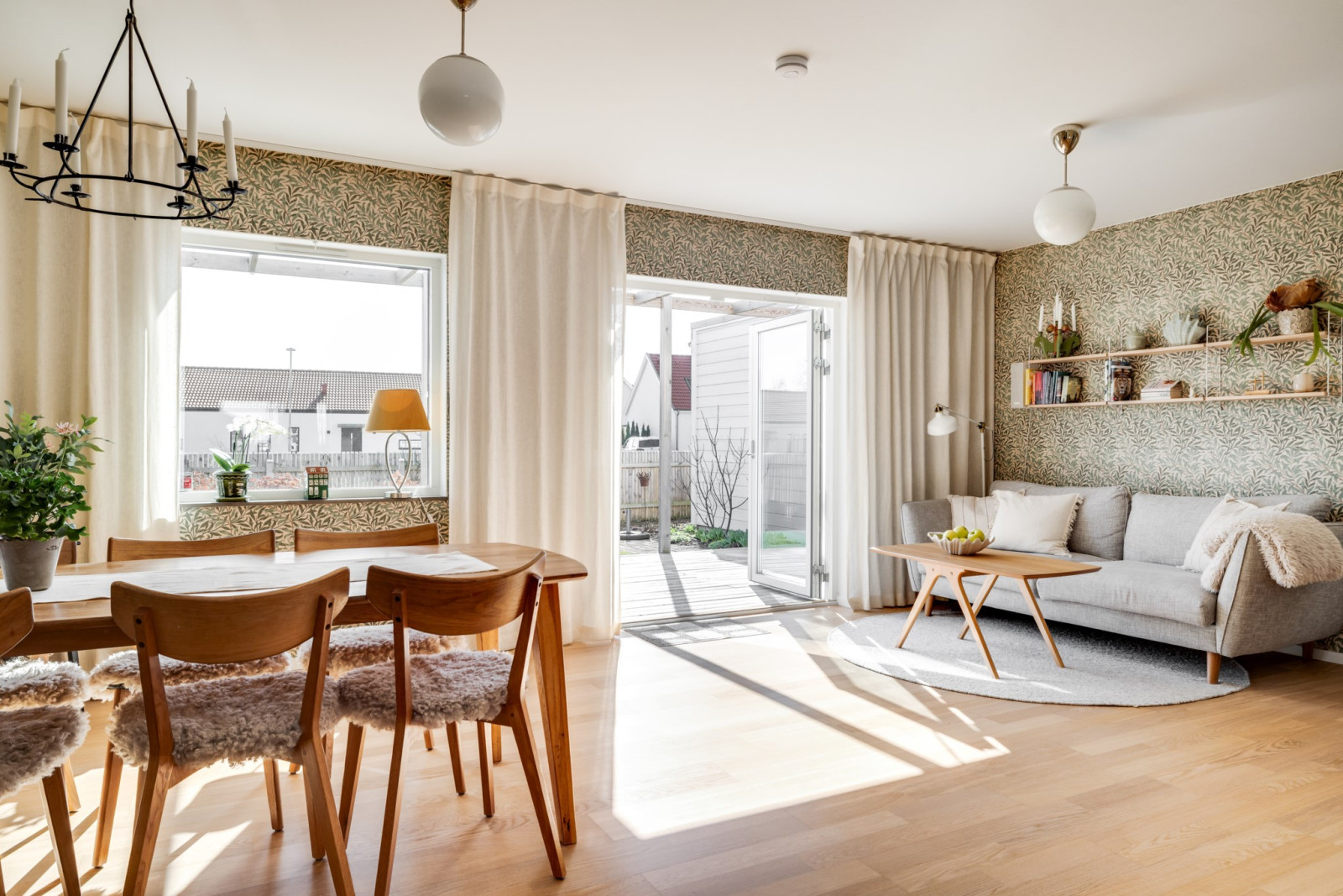 Intill köket ligger det ljusa, trevliga vardagsrummet om 38 kvm. Gott om plats för både matbord och soffa. Extra trevligt med dubbeldörrar till den rogivande utemiljön.