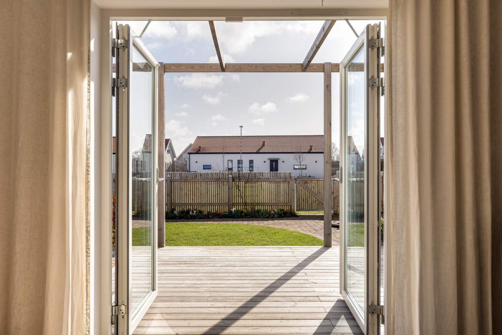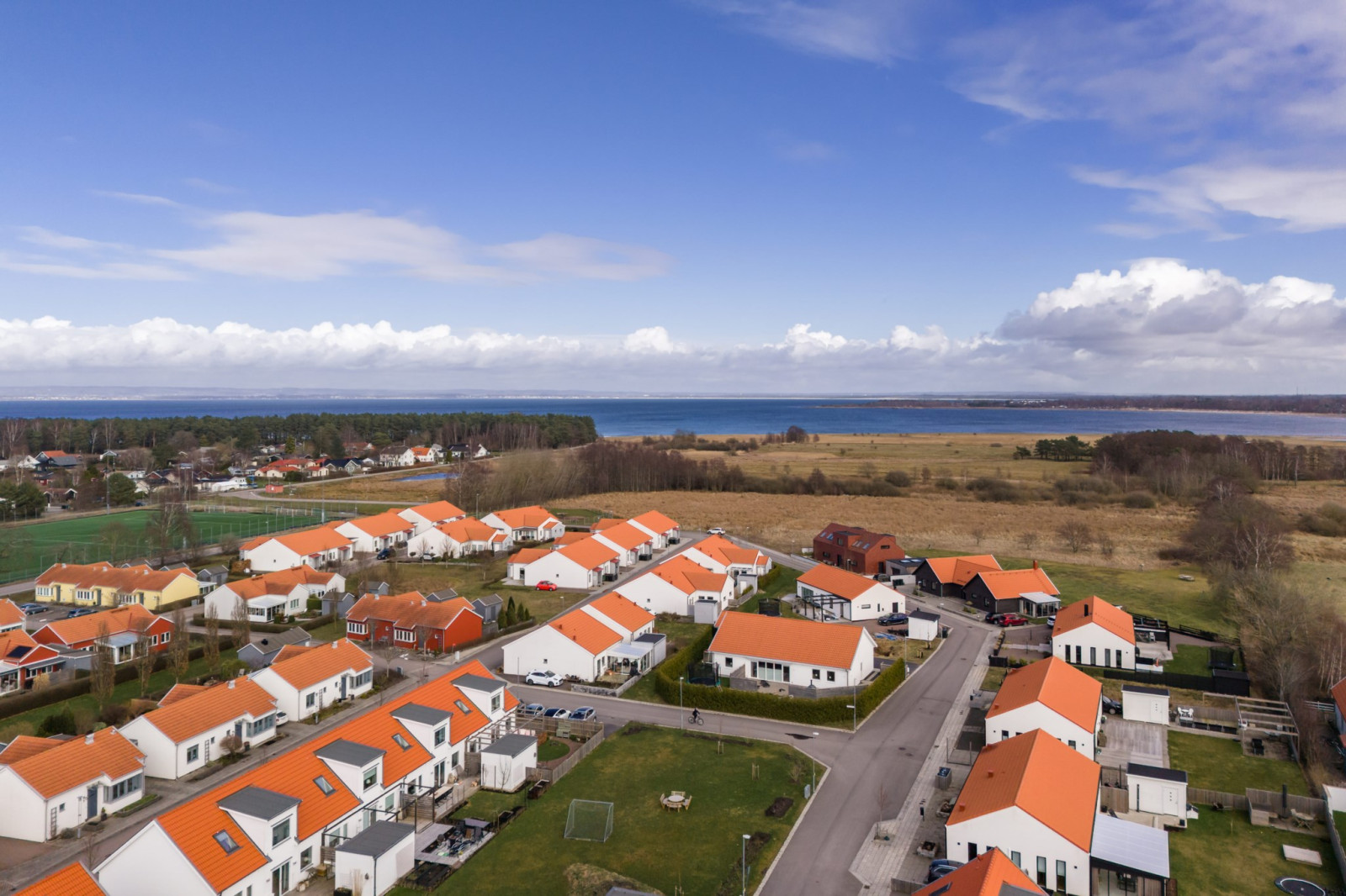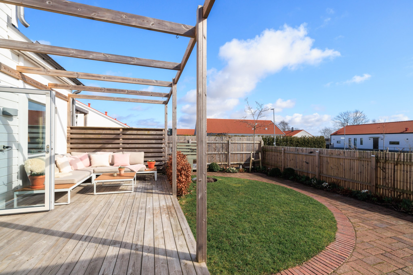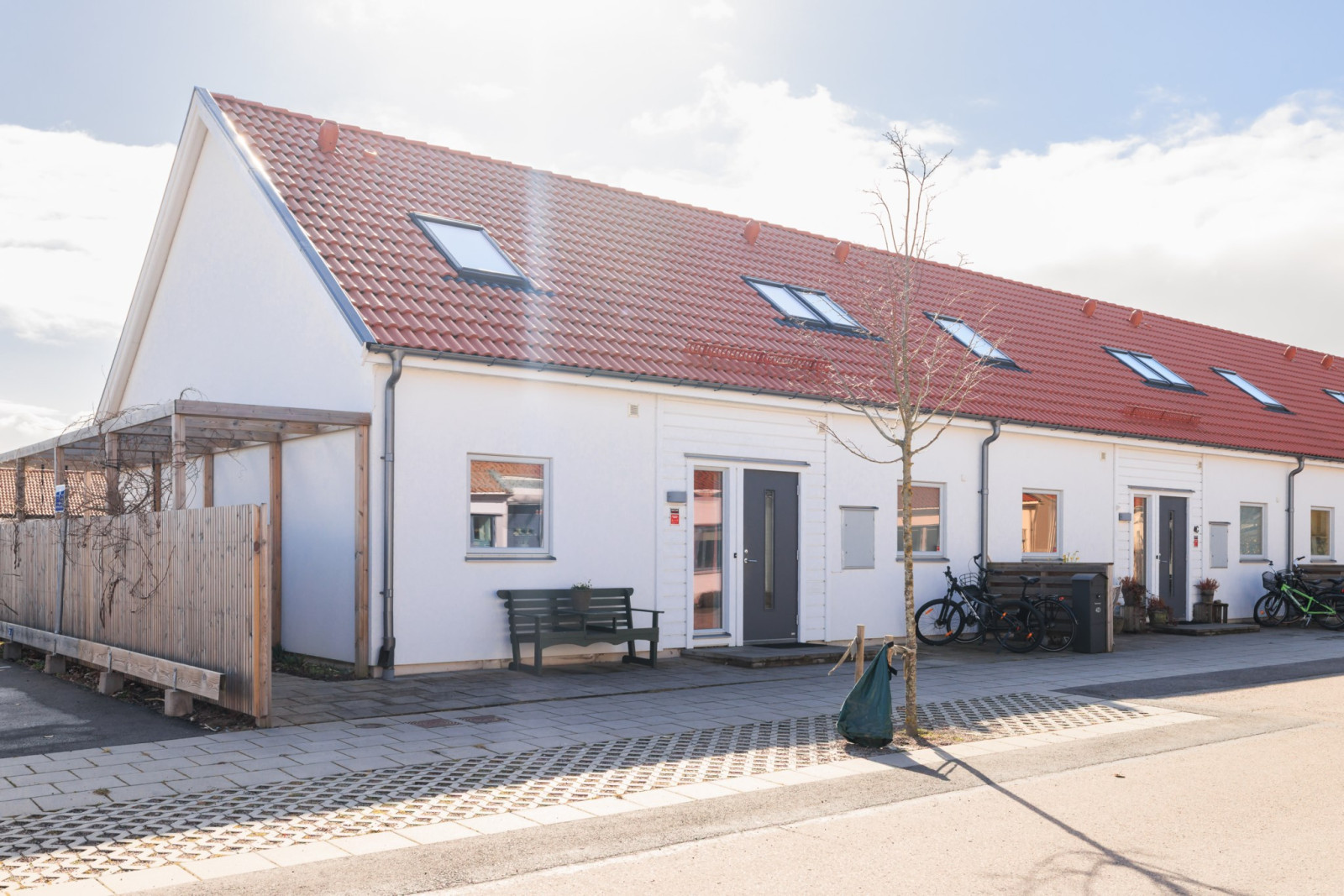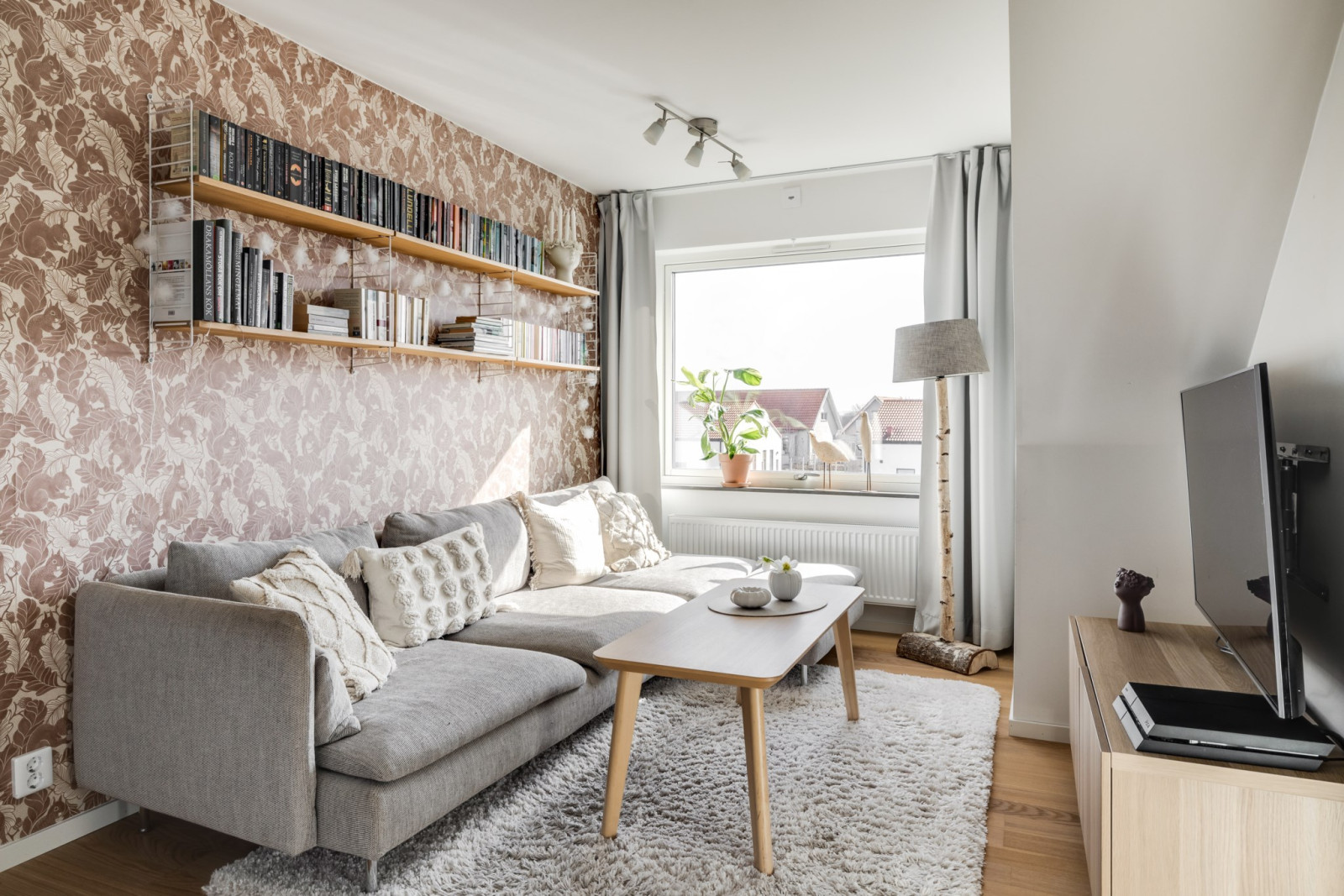 Intill köket ligger det ljusa, trevliga vardagsrummet om 38 kvm. Gott om plats för både matbord och soffa. Extra trevligt med dubbeldörrar till den rogivande utemiljön.