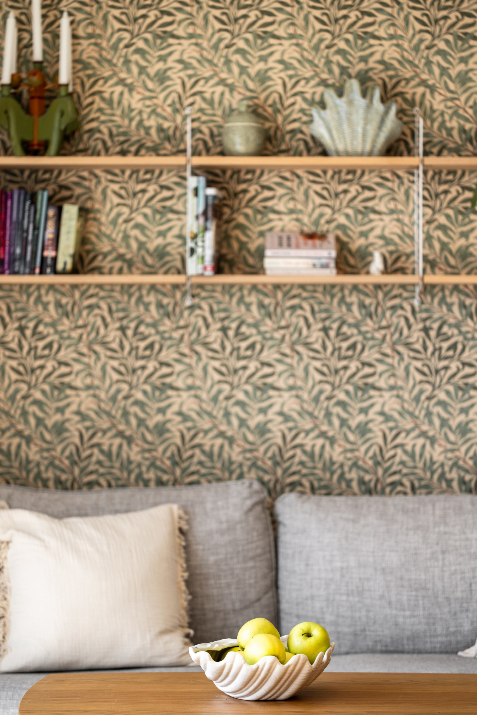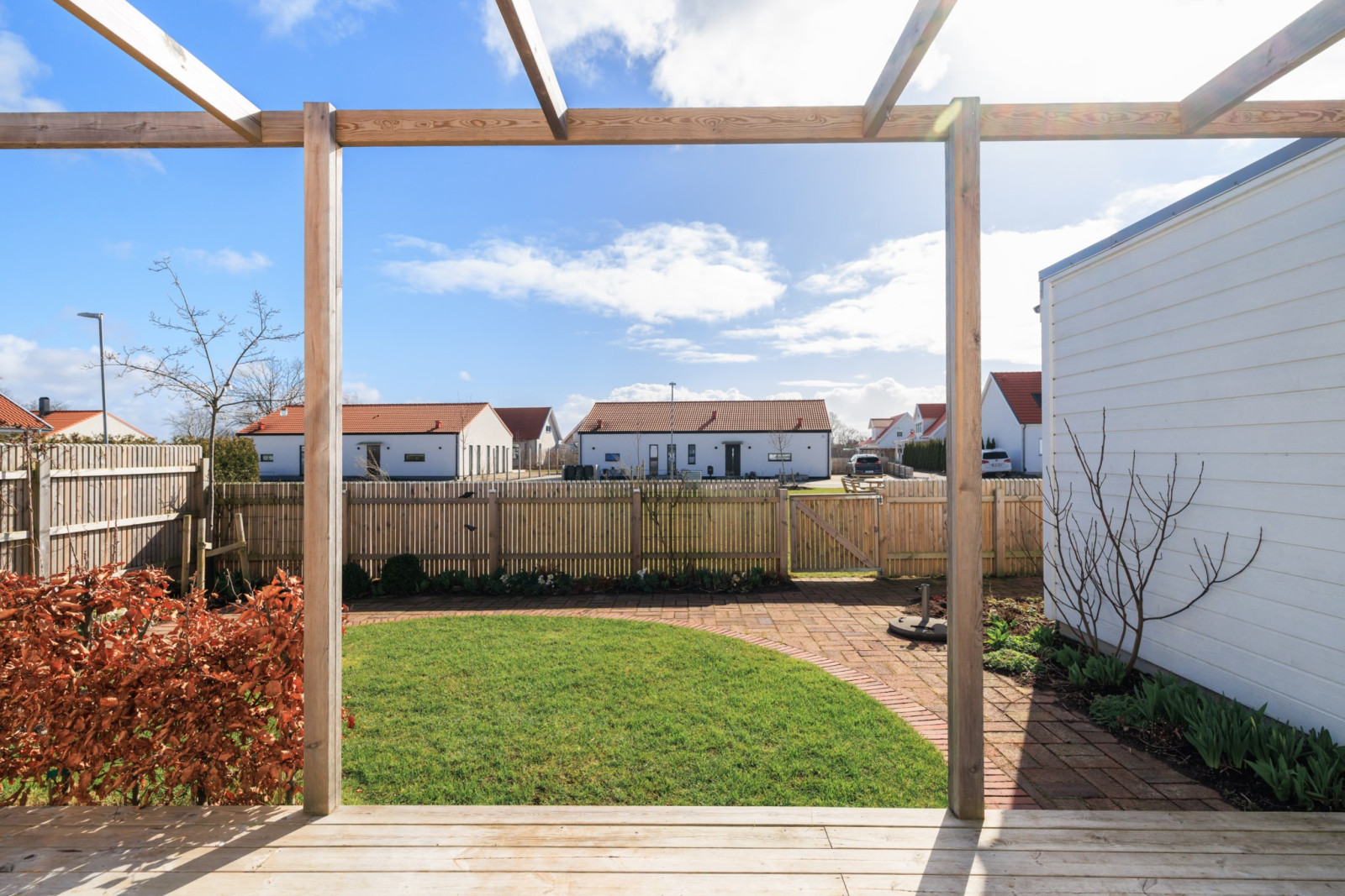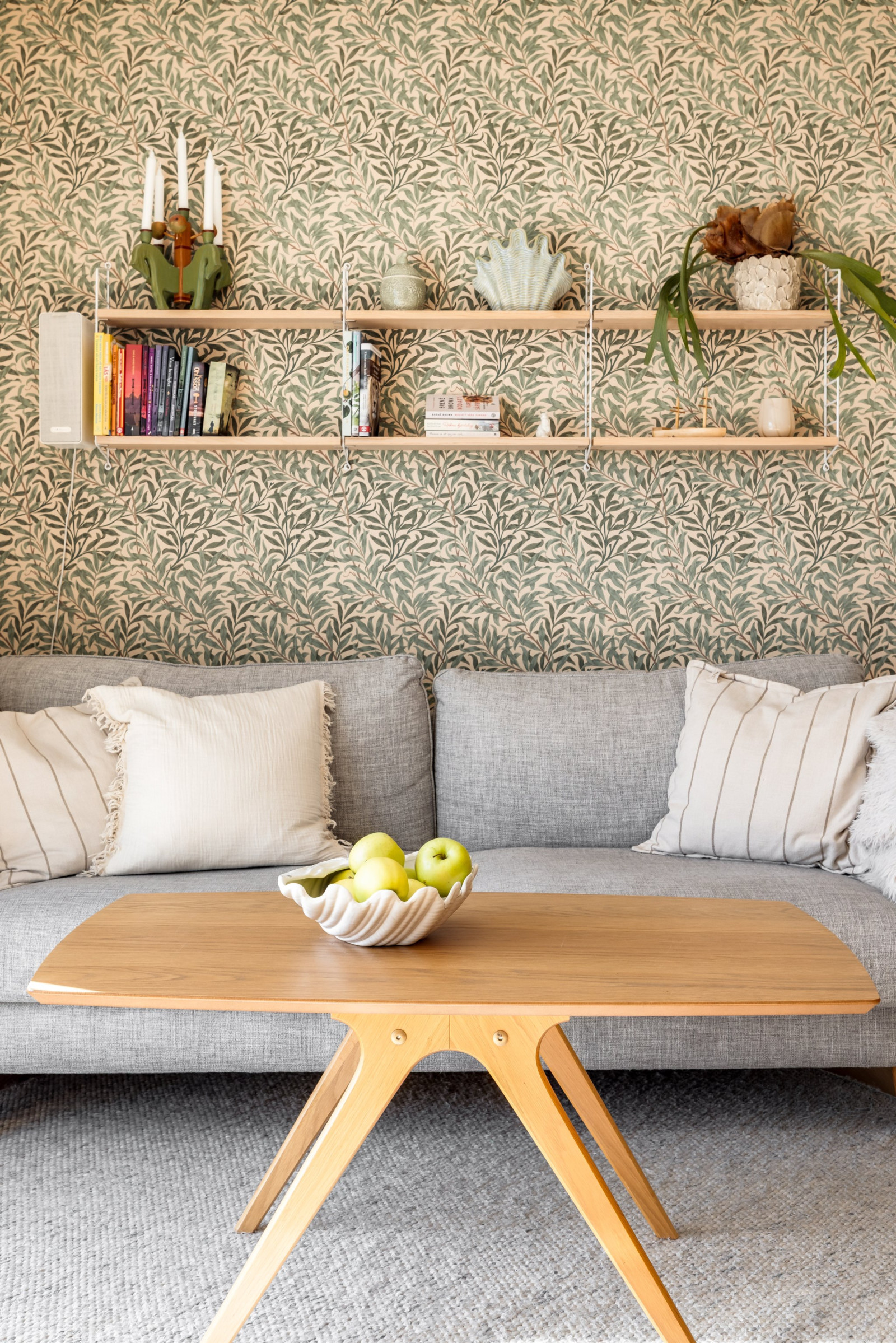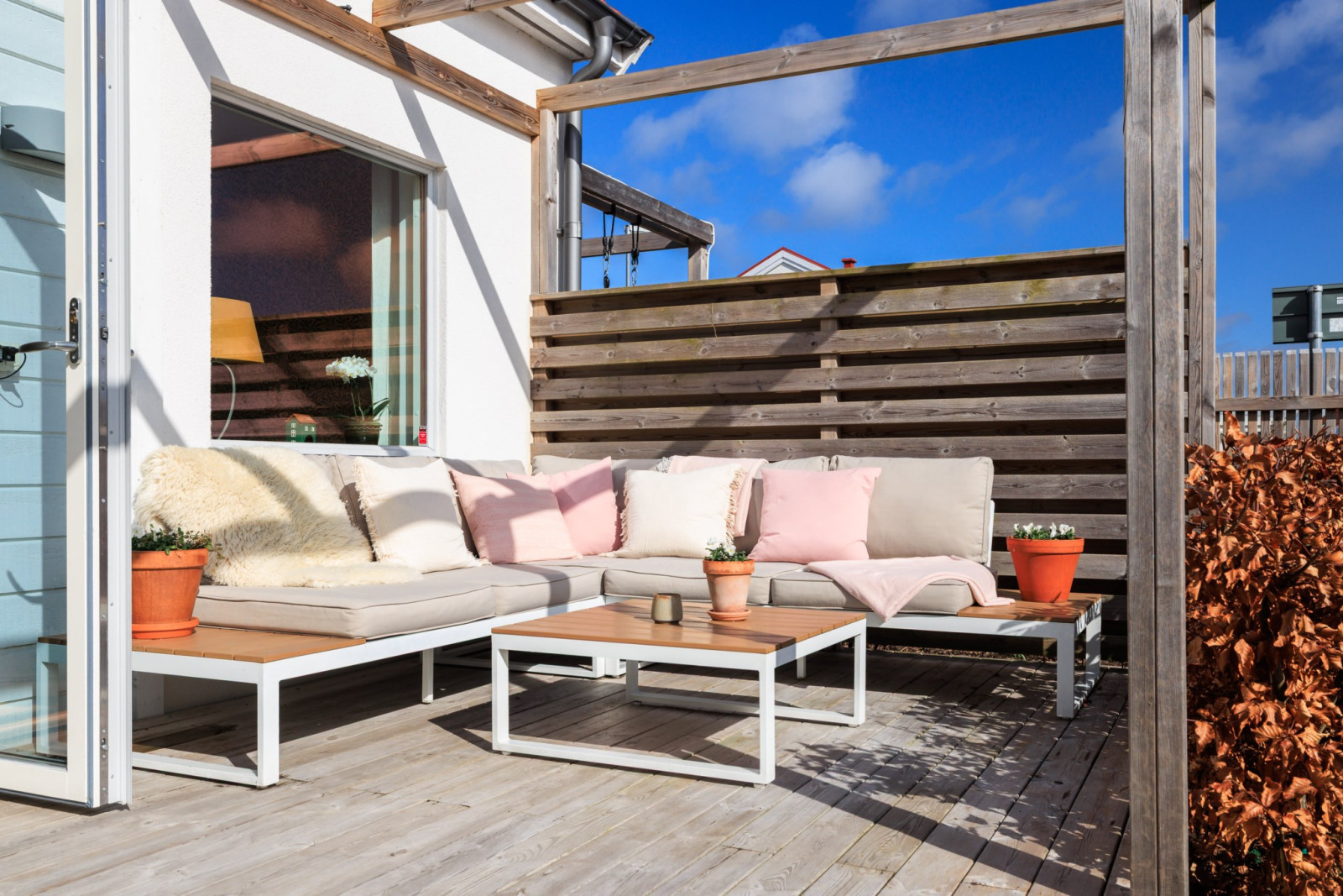 Intill köket ligger det ljusa, trevliga vardagsrummet om 38 kvm. Gott om plats för både matbord och soffa. Extra trevligt med dubbeldörrar till den rogivande utemiljön.