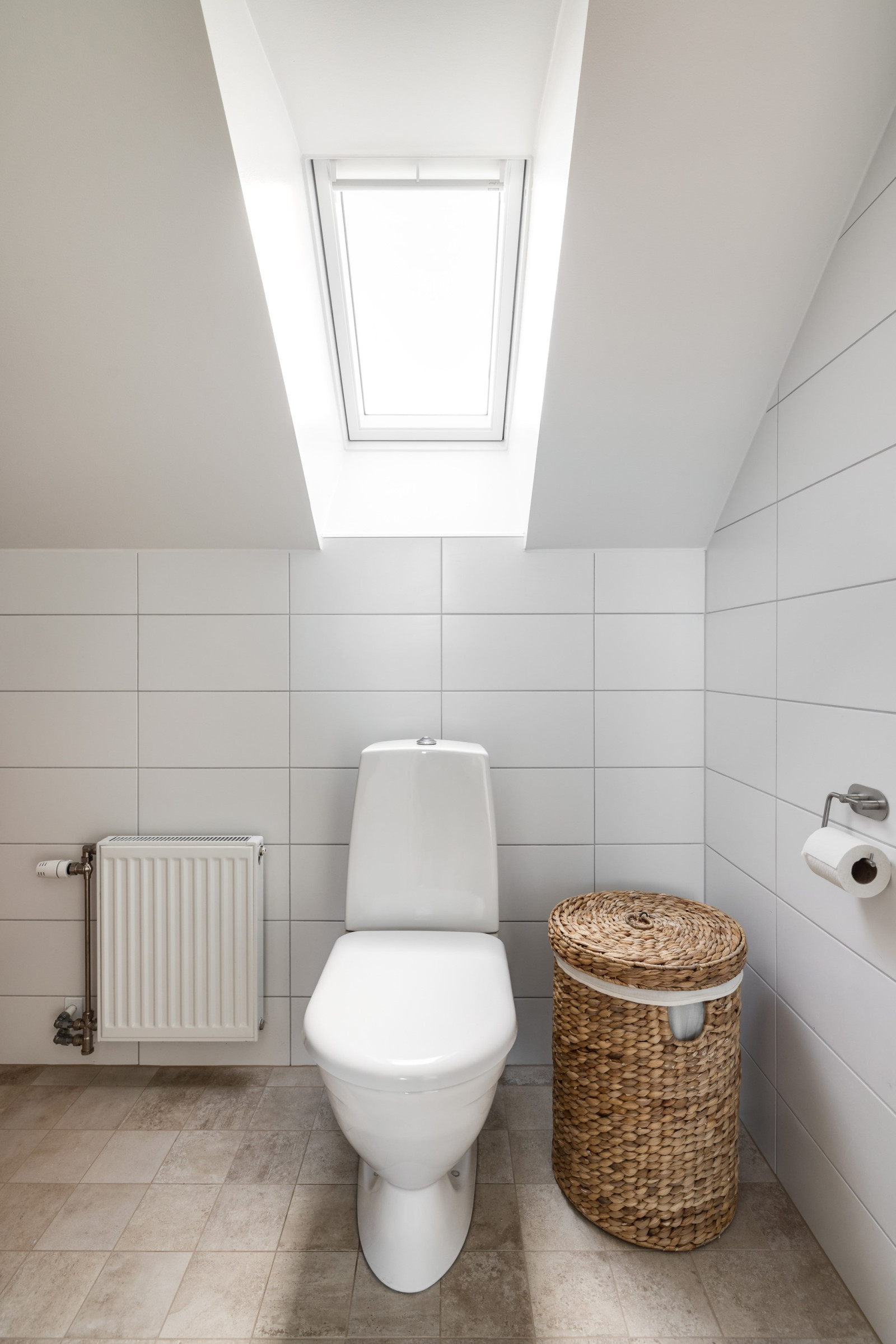 Kakelklädda väggar och klinkergolv i tidlös stil. Duschplats, wc och tvättställ. Takfönster ger härligt ljus.