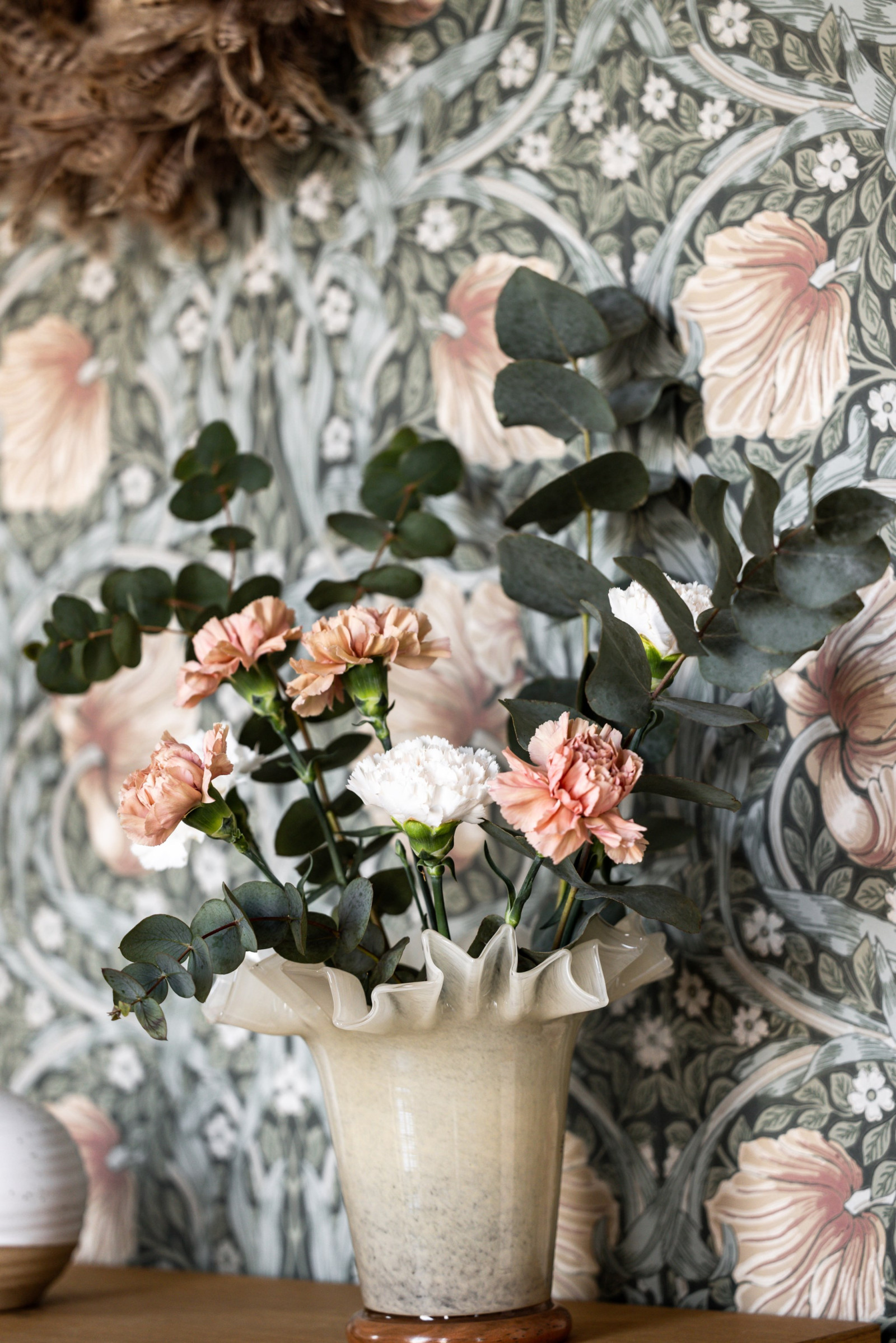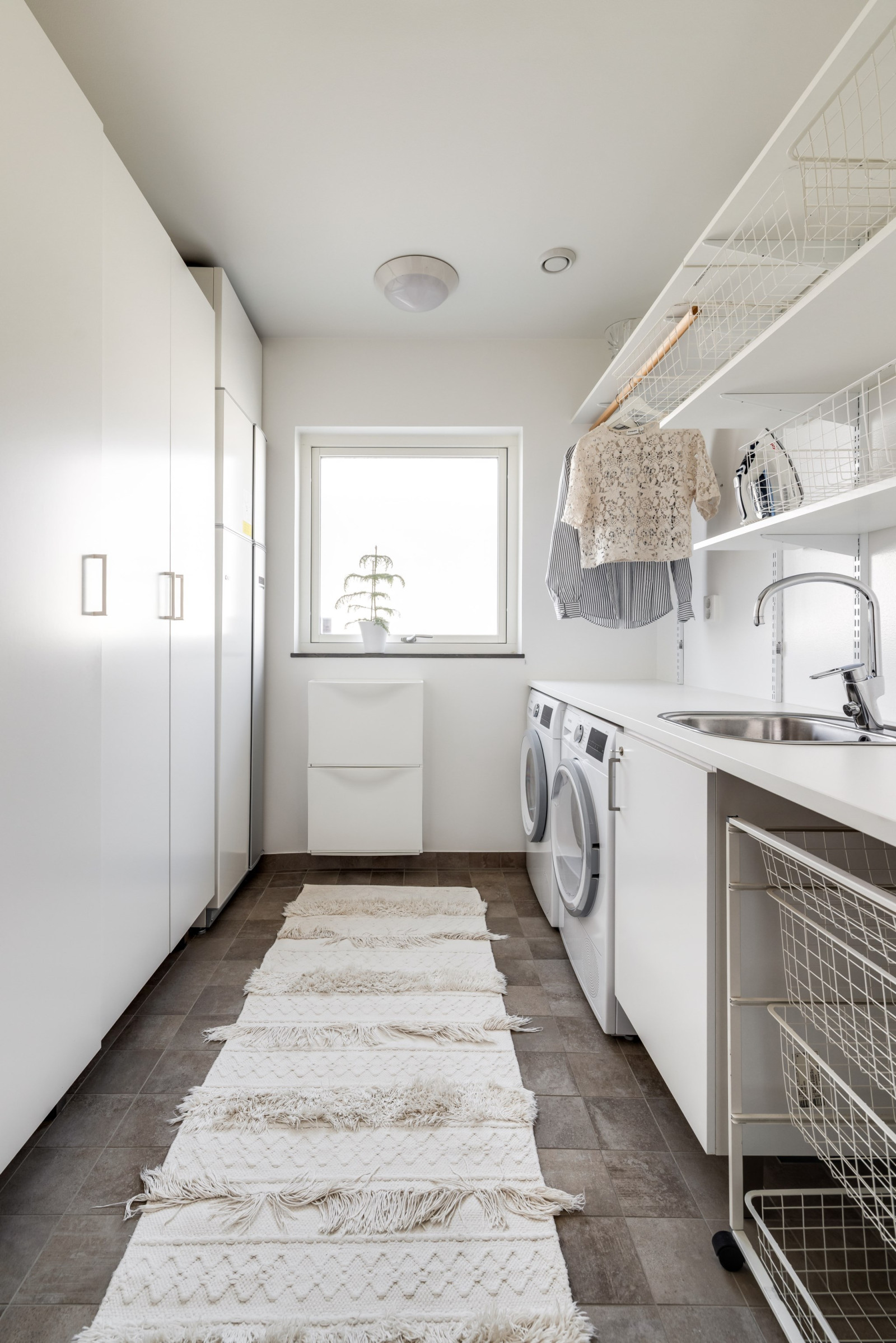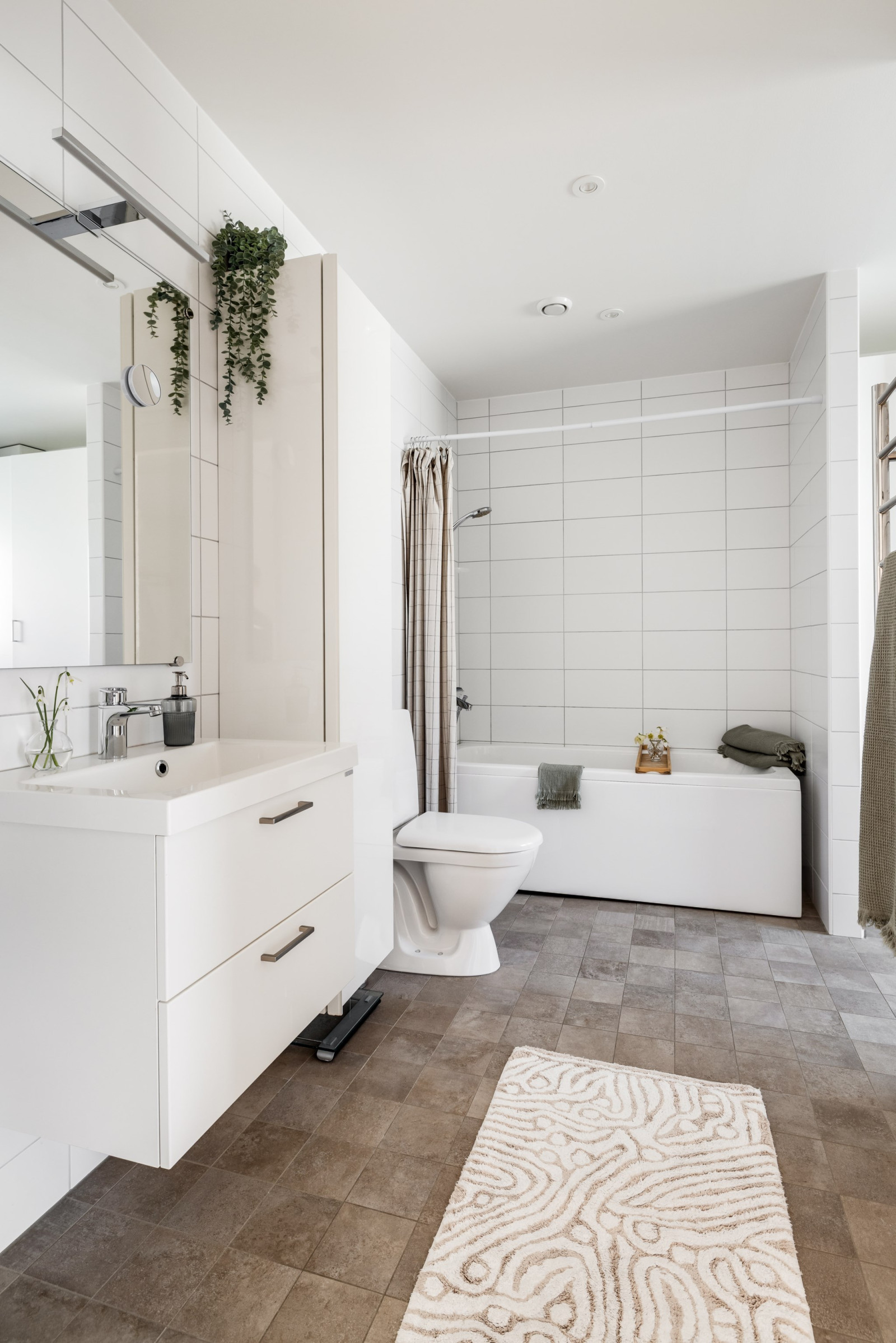 Praktisk yta om 11 kvm. med kakelklädda väggar och klinkergolv i tidlös stil. Badkar, wc och tvättställ. Intill ligger tvättavdelningen med grovvask, arbetsyta, tvättmaskin, torktumlare och förvaring.