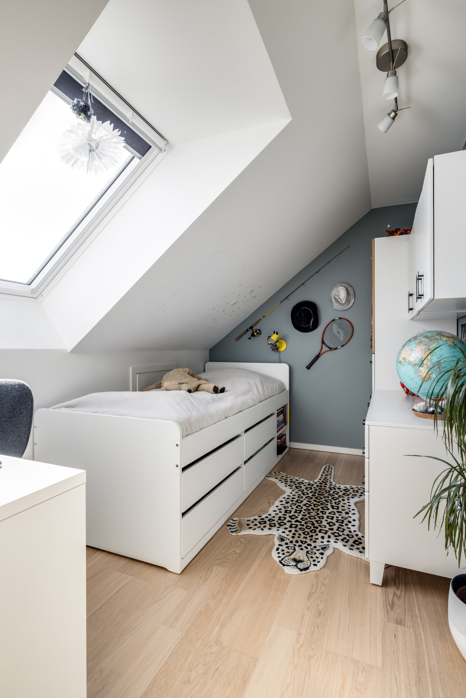 Tre bra sovrum i varierande storlek 14,5 (inklusive garderoben som är avdelad), 8 och 7 kvm. Samtliga med takfönster.