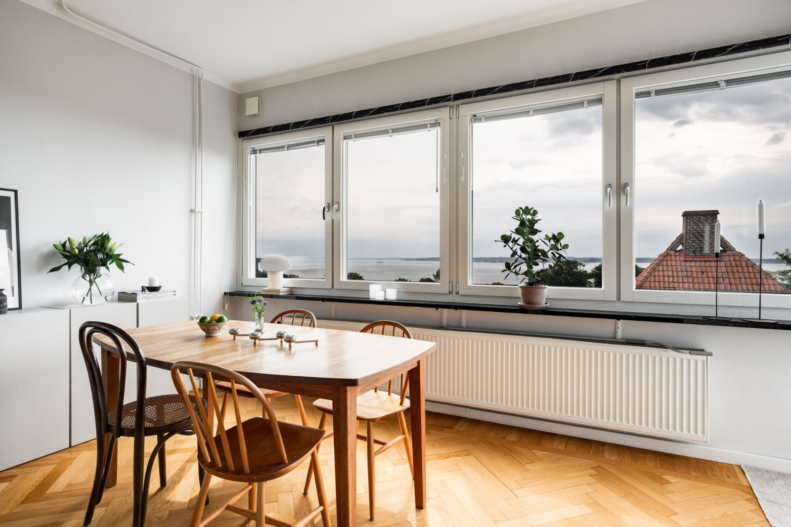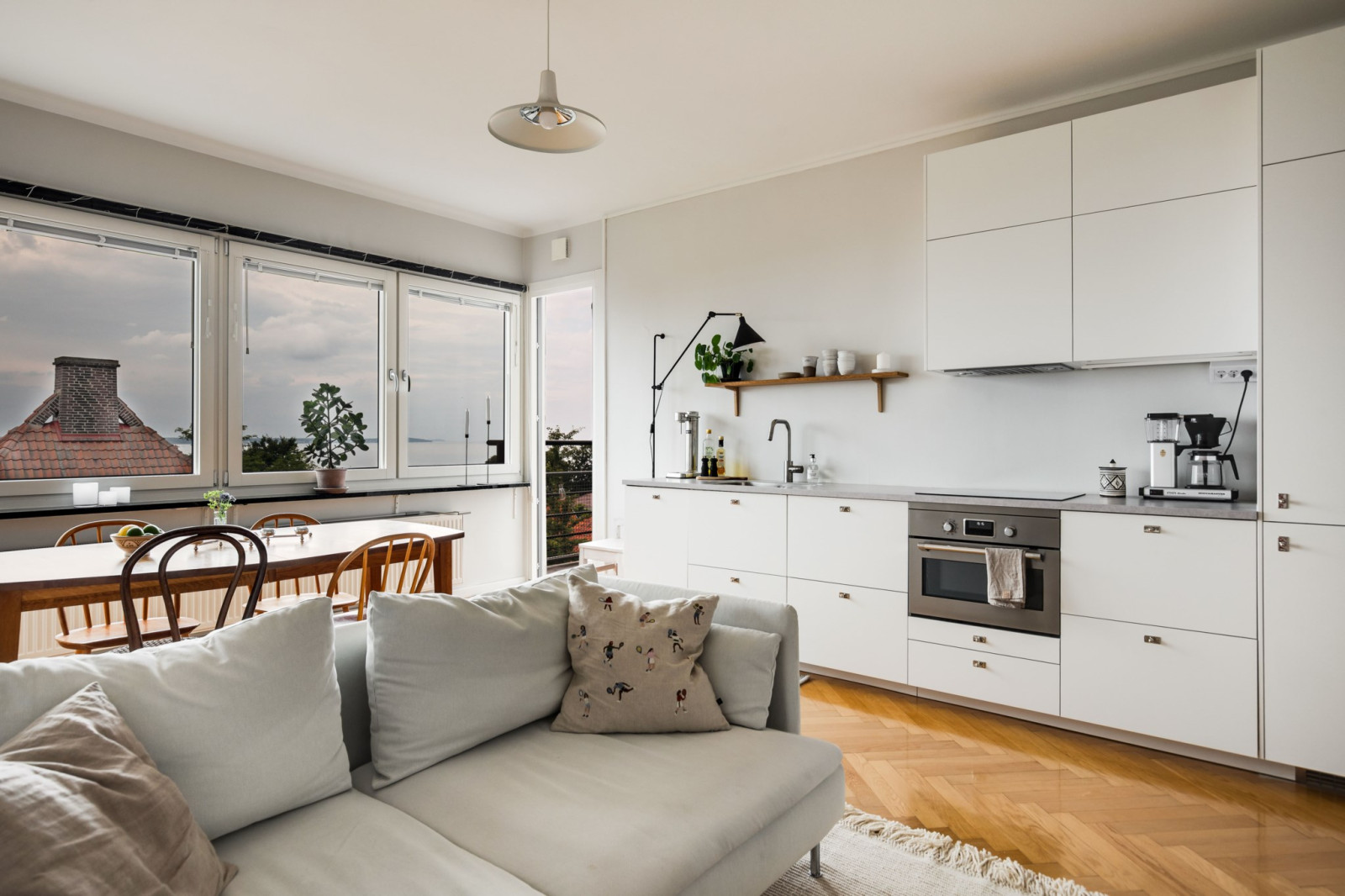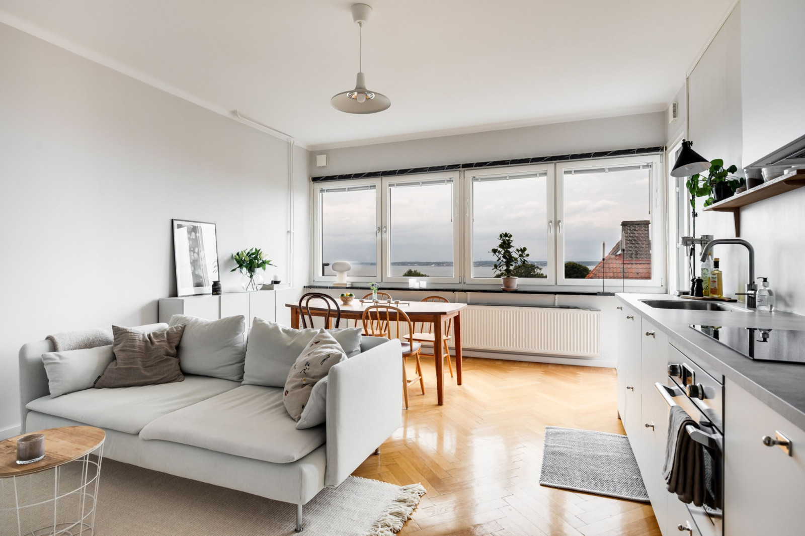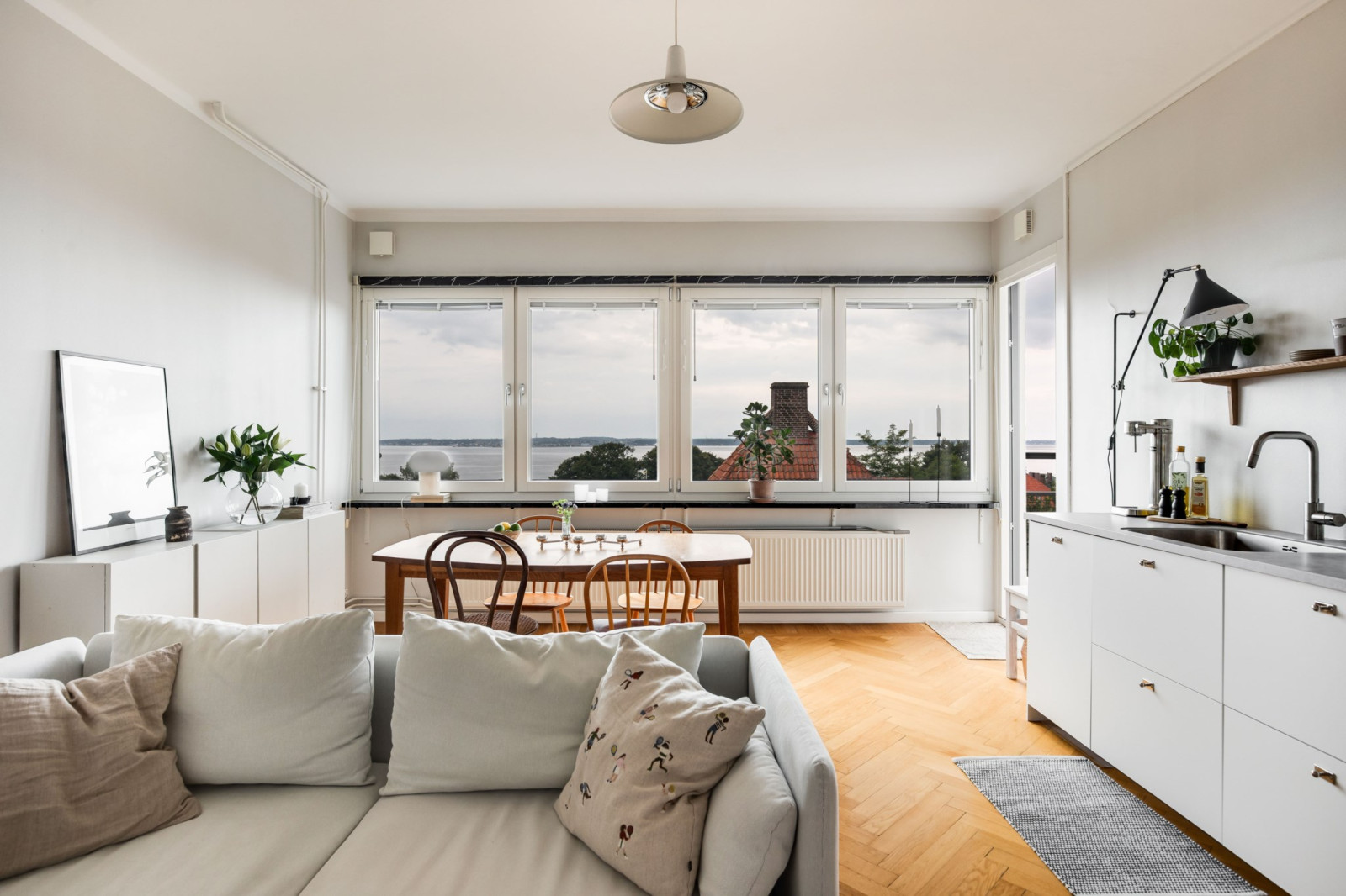Modert planerat med kök och sällskapsyta i öppen planlösning. Nuvarande ägare har flyttat köket till rummet som har fiskbensparkett och plats för både soffgrupp och matplats. Skåpsinredning från Ikea med modern maskinpark. Stora fönster med panoramautsikt över Öresund! Utgång till balkong i västerläge, med samma härliga vy, samt markis.