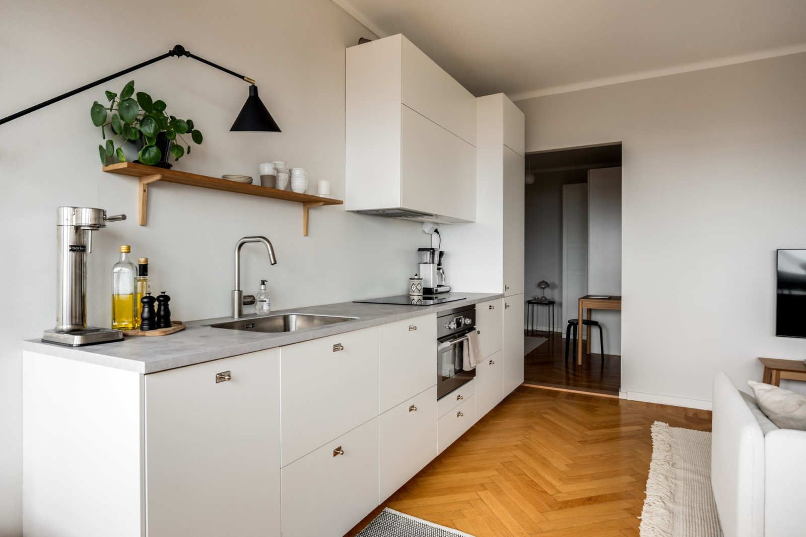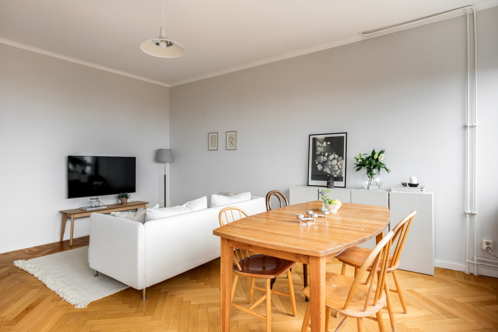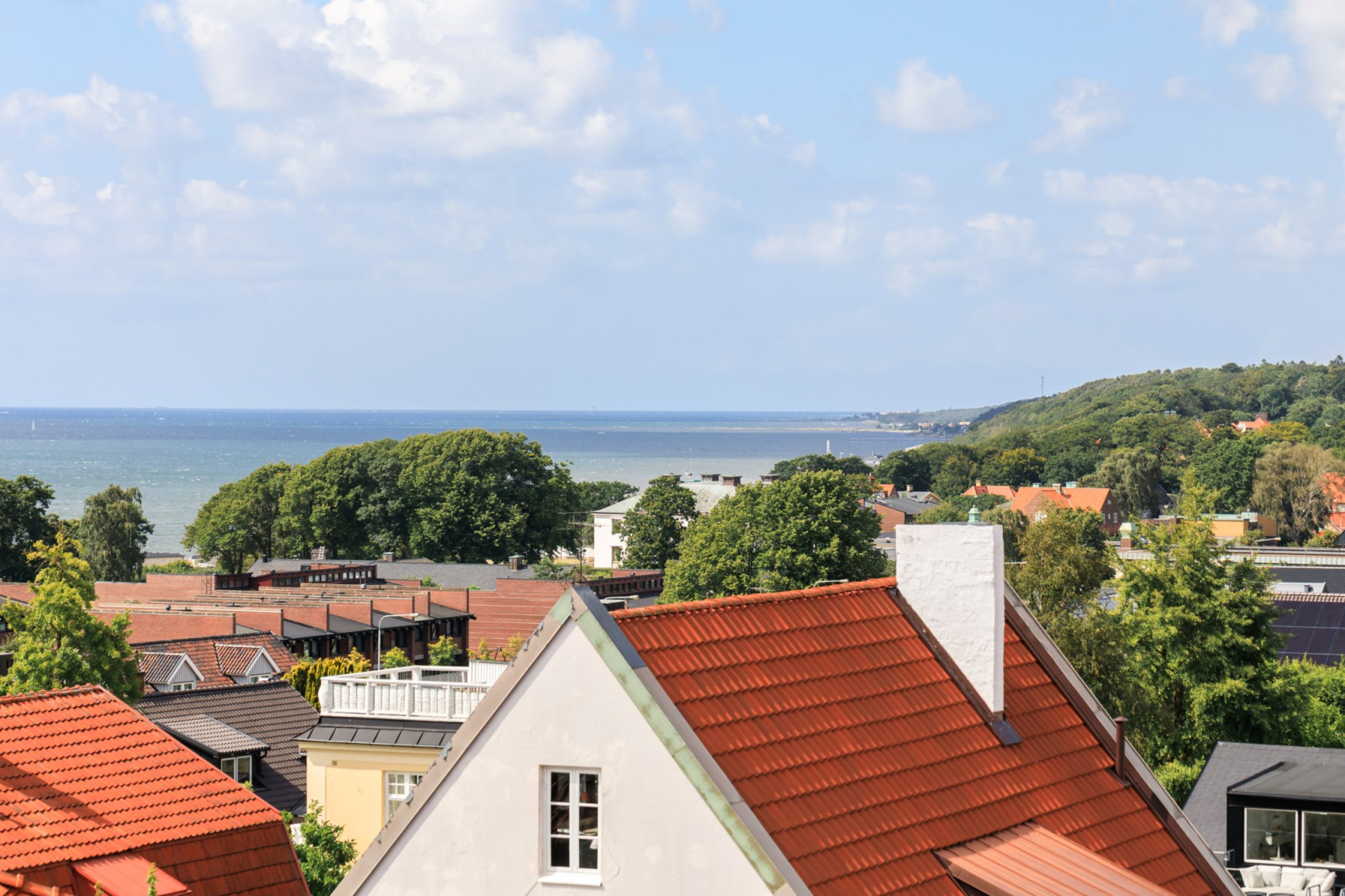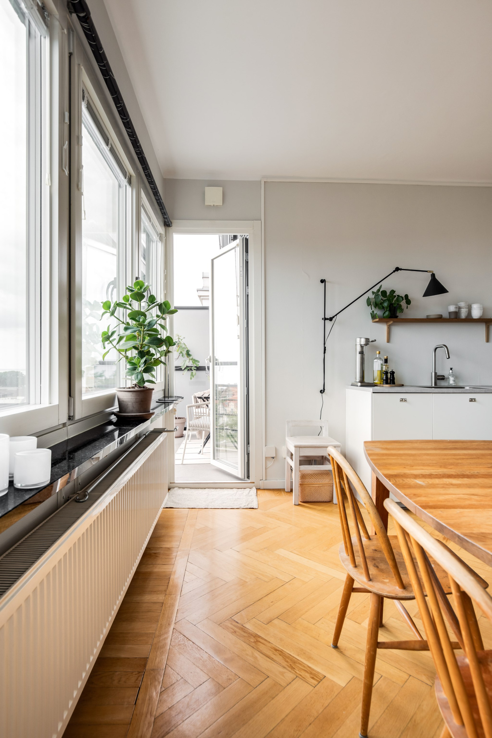 Modert planerat med kök och sällskapsyta i öppen planlösning. Nuvarande ägare har flyttat köket till rummet som har fiskbensparkett och plats för både soffgrupp och matplats. Skåpsinredning från Ikea med modern maskinpark. Stora fönster med panoramautsikt över Öresund! Utgång till balkong i västerläge, med samma härliga vy, samt markis.