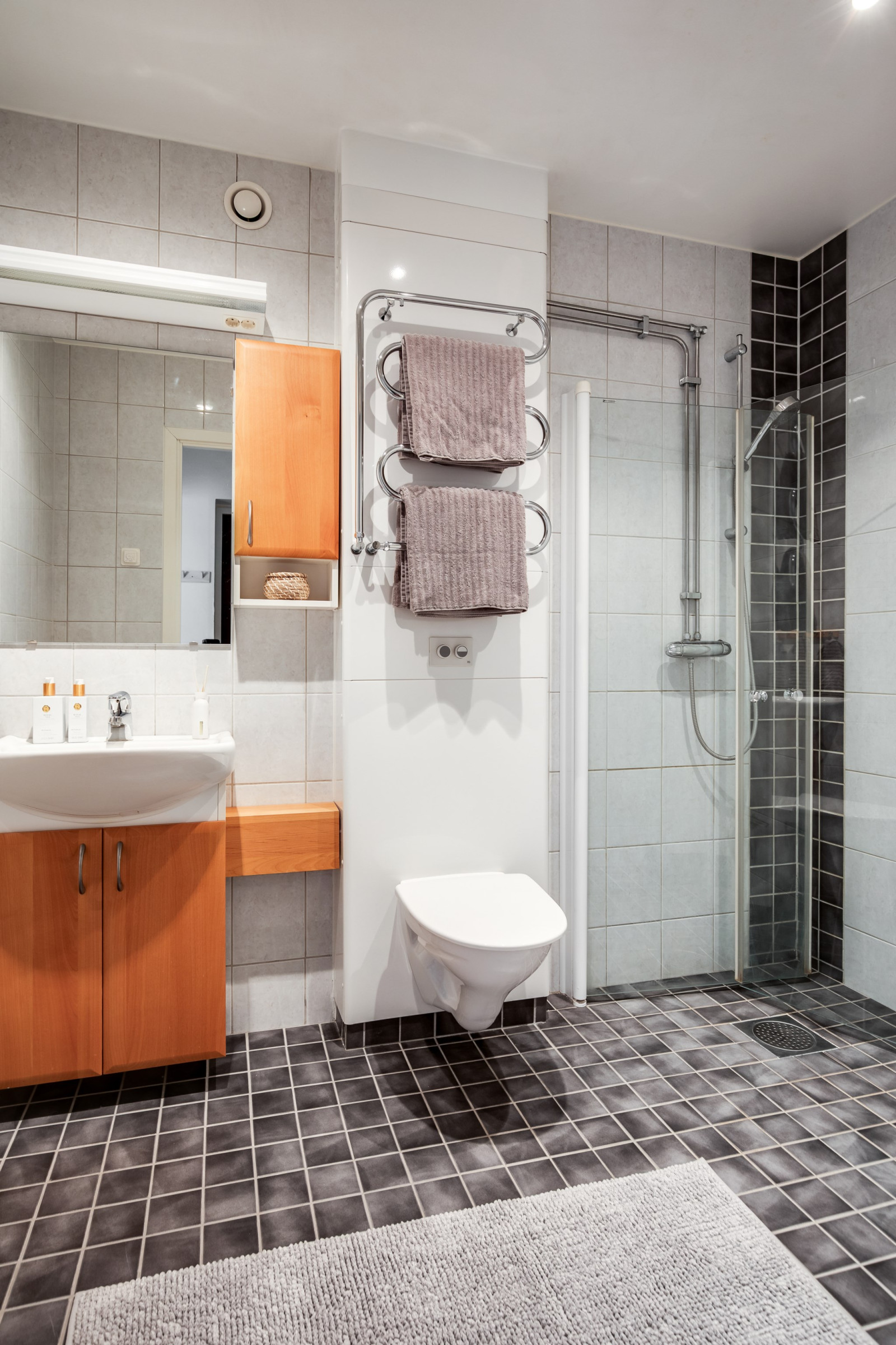 Grå klinkergolv med golvvärme (el) och ljusa helkaklade väggar, samt spotlights i tak. Vask med kommod, dusch med glasvägg, wc och handdukstork. Det finns fördraget för tvättmaskin.