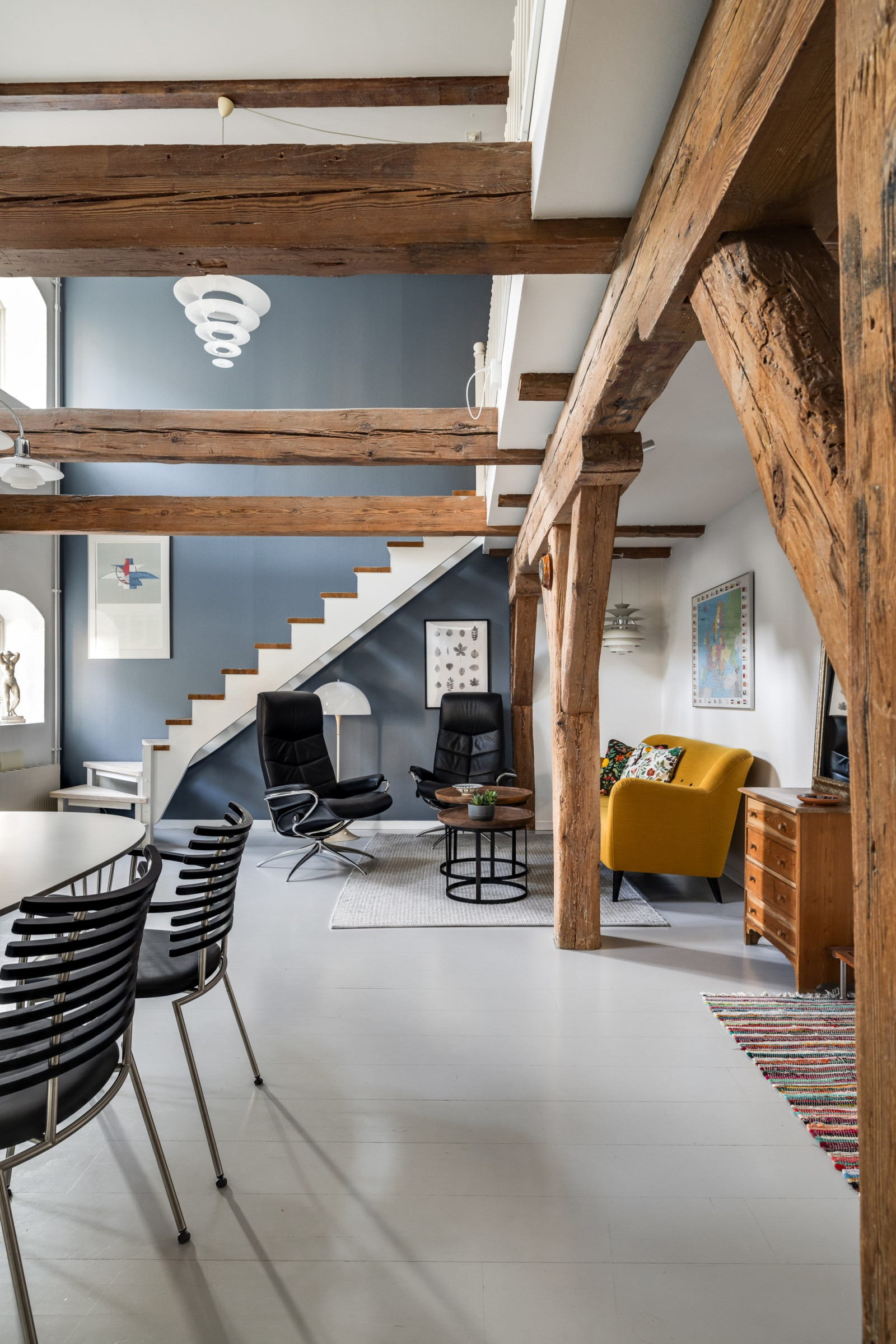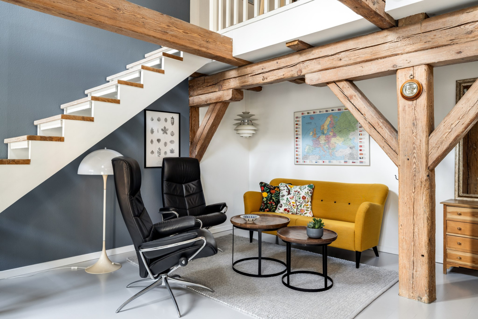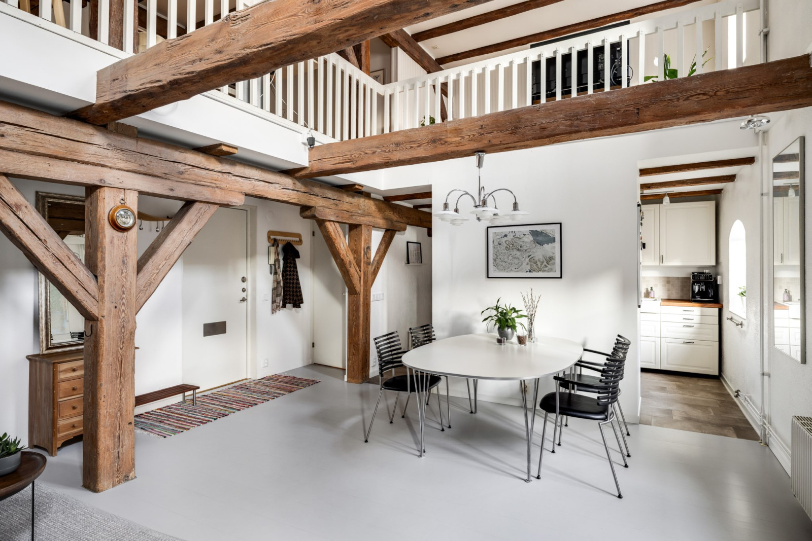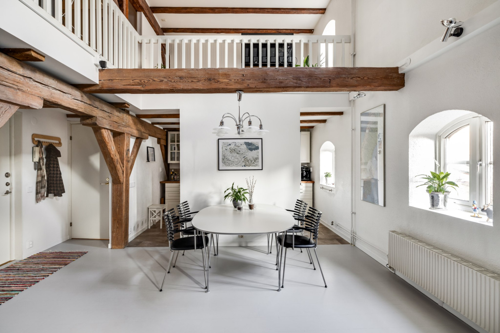 Lägenheten är belägen högt upp i huset och bjuder på en genomtänkt planlösning i två plan. På entréplanet möts du av ett luftigt vardagsrum med matplats och generös takhöjd, öppet till övre plan med synliga takbjälkar. Det nyrenoverade lantliga köket passar perfekt med husets karaktär. I anslutning till hallen finns en gäst-wc.