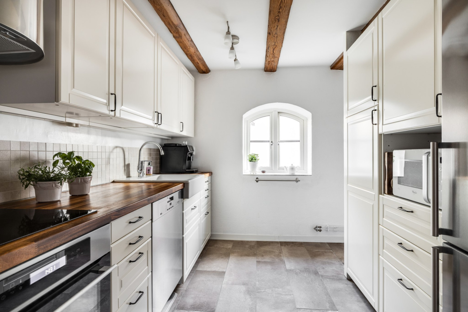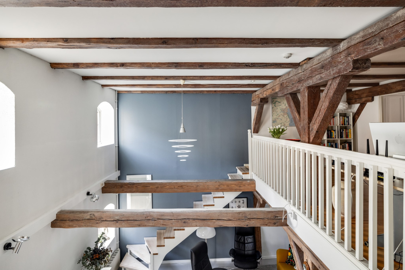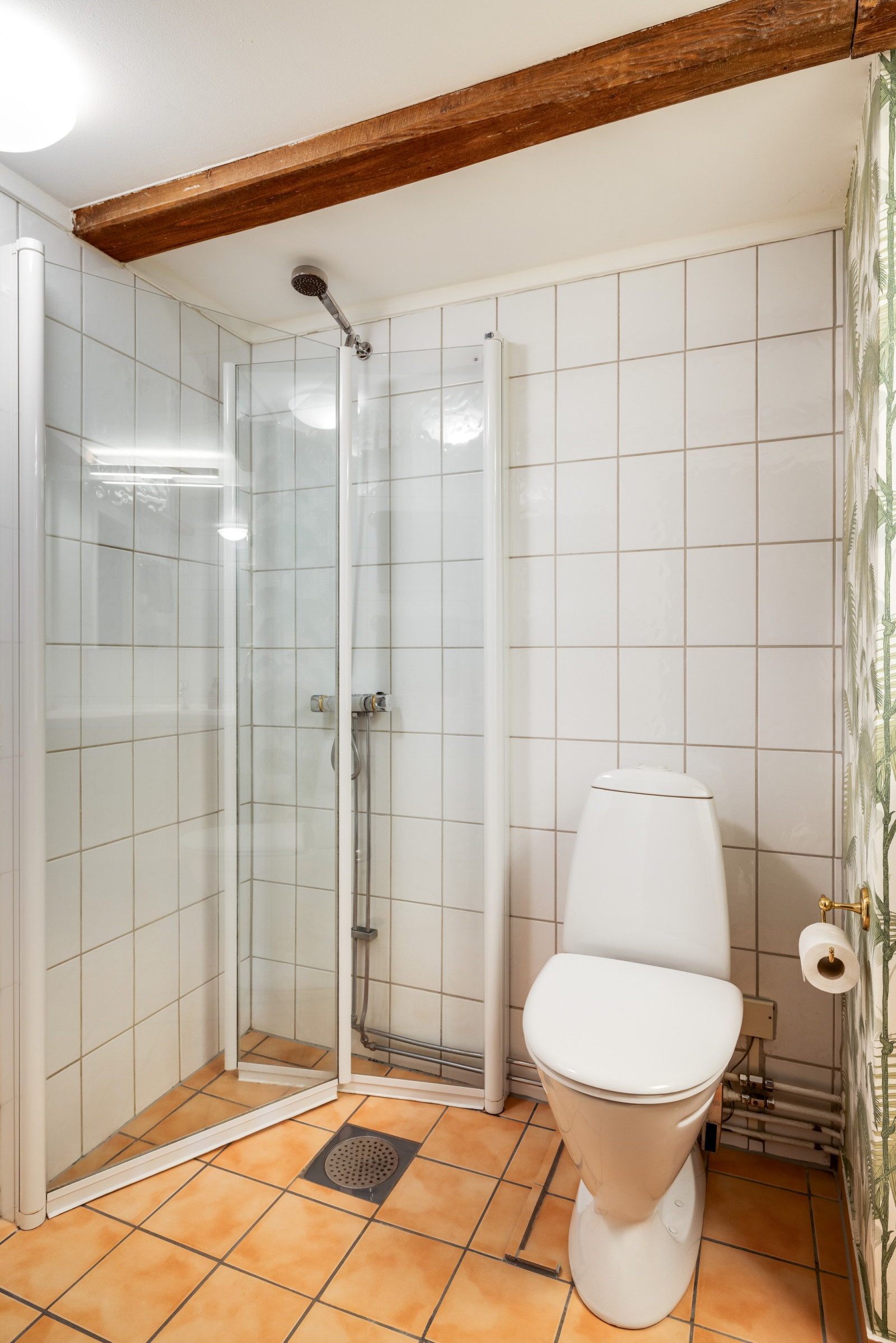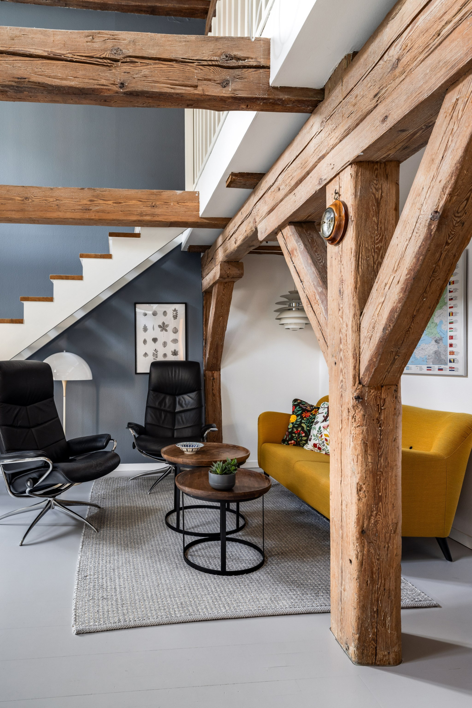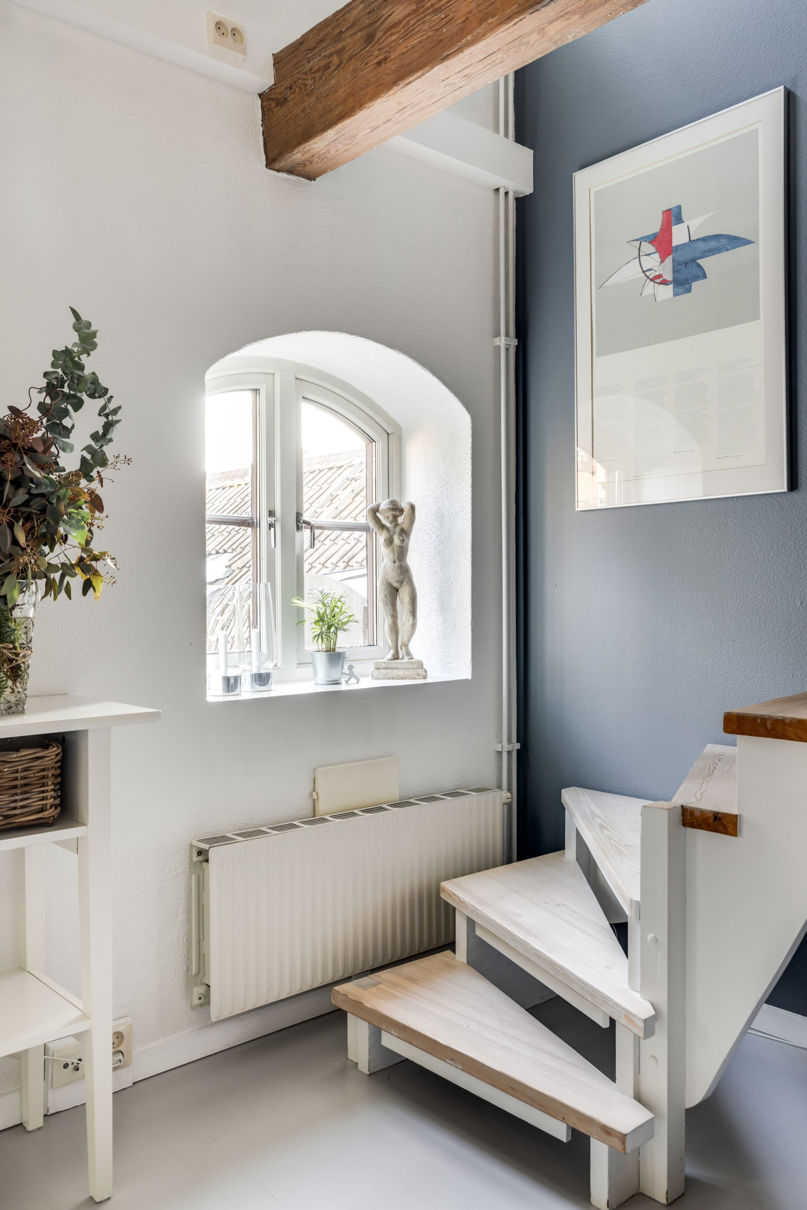 Lägenheten är belägen högt upp i huset och bjuder på en genomtänkt planlösning i två plan. På entréplanet möts du av ett luftigt vardagsrum med matplats och generös takhöjd, öppet till övre plan med synliga takbjälkar. Det nyrenoverade lantliga köket passar perfekt med husets karaktär. I anslutning till hallen finns en gäst-wc.