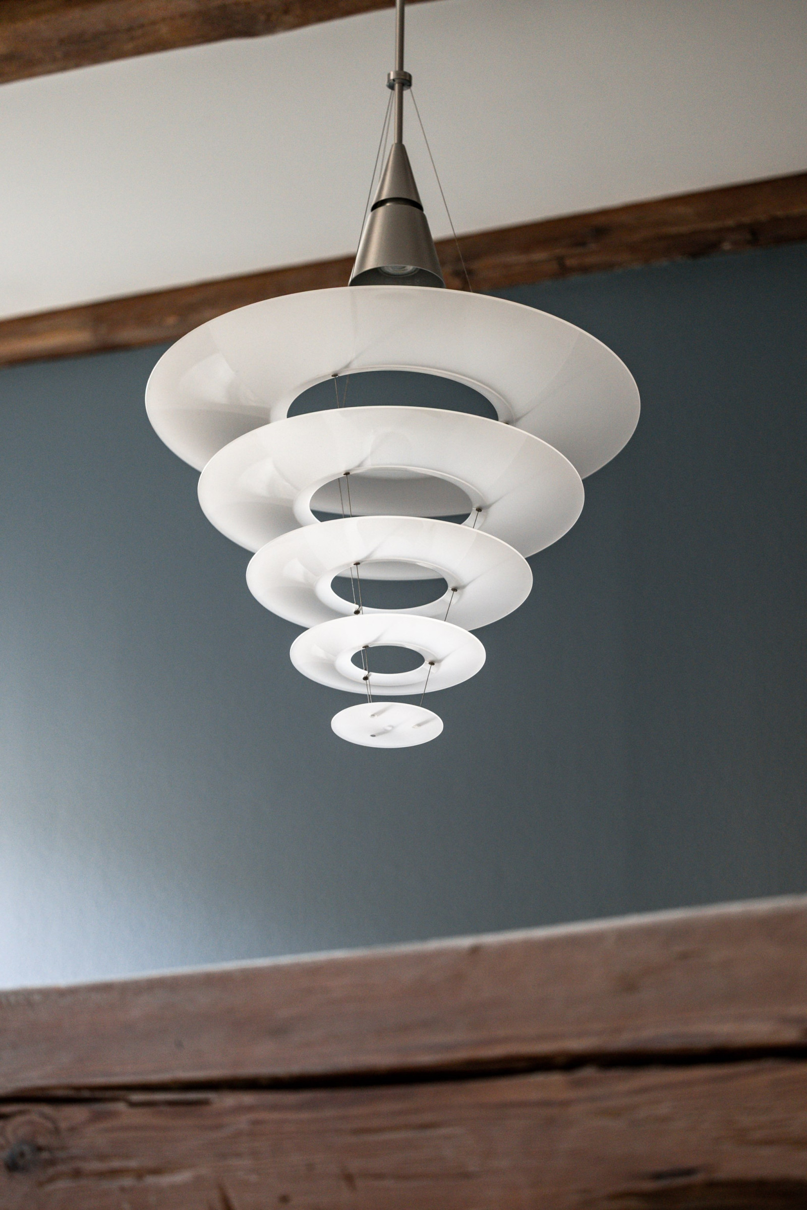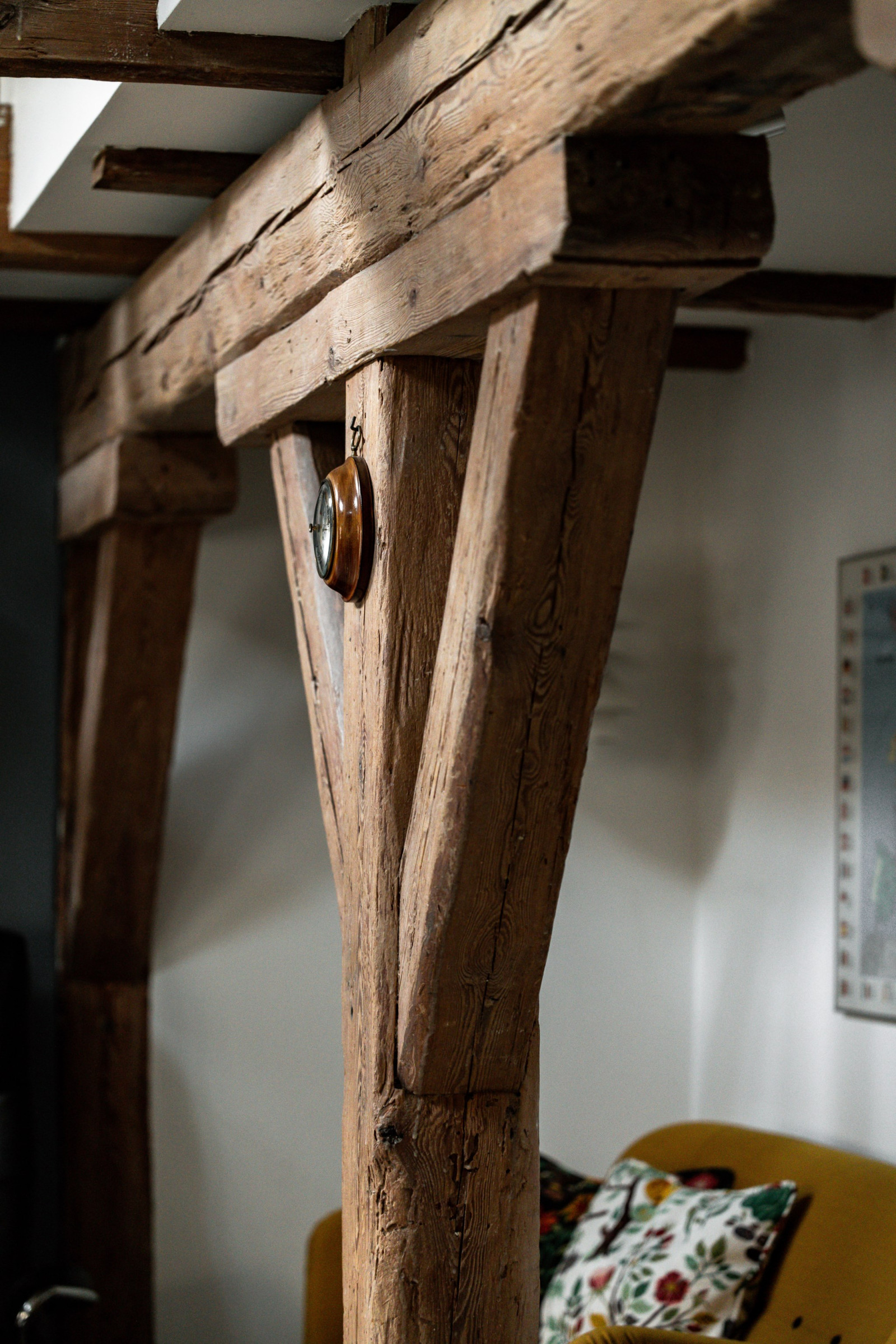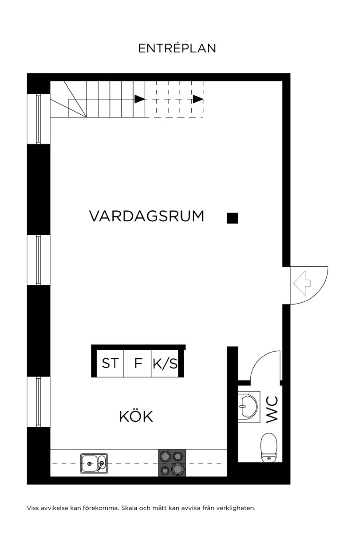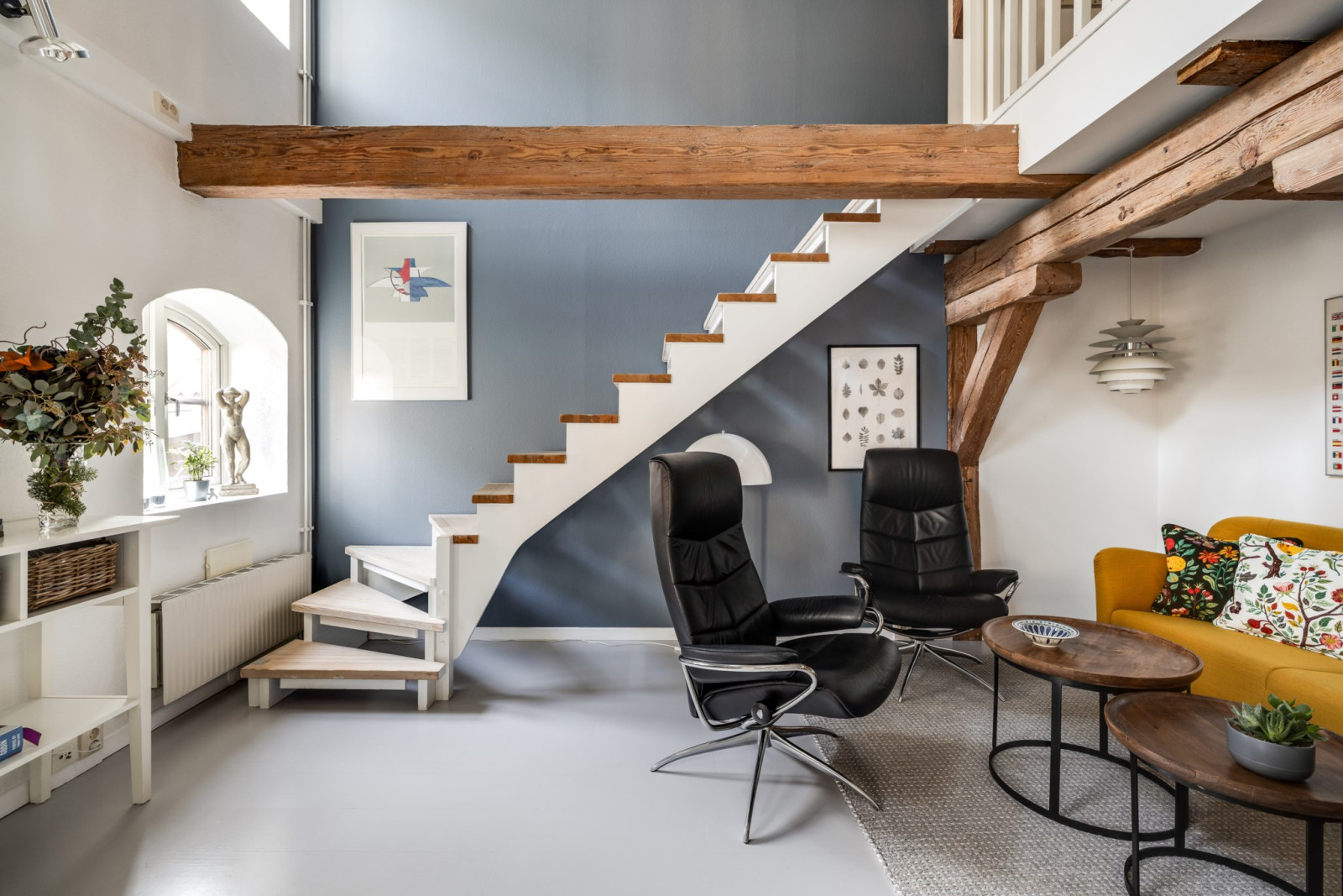 Lägenheten är belägen högt upp i huset och bjuder på en genomtänkt planlösning i två plan. På entréplanet möts du av ett luftigt vardagsrum med matplats och generös takhöjd, öppet till övre plan med synliga takbjälkar. Det nyrenoverade lantliga köket passar perfekt med husets karaktär. I anslutning till hallen finns en gäst-wc.