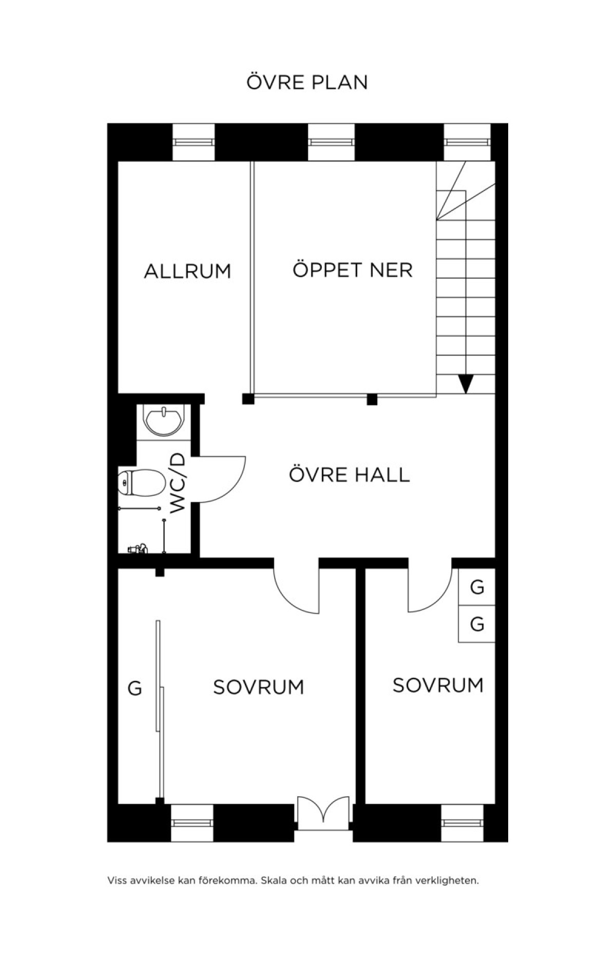 En stilren trappa leder upp till övre plan, som rymmer två sovrum, möblerbar hall/ arbetsrum, samt mindre allrum och ett badrum. Här uppe finns lugnet och en trivsam känsla av rymd tack vare den öppna planlösningen mot våningen nedanför.
