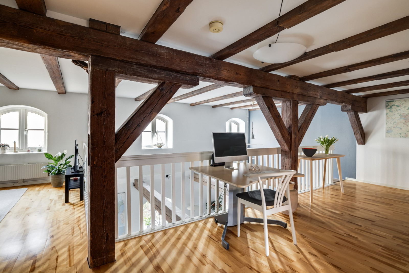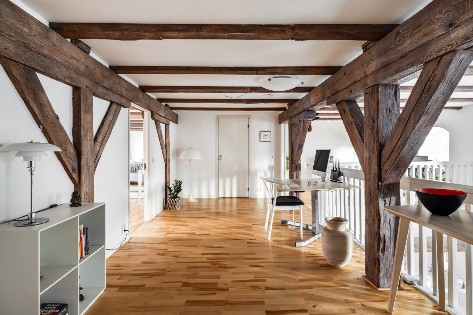 Parkettgolv och synliga bjälkar, öppet ner mot vardagsrum. Denna yta är möjlig att avdela till ett sovrum.