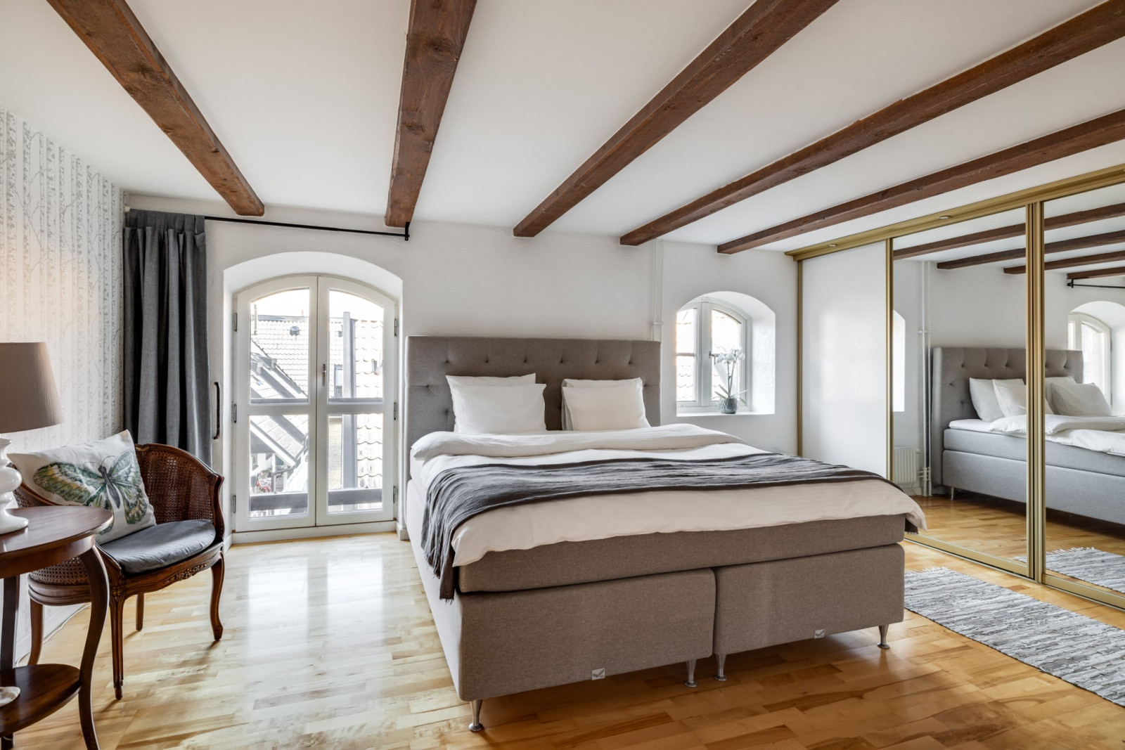 Stort sovrum, möjligt att avdela till två. Parkettgolv, synliga bjälkar och hel garderobsvägg med skjutdörrar. Fransk balkong.