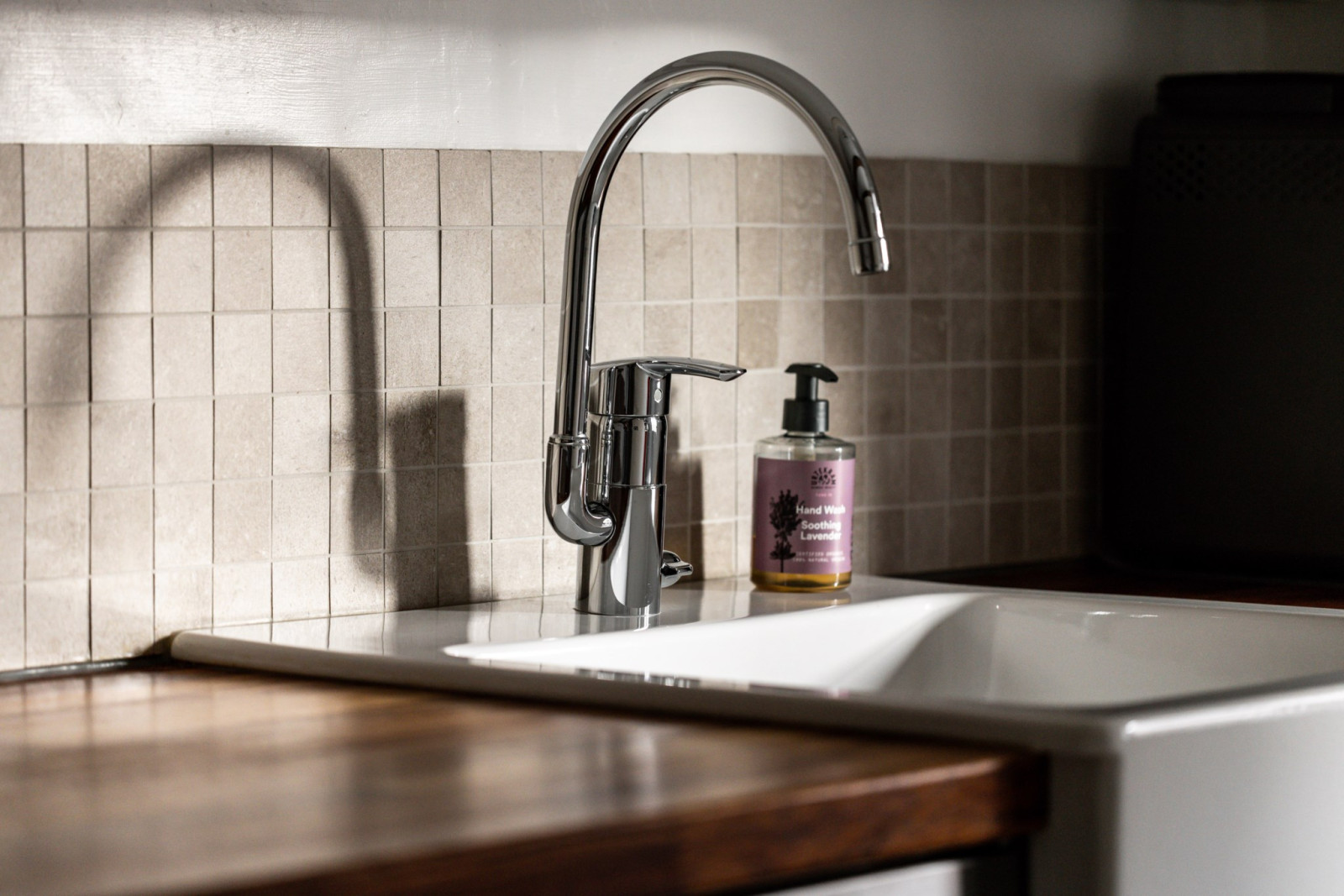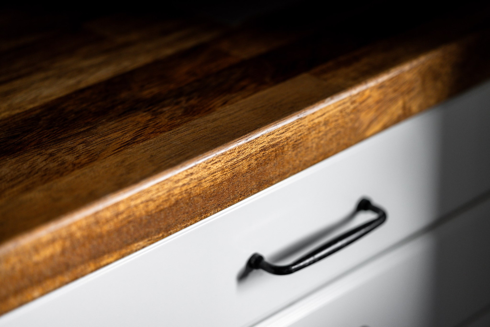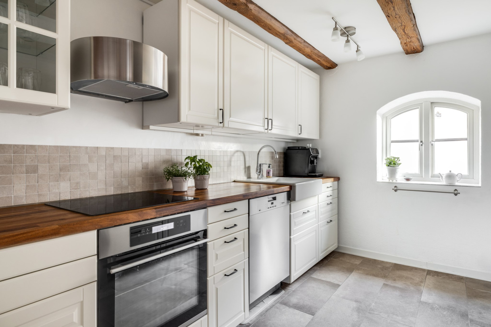 Vitt kök från IKEA (2017) med bänkskivor i massiv ek. Maskinell utrustning från Siemens bestående av inbyggnadsugn, induktionshäll, fläkt, diskmaskin och kyl/frys.