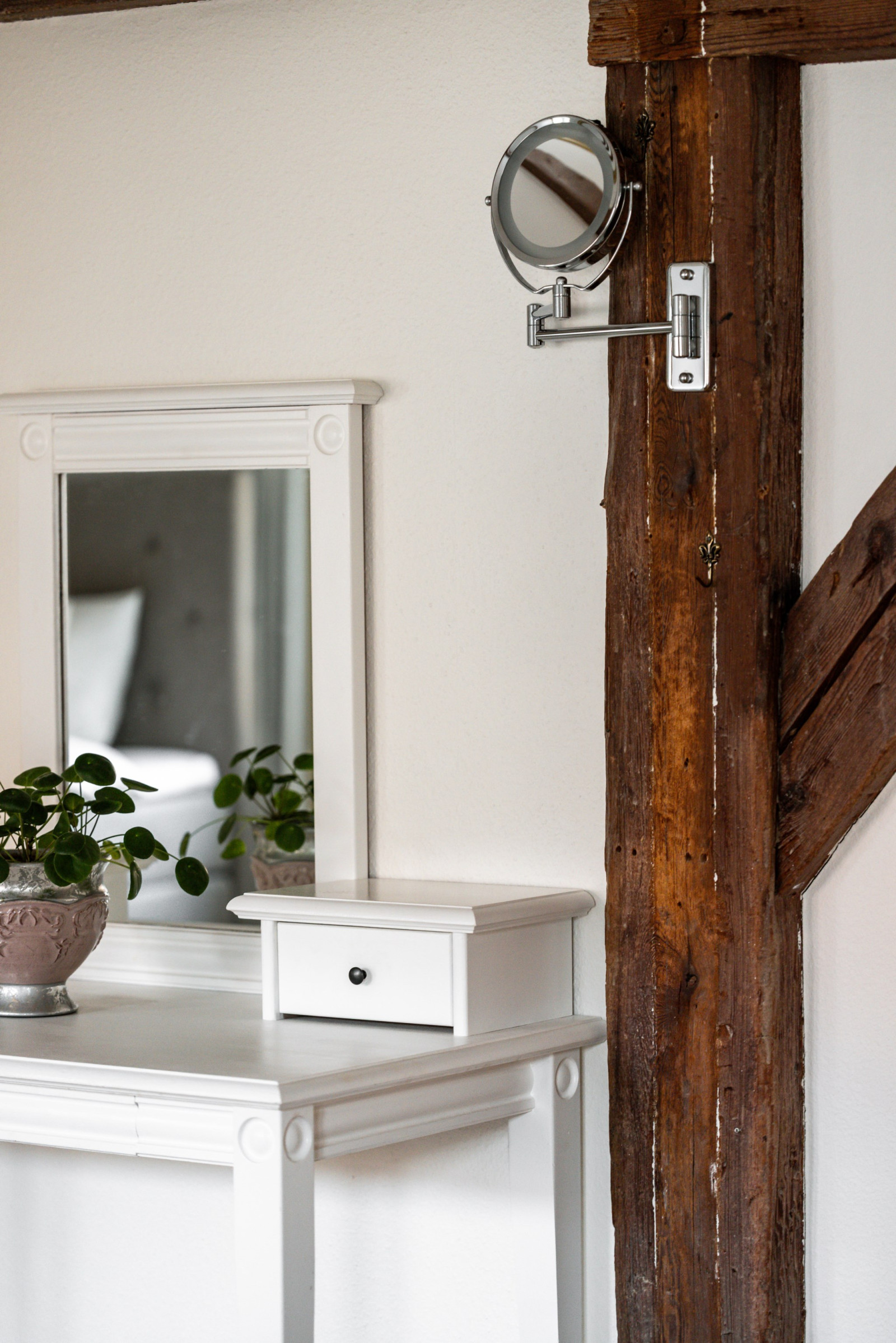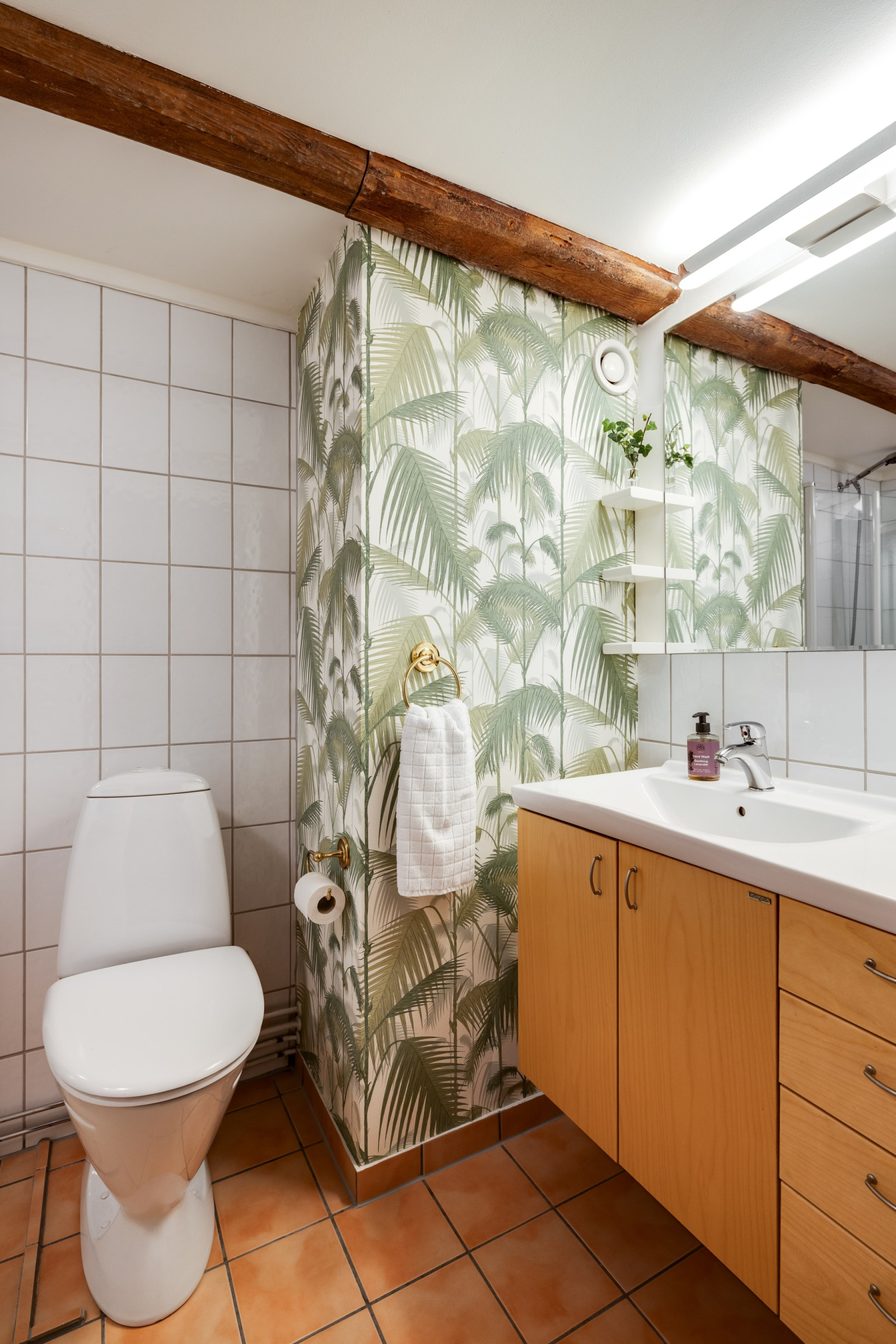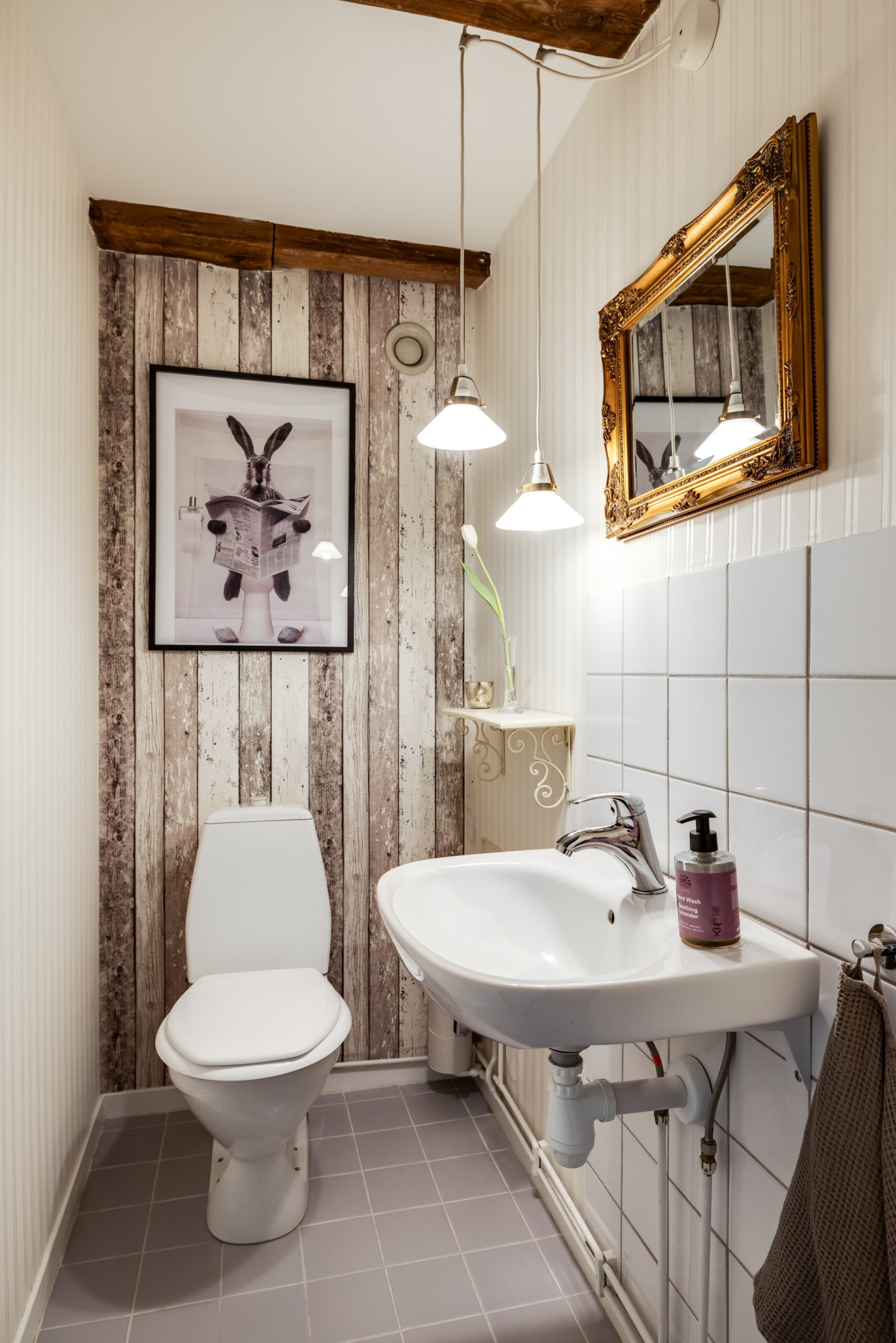 Klinkergolv, wc och handfat med kommod och badrumsskåp. Tapet, spegel, belysning och synliga bjälkar.