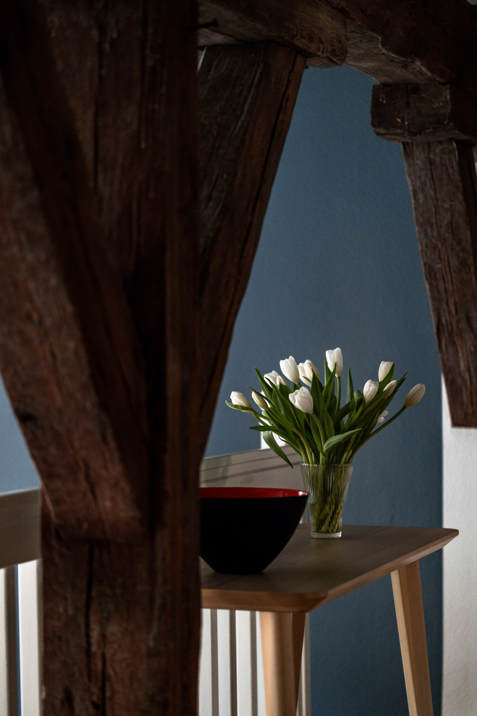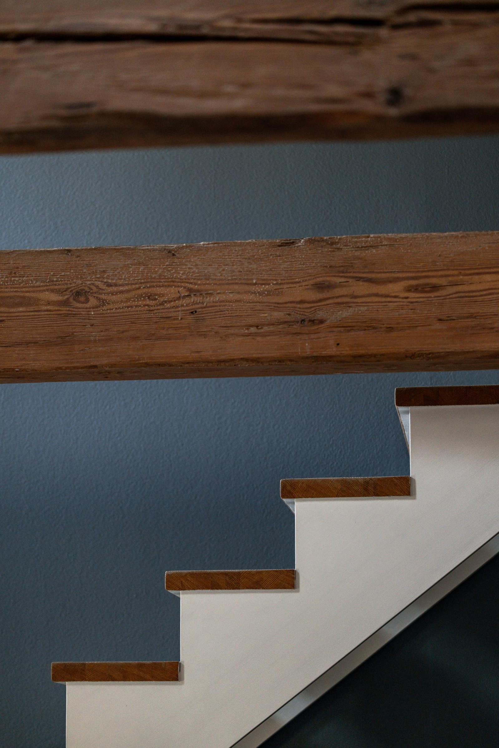 Målat trägolv, synliga bjälkar och öppet upp mot övre plan. Stilren trätrappa.
