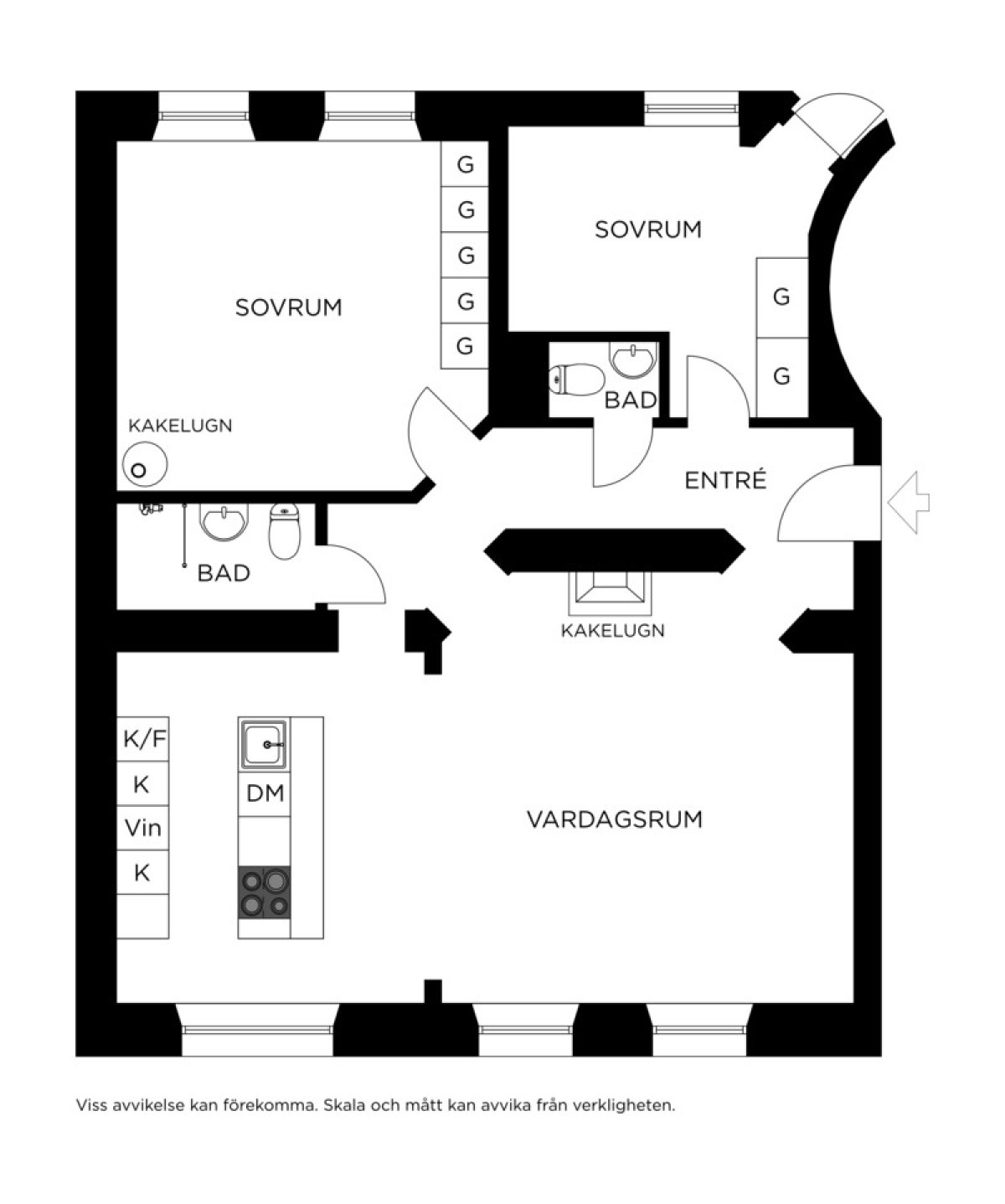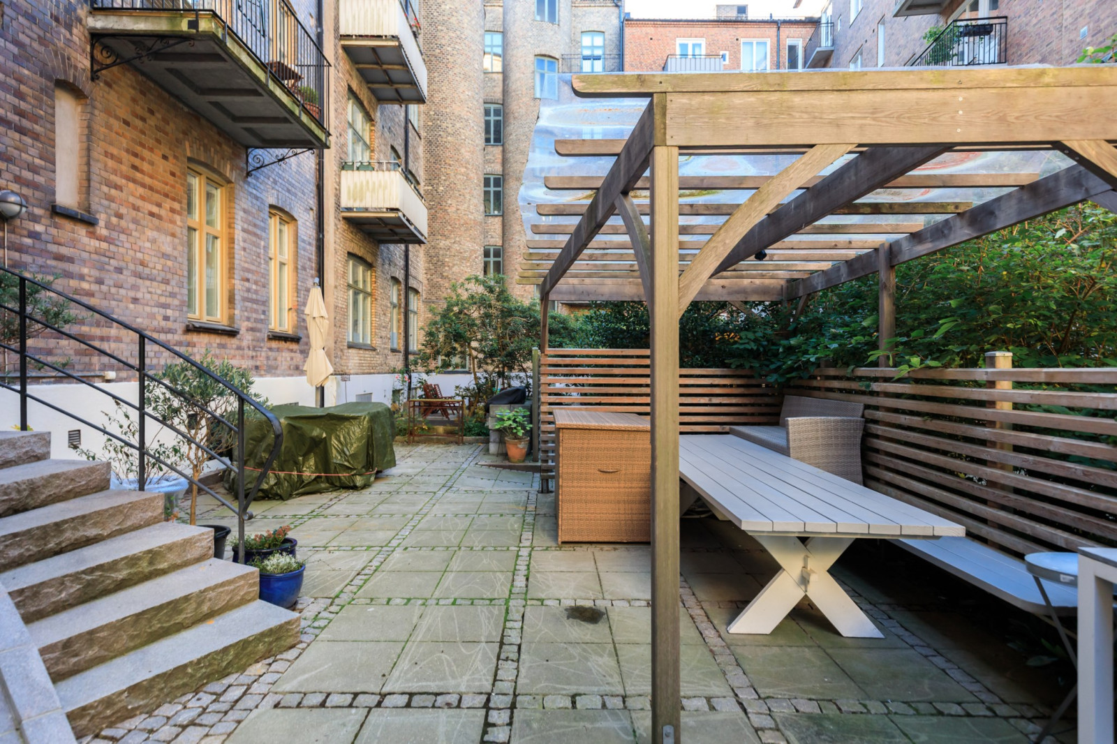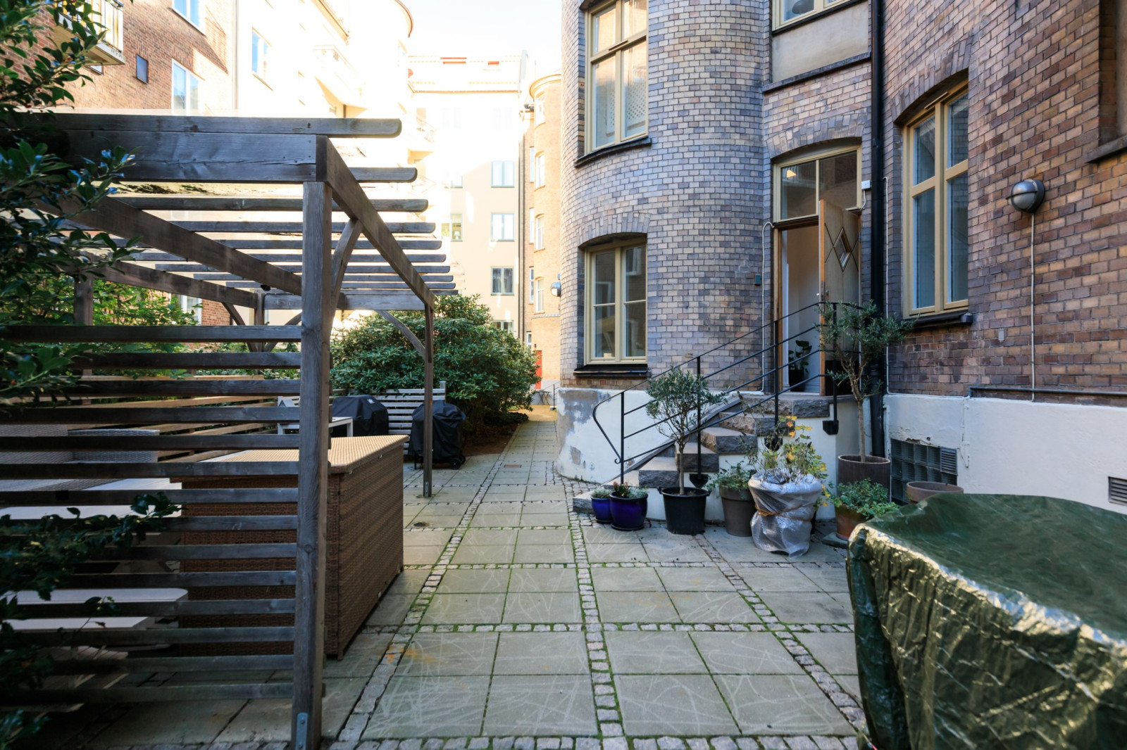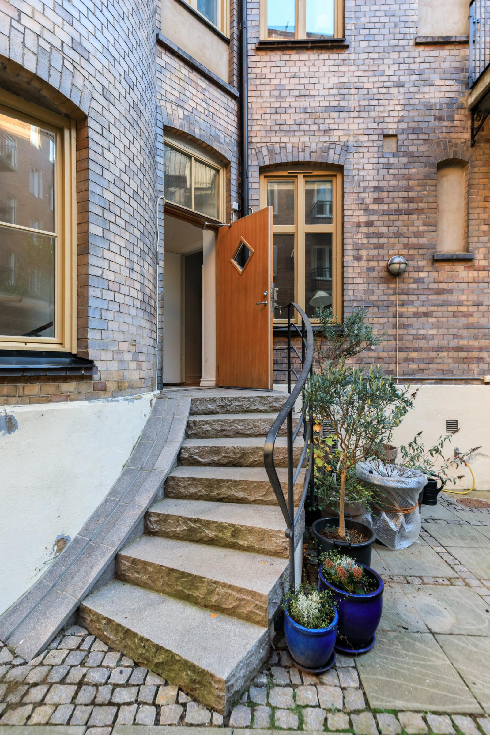 med separat ingång/utgång till gemensamma uteplatser på innergården , vitlaserad 1-stavsparkett samt garderober