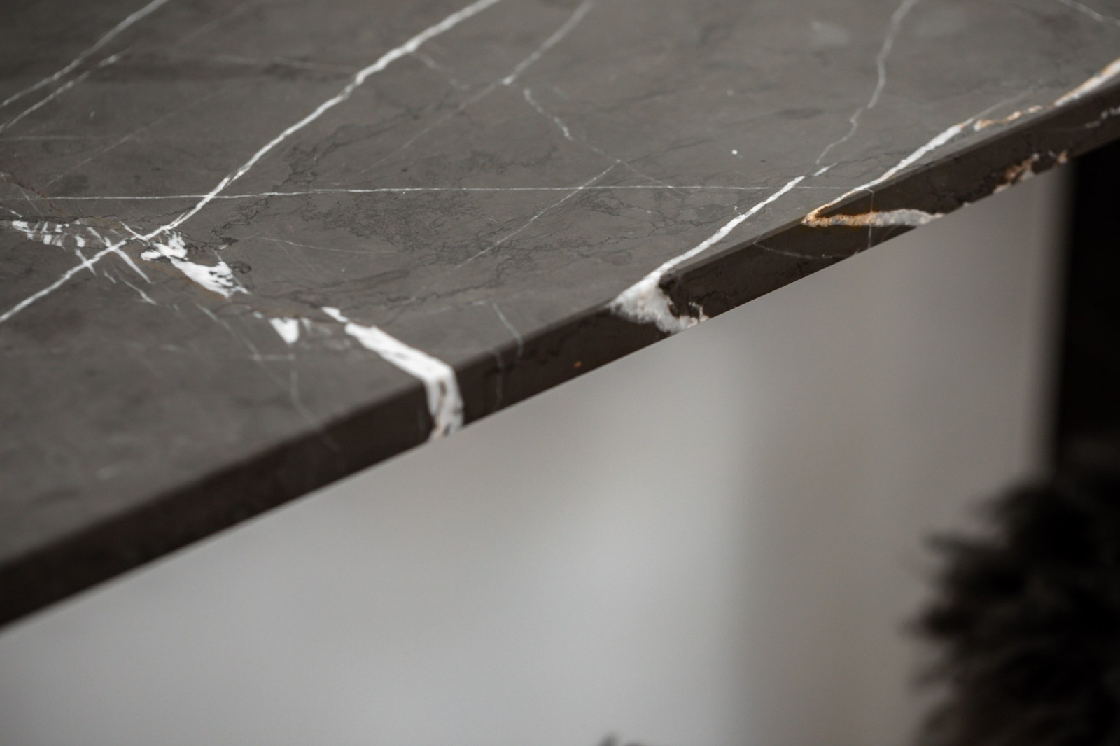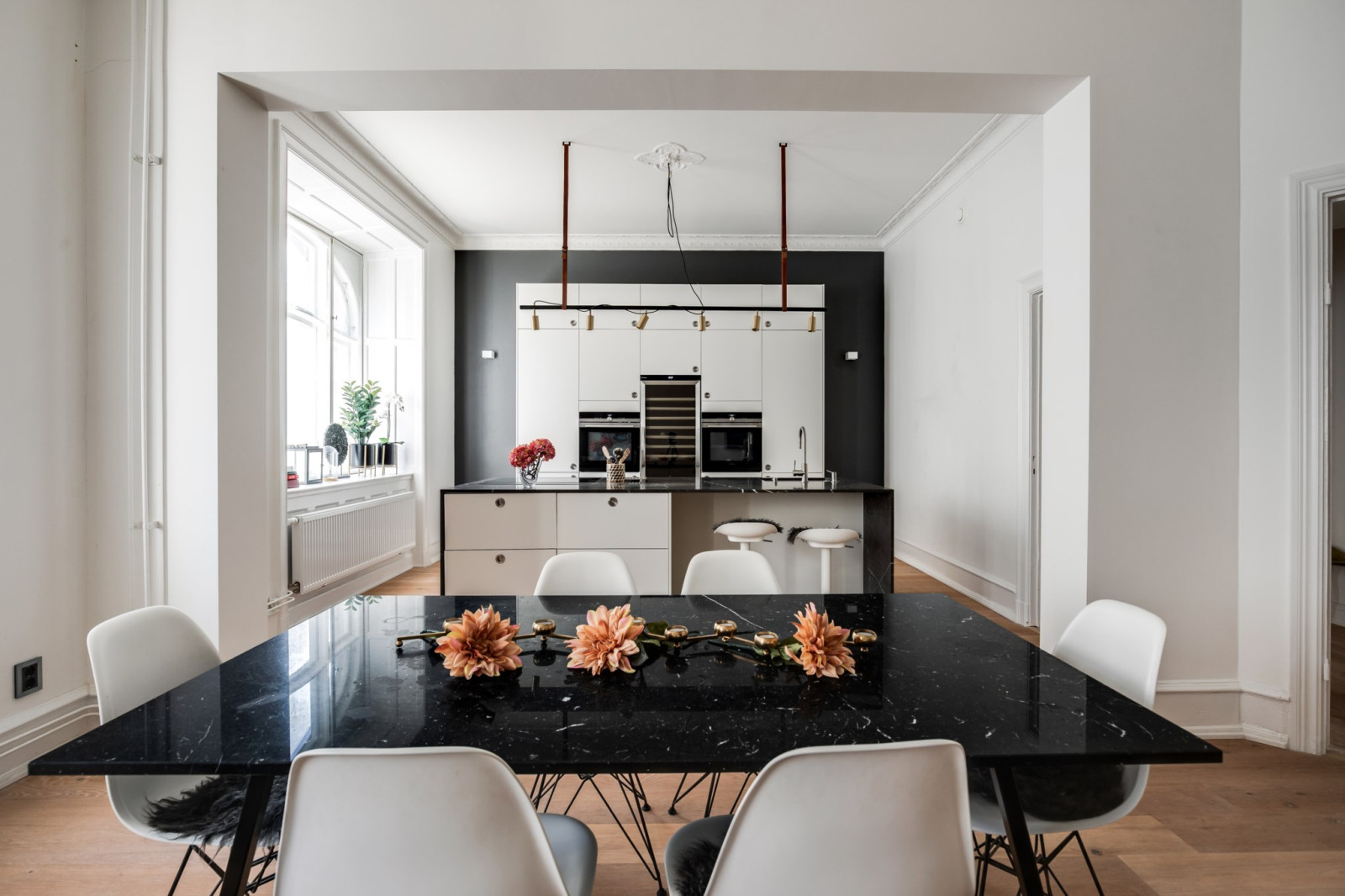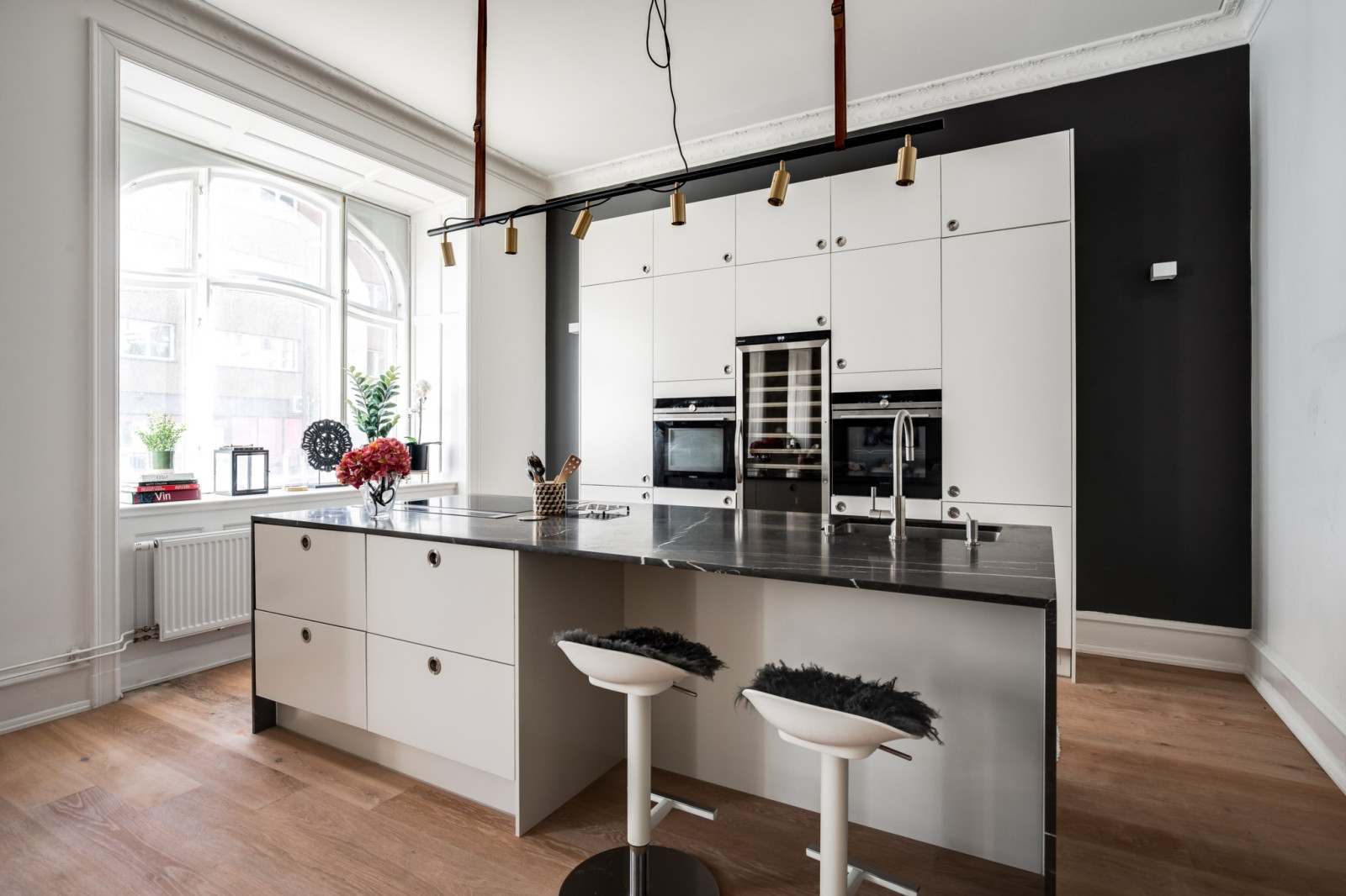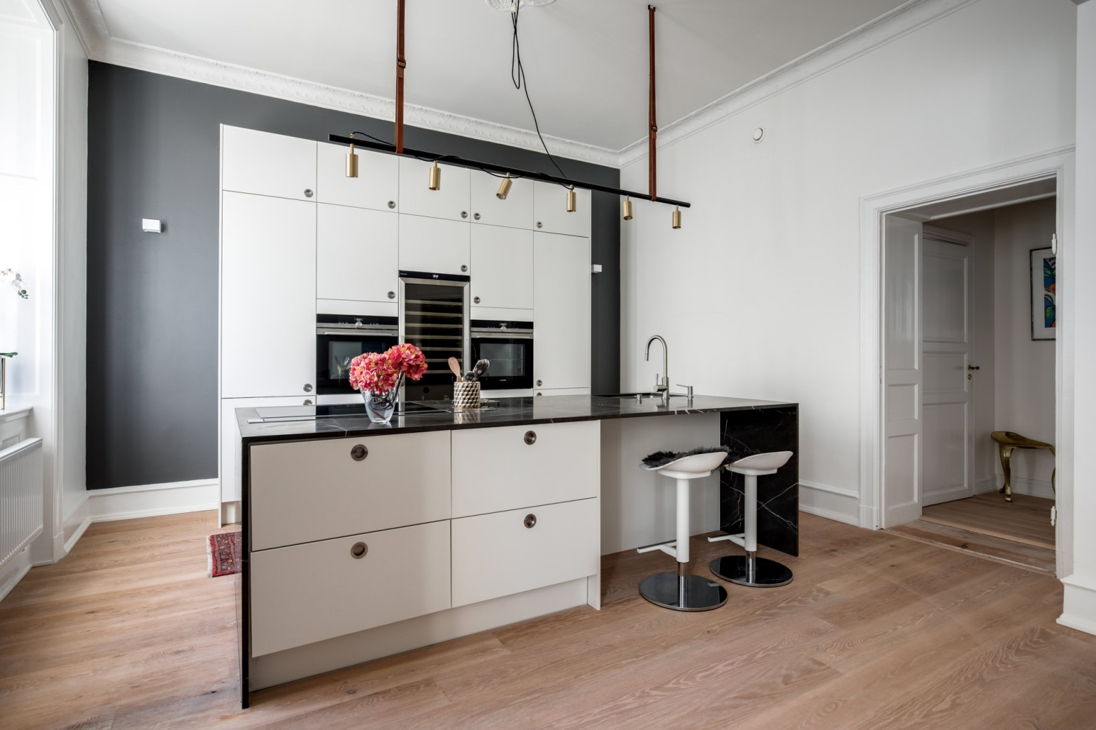 med vita luckor, köks-ö med bänkskiva och gavlar av exklusiv 20 mm grå marmor i helt stycke. Två varmluftsugnar (2016), extra bred induktionshäll (2016), bänkintegrerad fläkt (2016), integrerad diskmaskin (2016), kyl (2016), frys (2016), vinkyl (2016). Takstuckaturer, takrosett och integrerad belysning på vägg