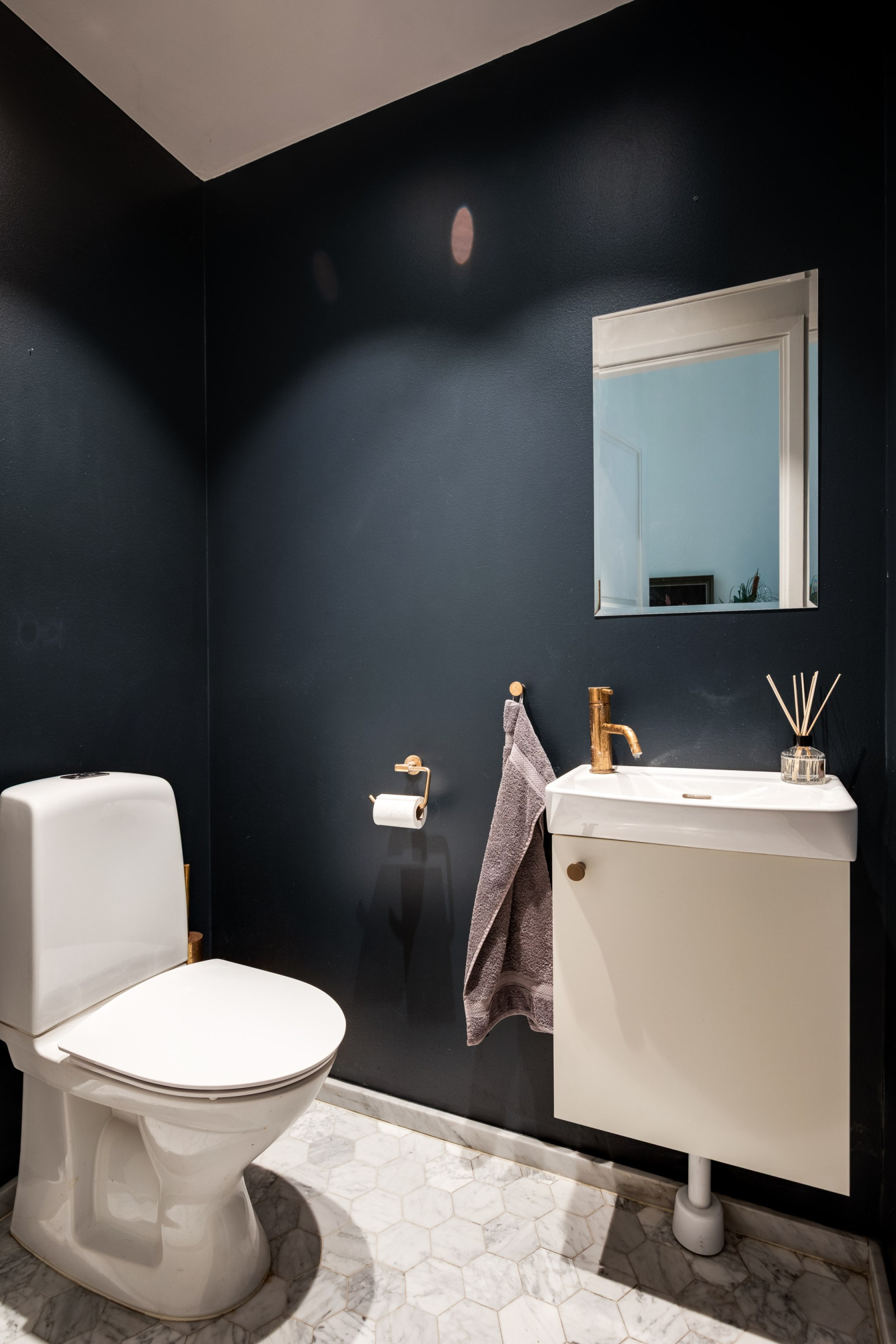 med hexagonskuret Cararra Marmor på golv, handfat med kommod, toalett