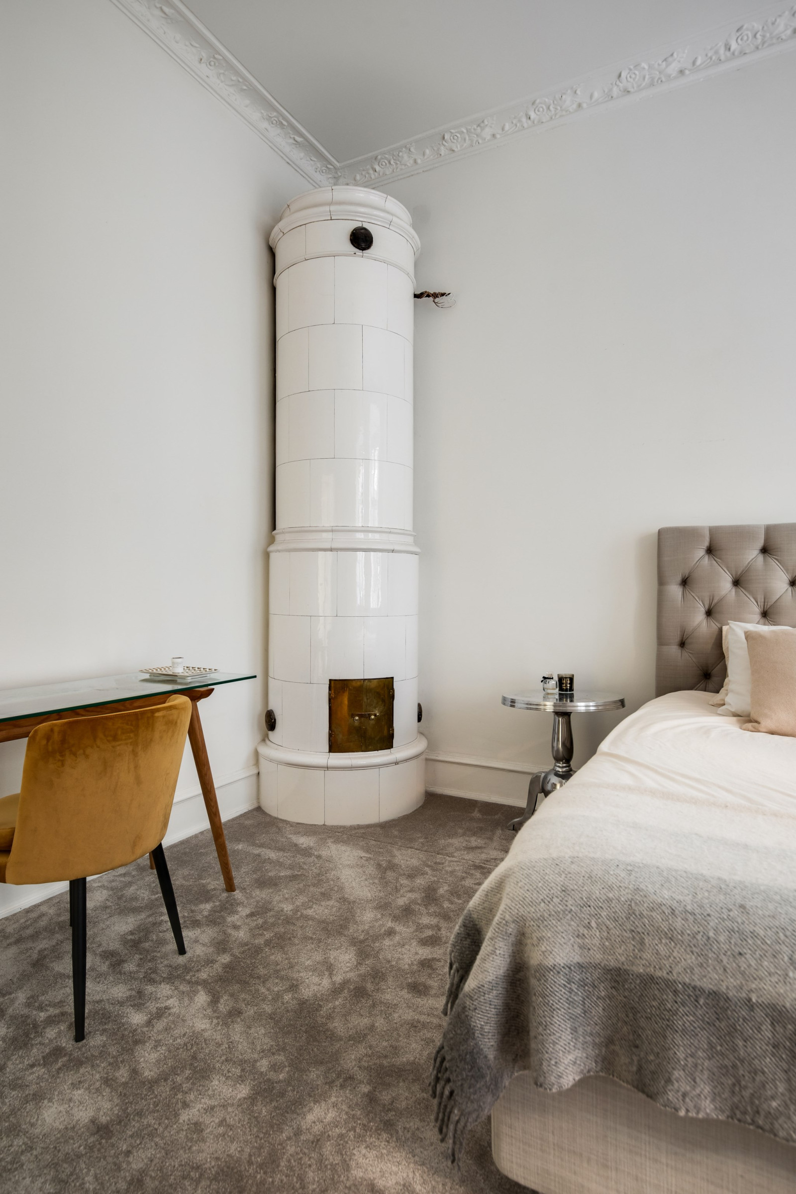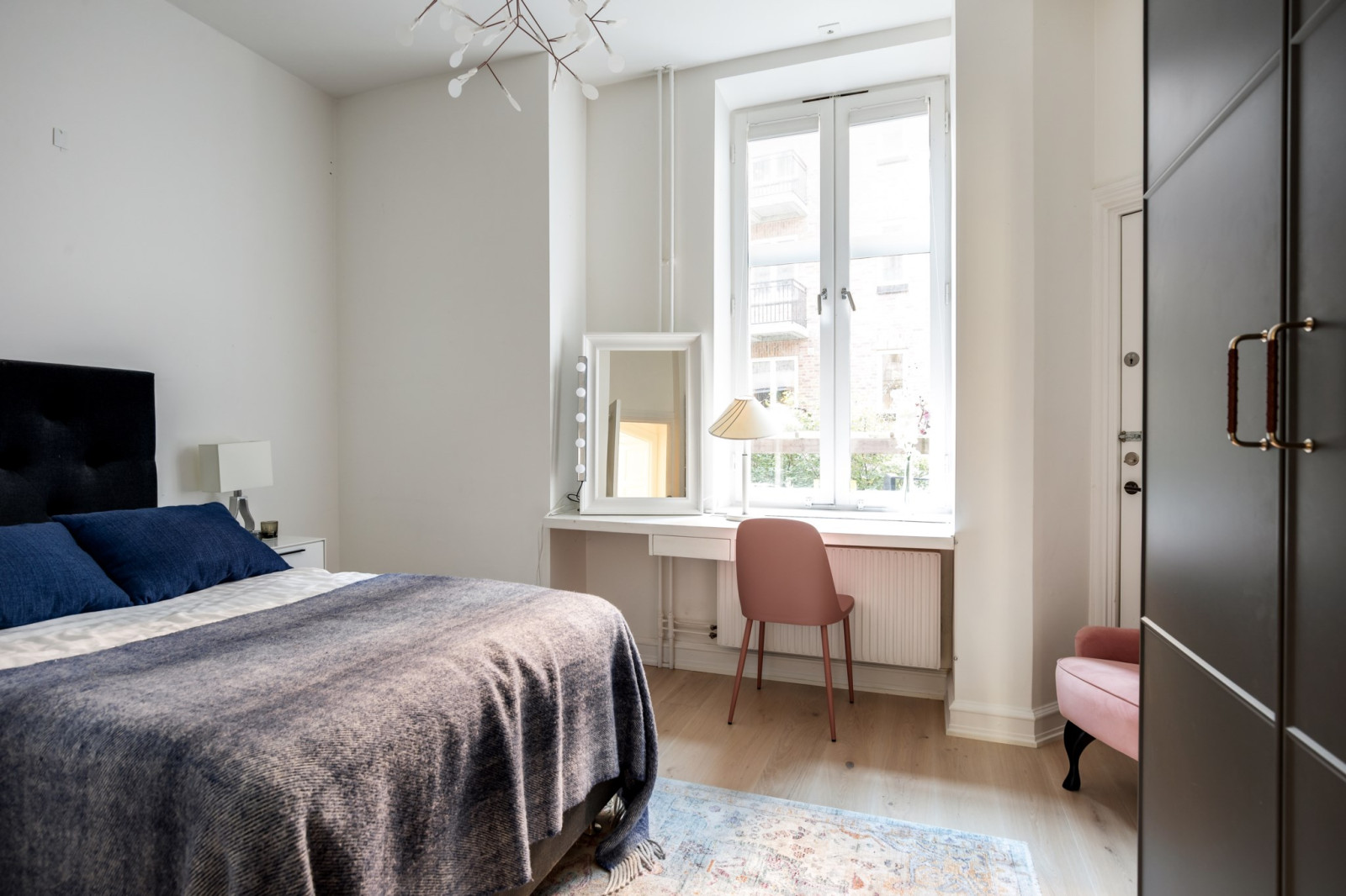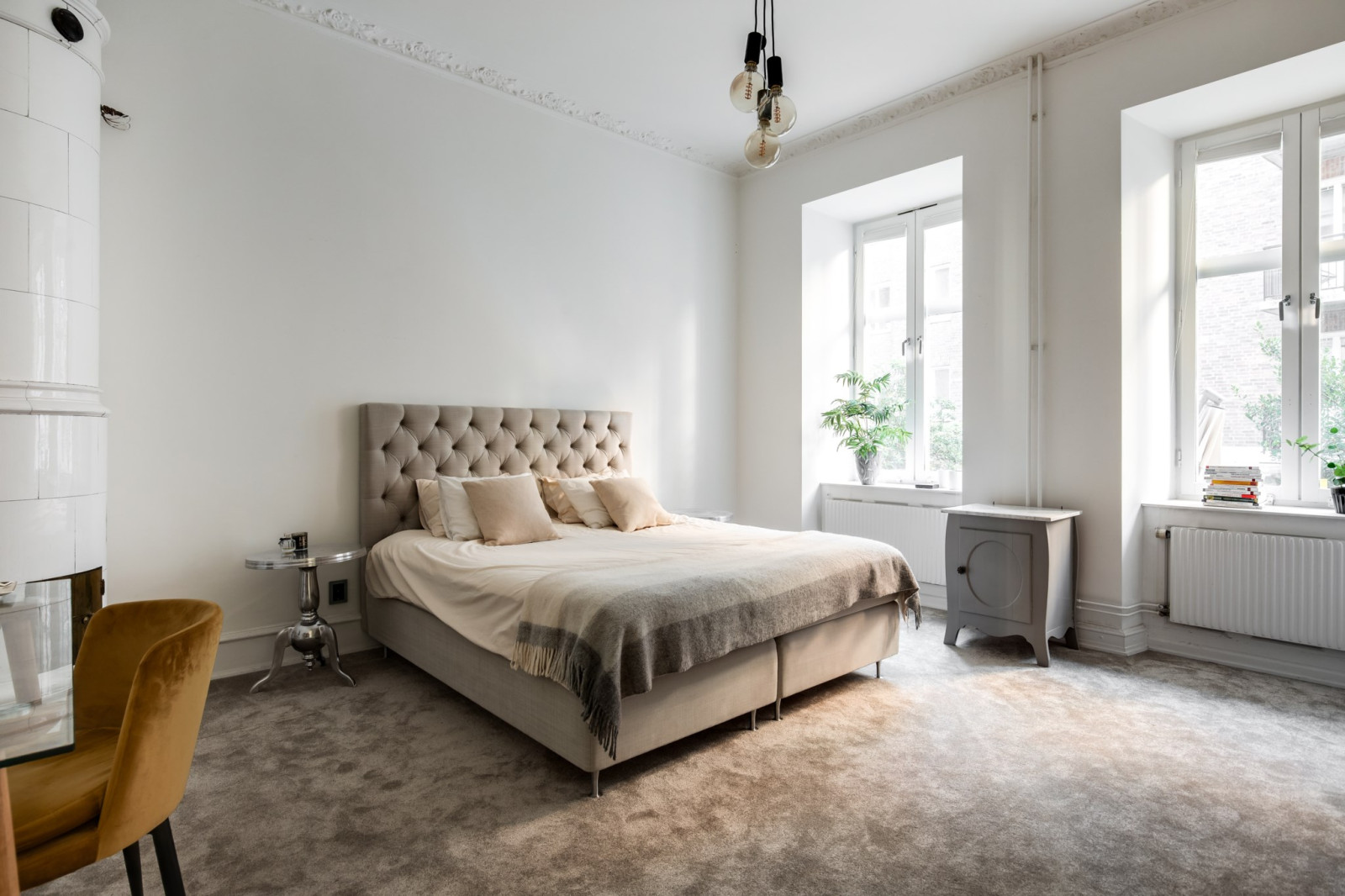med heltäckningsmatta i sober ton, takstuckaturer, takrosett samt tre meter garderob snyggt gömt bakom sammetstyg på skena
