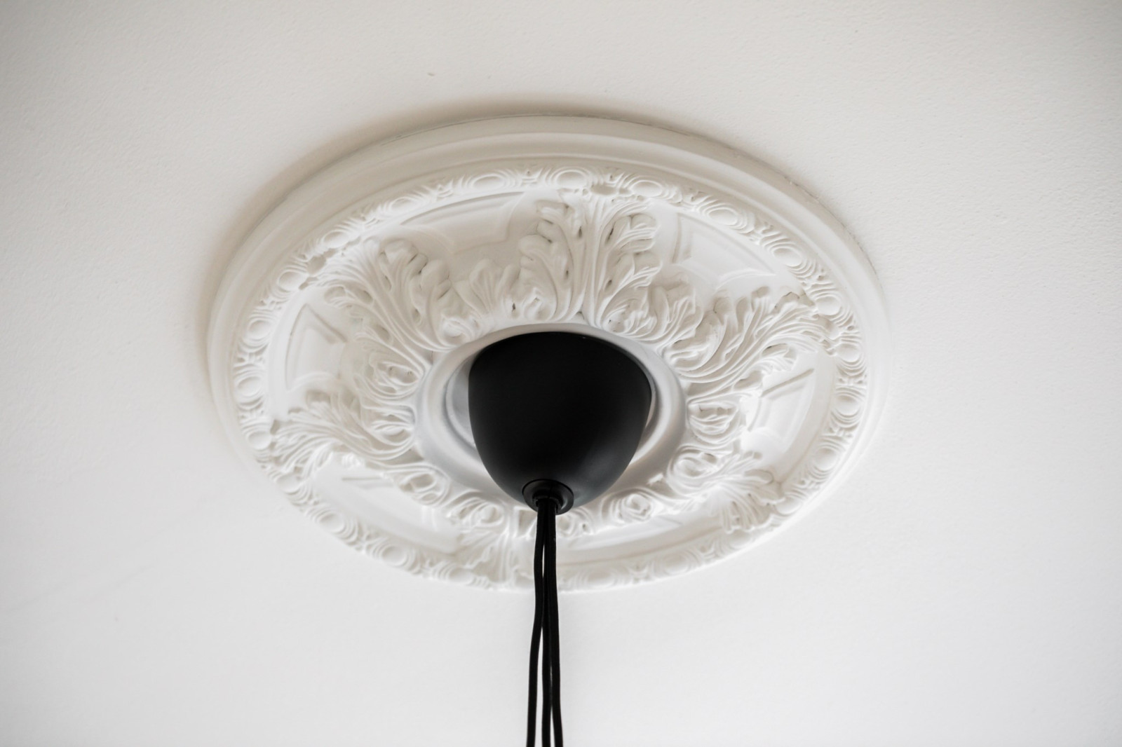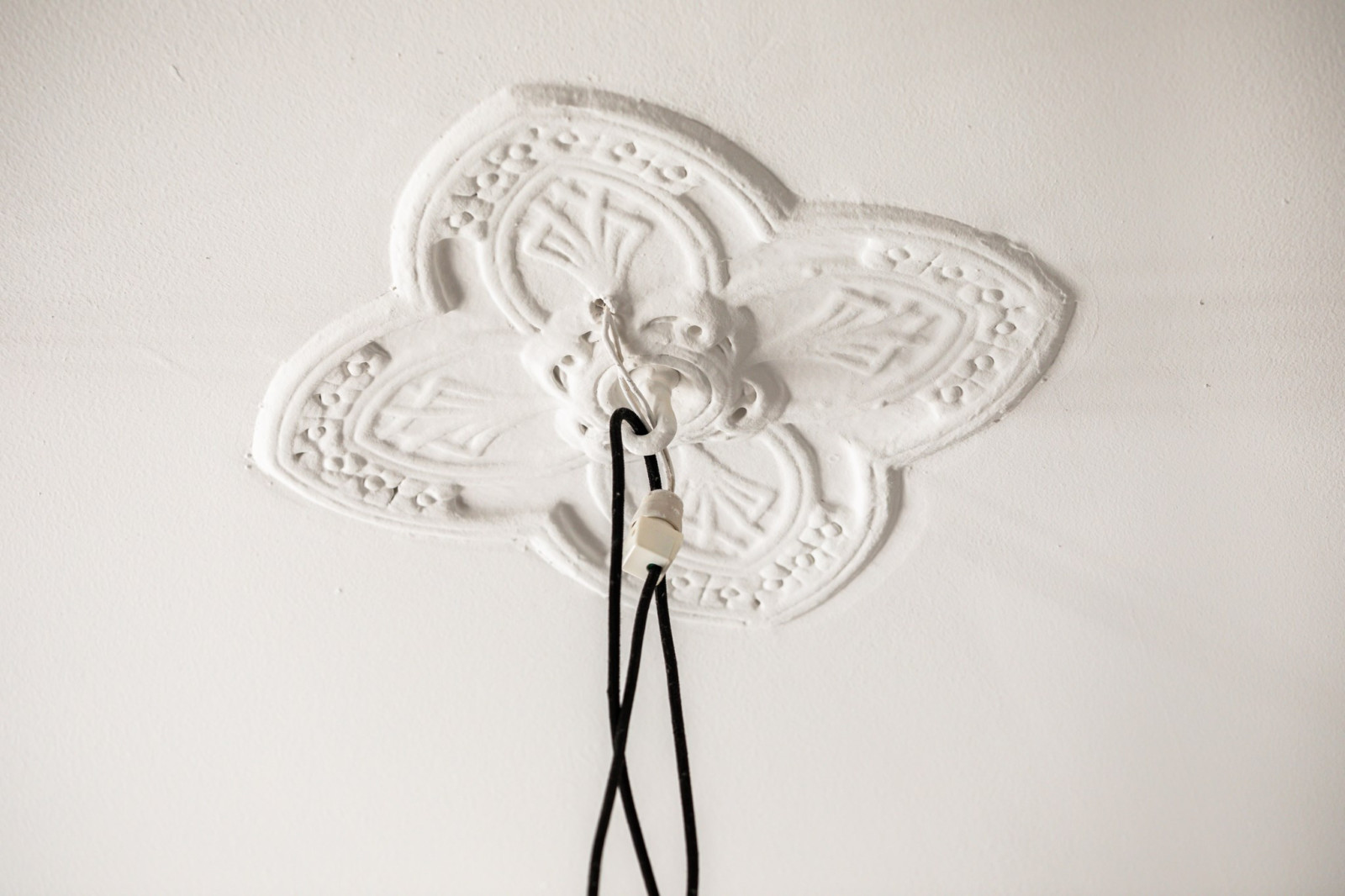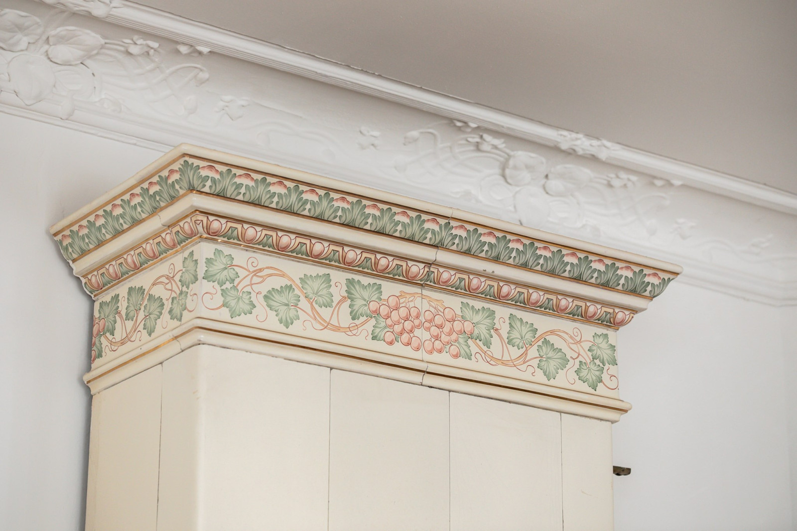 med heltäckningsmatta i sober ton, takstuckaturer, takrosett samt tre meter garderob snyggt gömt bakom sammetstyg på skena