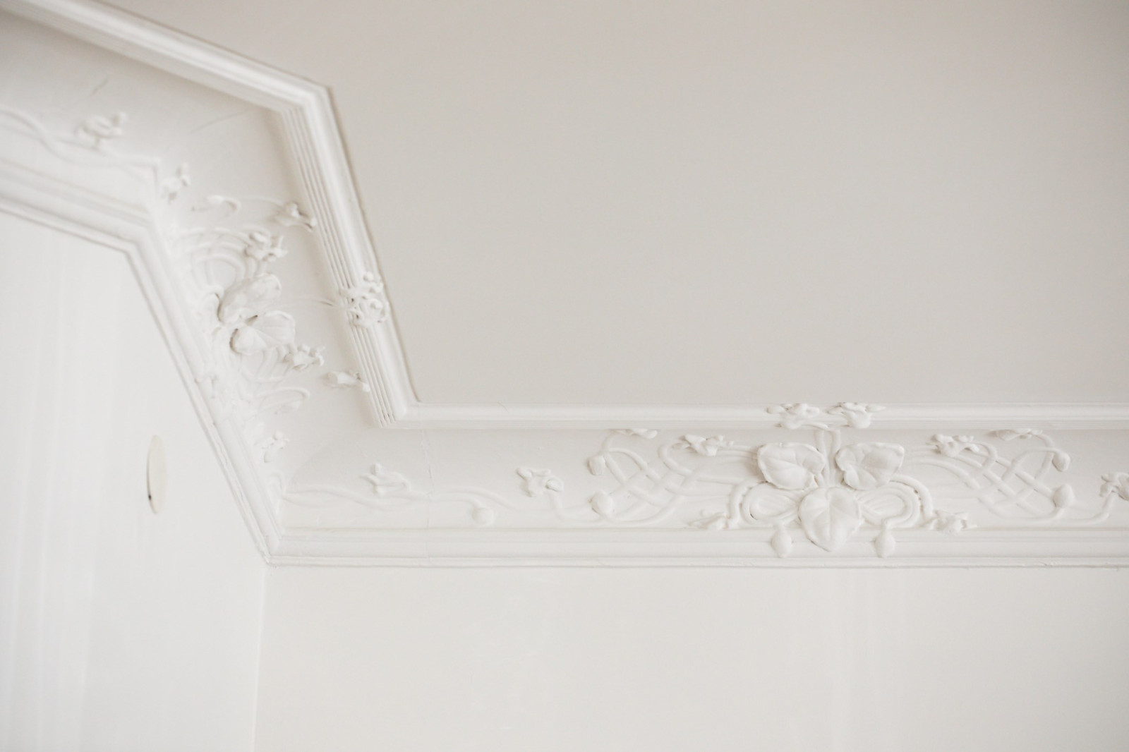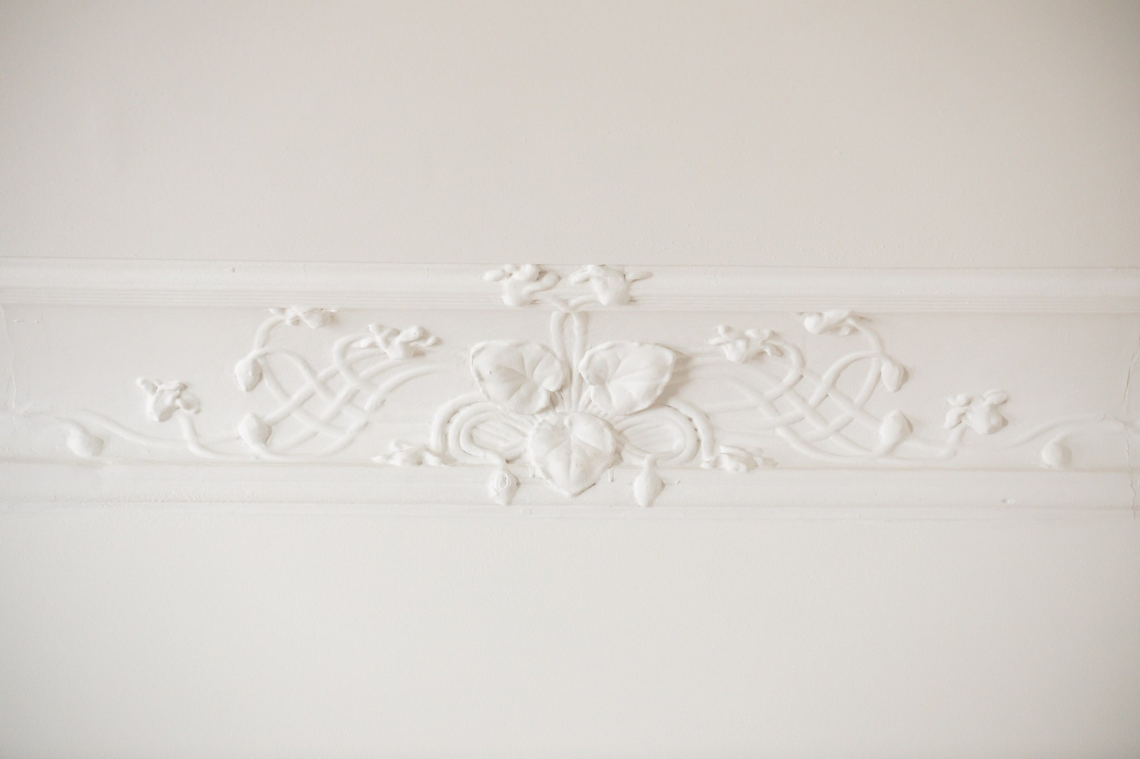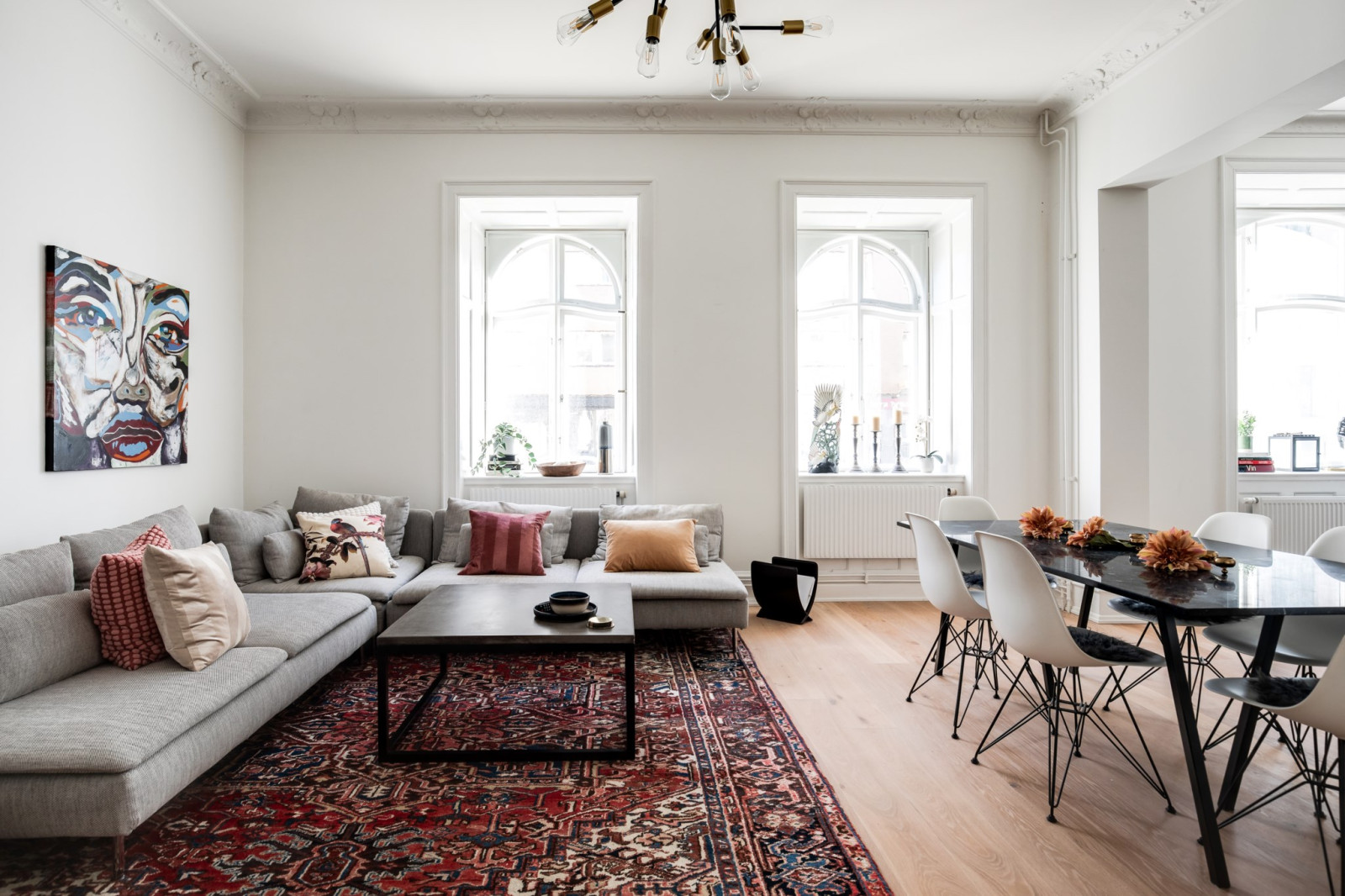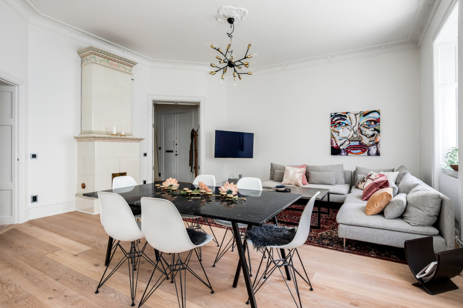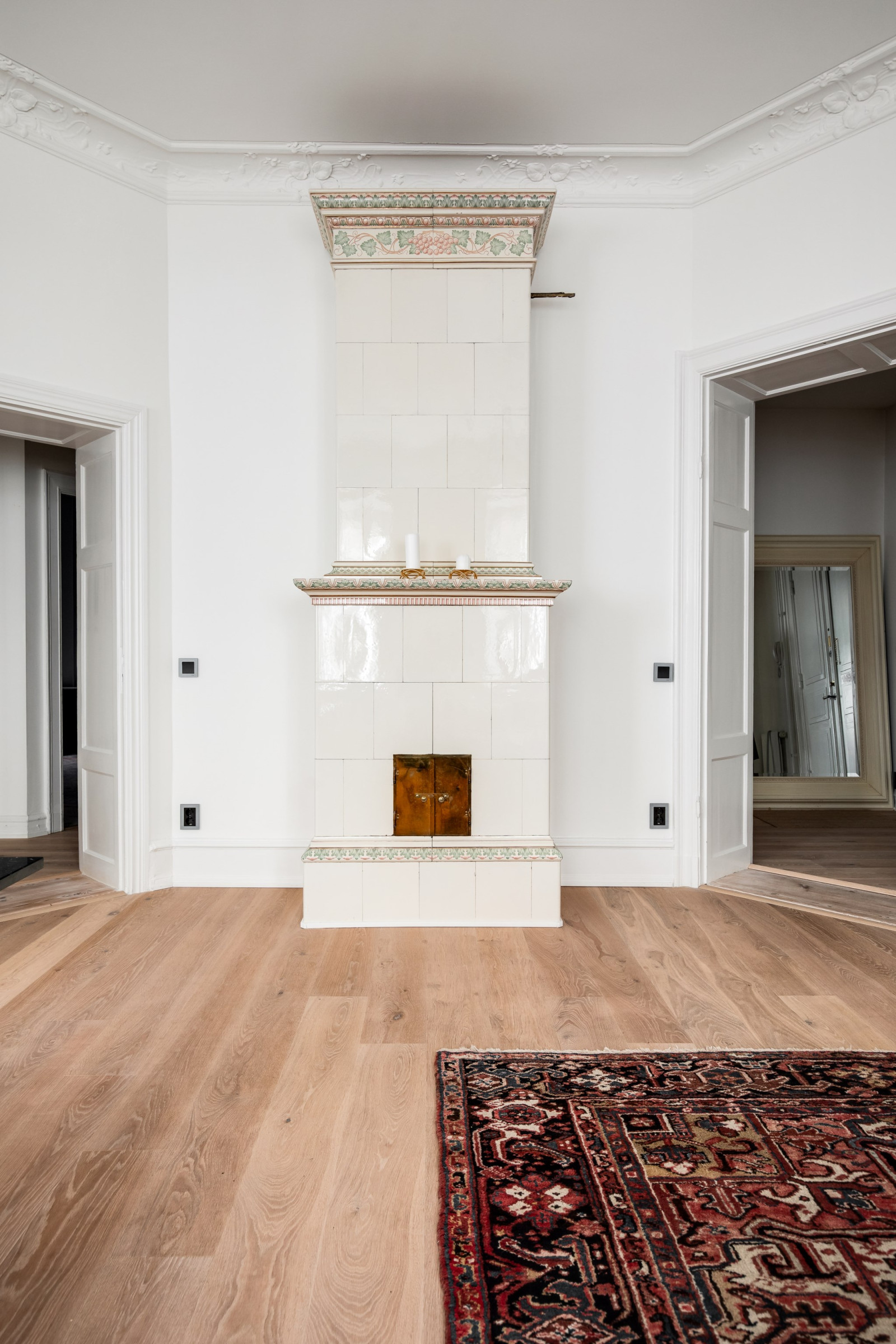 med vitlaserad 1-stavsparkett, kakelugn, takstuckaturer och takrosett. Öppen planlösning mot kök