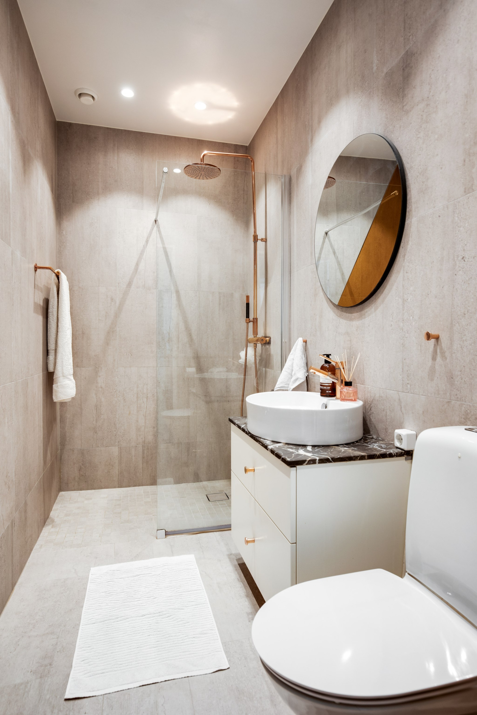 med granitkeramik-klinker på golv och väggar, duschhörna med glasvägg och takdusch, handfat med kommod och toalett