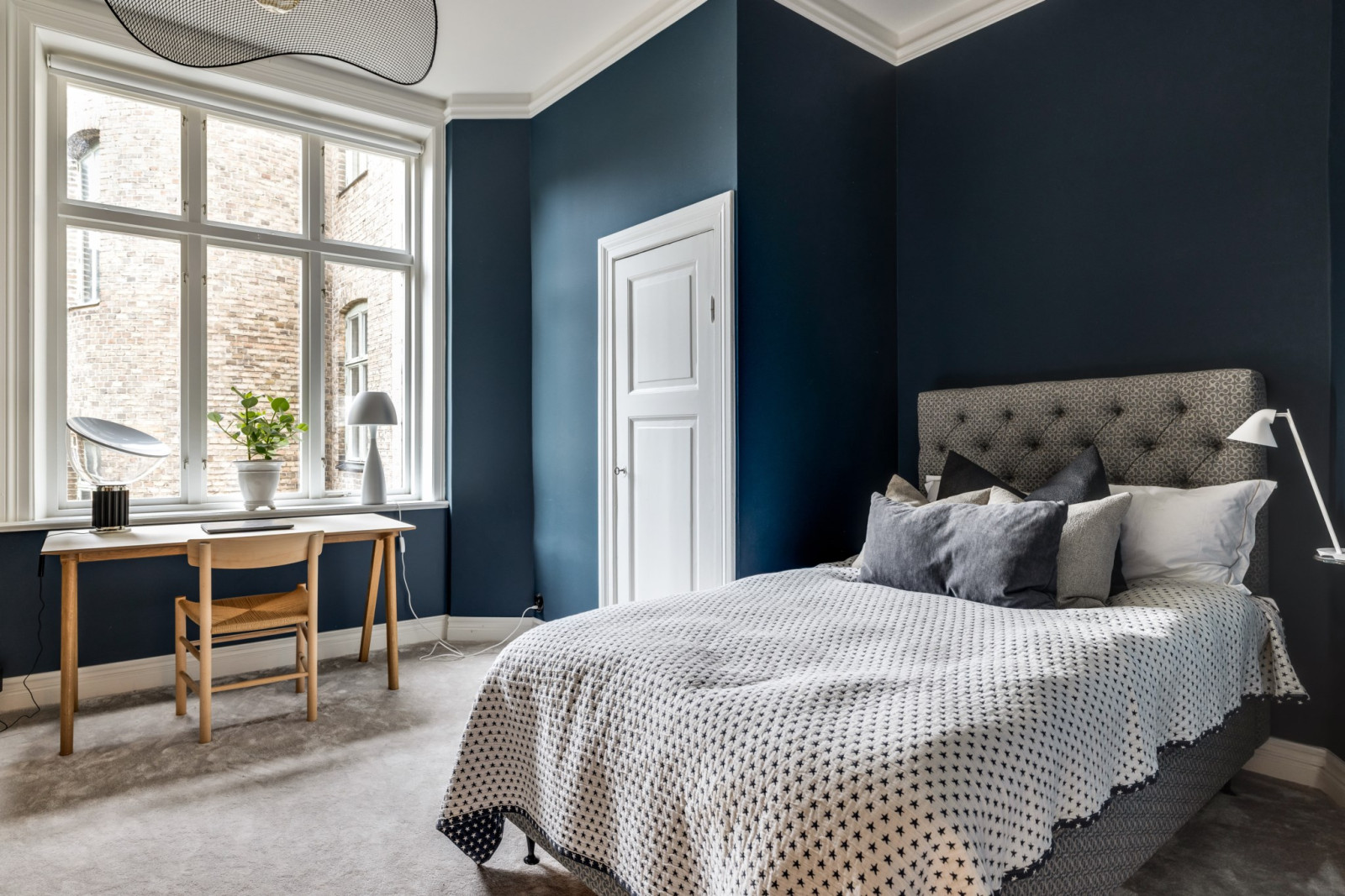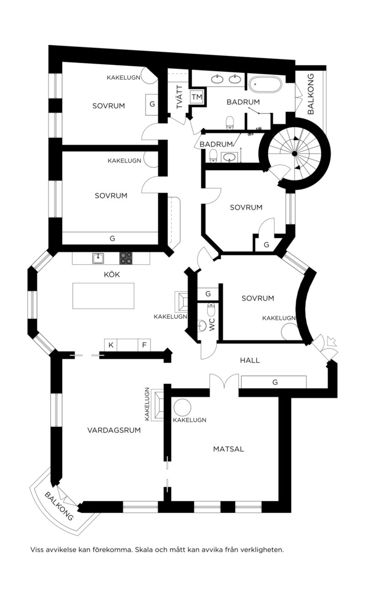 Fiskbensparkett, stuckaturer, fungerande kakelugn samt utgång till balkong i sydost.