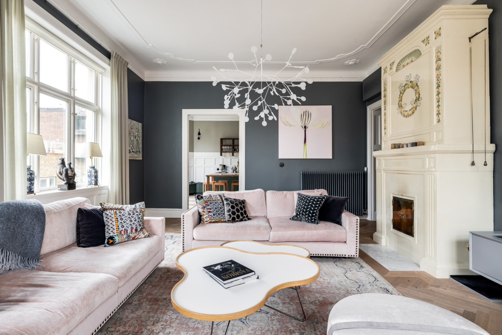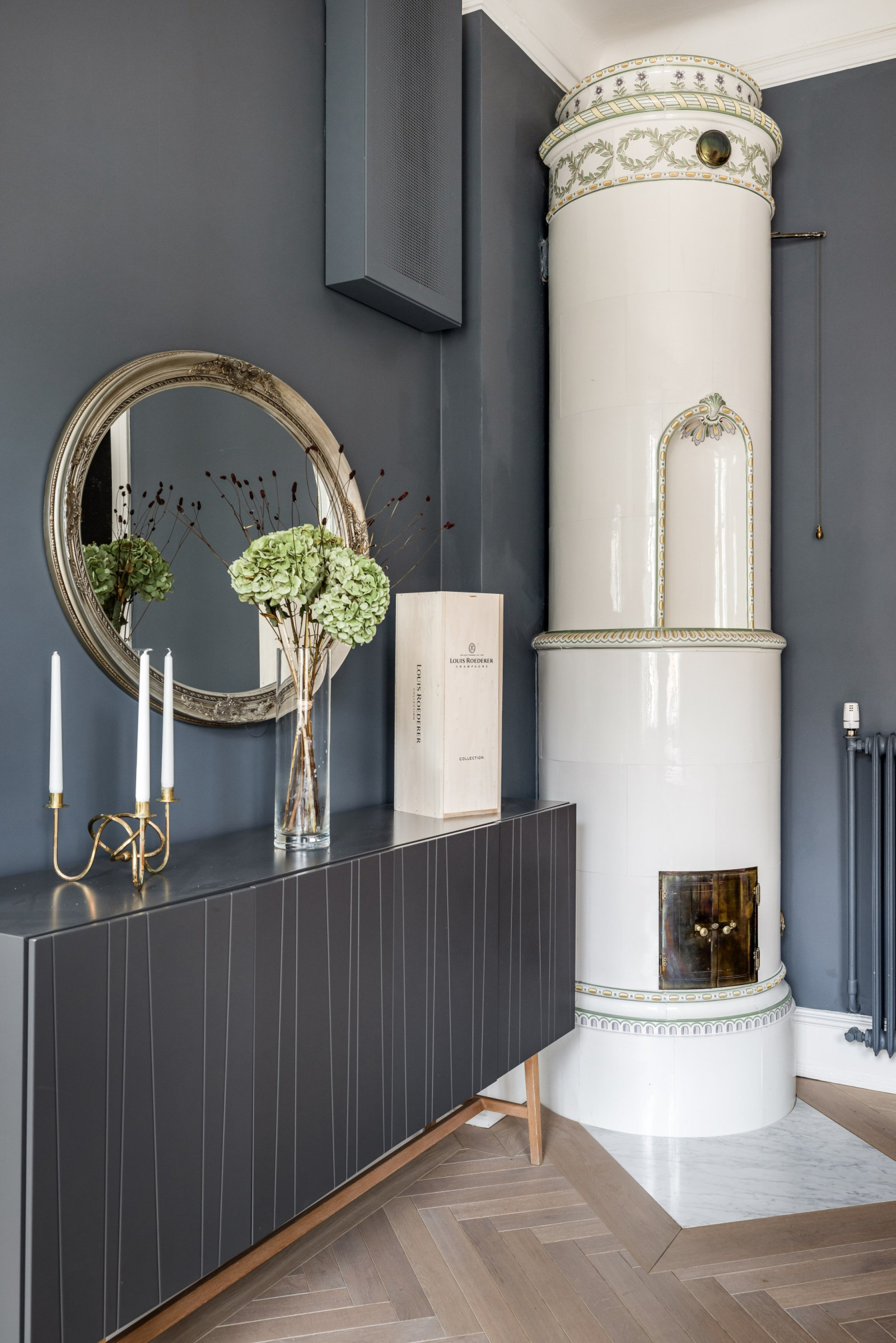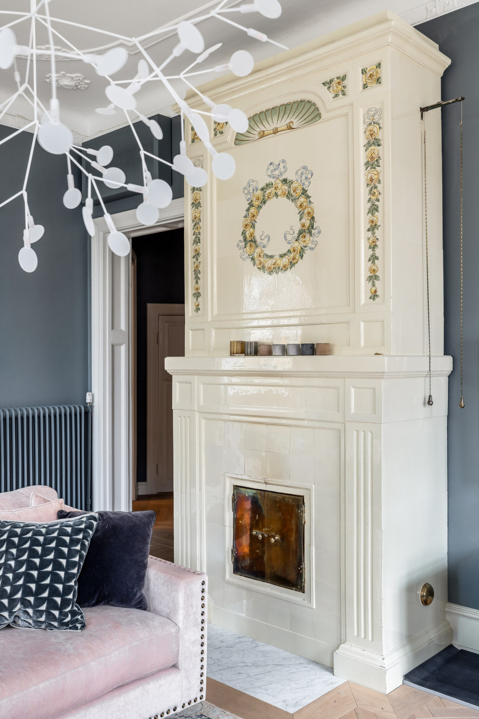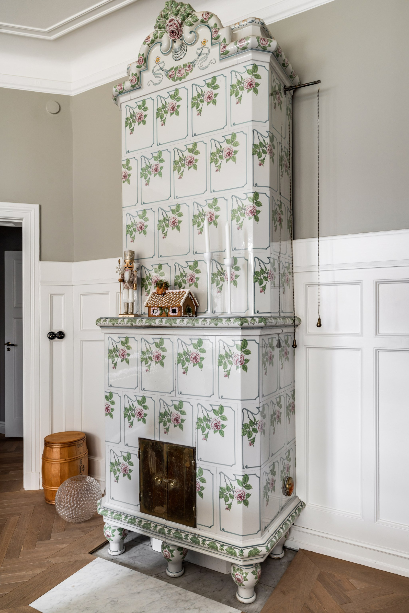 Fiskbensparkett, stuckaturer och fungerande kakelugn.