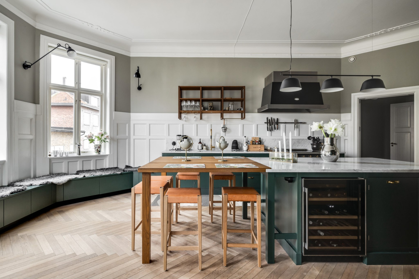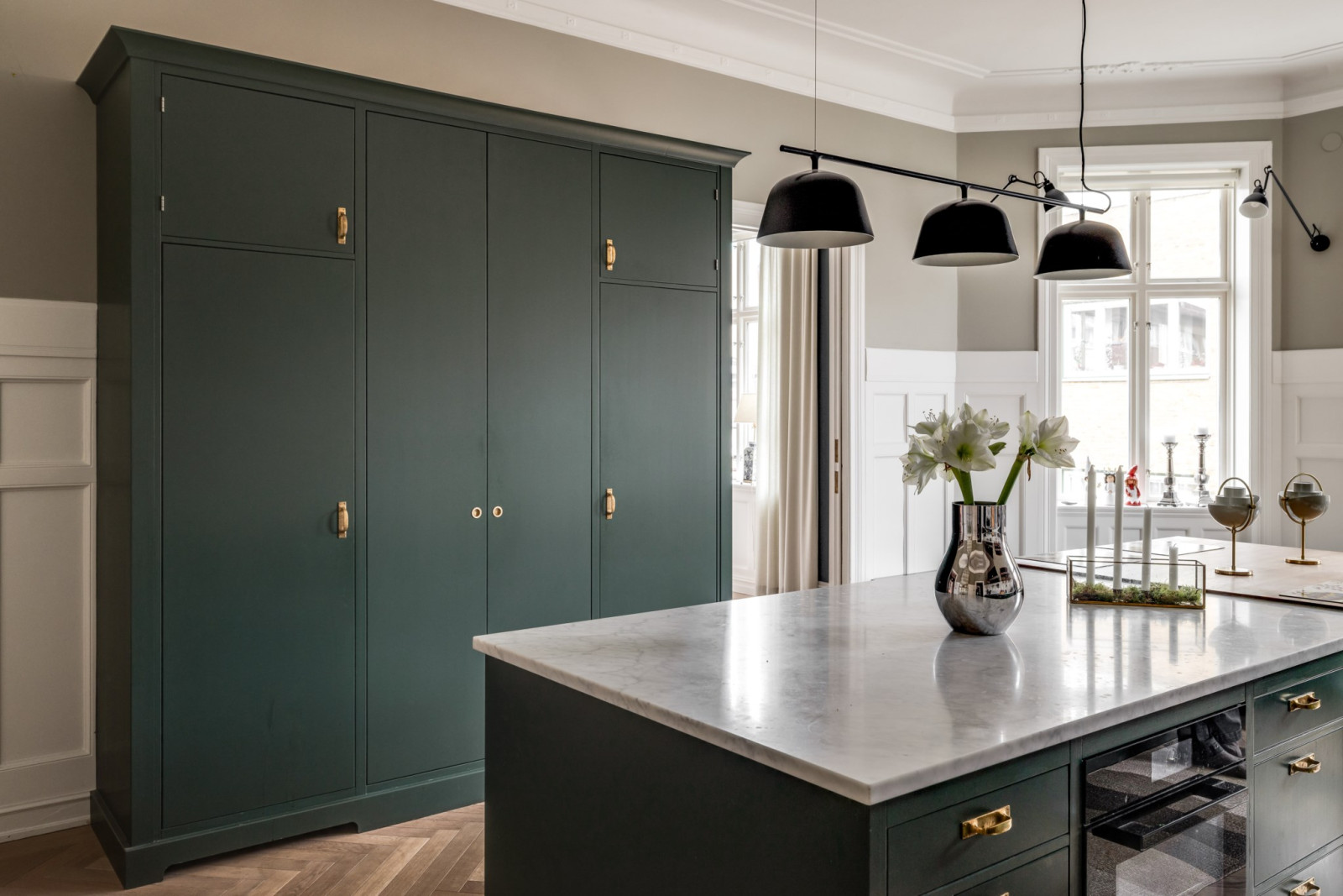 Fiskbensparkett, bänkskåp med Carraramarmor samt överskåp.