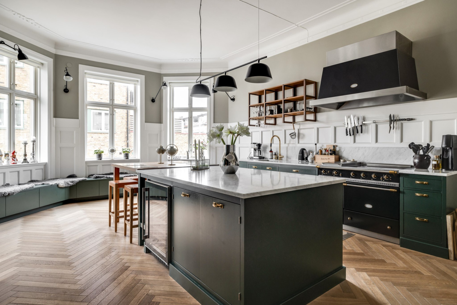 Fiskbensparkett, fungerande kakelugn, stuckaturer och stort burspråk med bröstpanel samt sittbänk med förvaring. Köket är i massivt handmålat trä, (Tresekel.se). Mielemaskiner samt spis och fläkt från Lacanche. Spisen har induktionshäll, grillplatta samt två ugnar. Stor fläktkåpa. Integrerad diskmaskin, två integrerade kyl/frysar, vinkyl samt kombinerad varmluft/micro. Bänkskiva i Carraramarmor samt ekskiva i barbordet med plats för 5-6 personer.