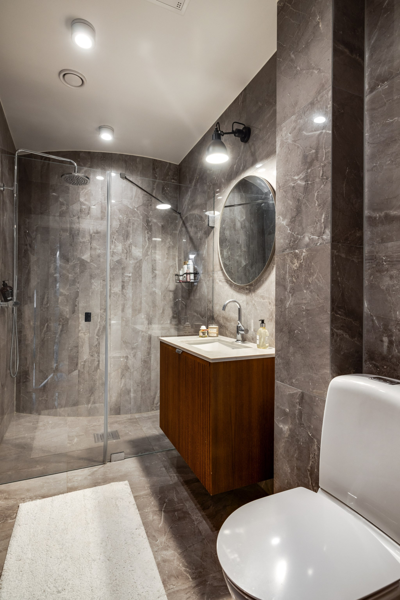 BADRUM med kakel, klinker med el-golvvärme, handdukstork, dusch, handfat med skåp, toalett samt spotlights i tak.