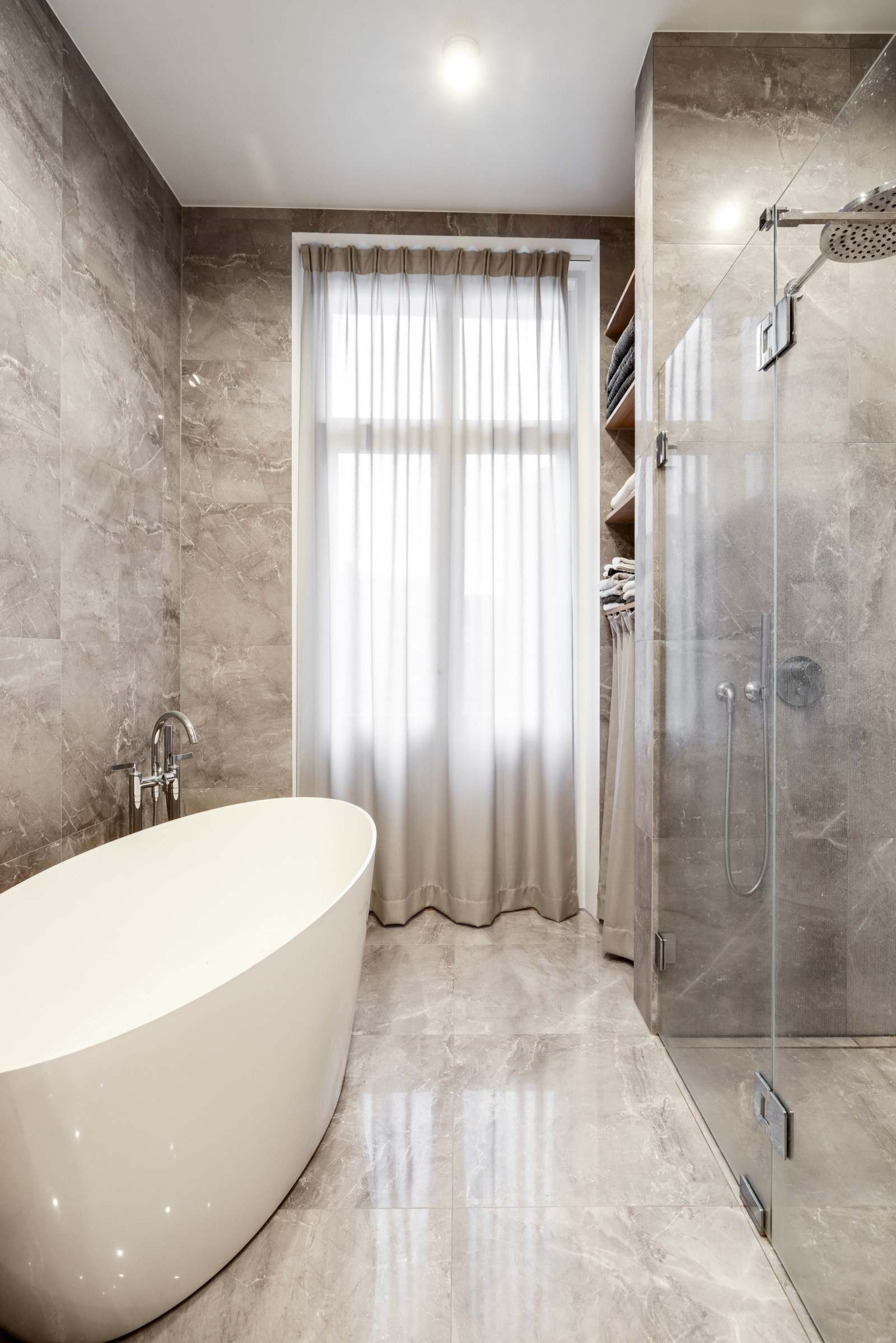BADRUM med kakel, klinker med el-golvvärme, handdukstork, dusch, badkar, handfat med skåp, toalett, utgång till balkong mot gården samt spotlights i tak.