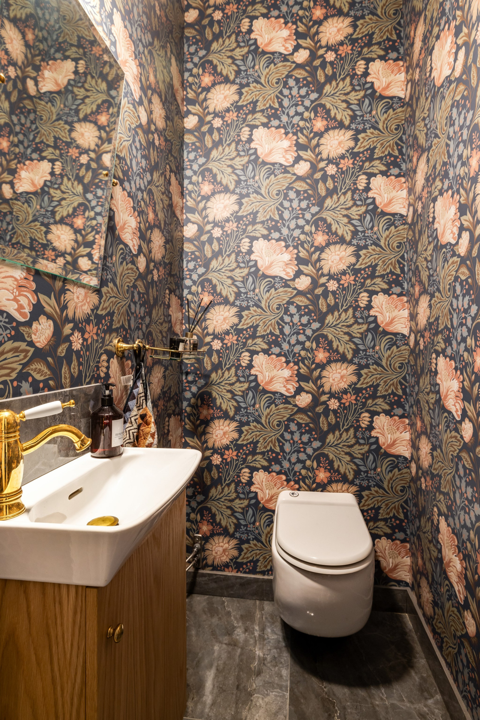 Klinker, tapet, handfat samt toalett.
