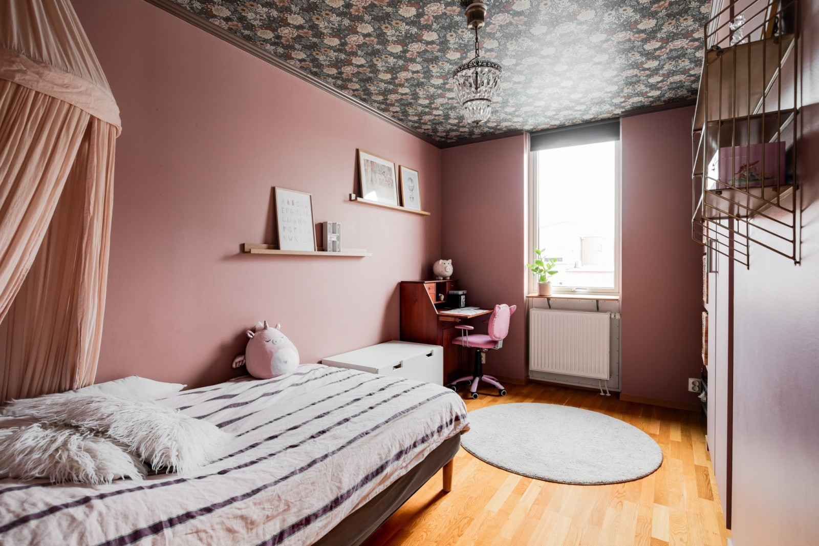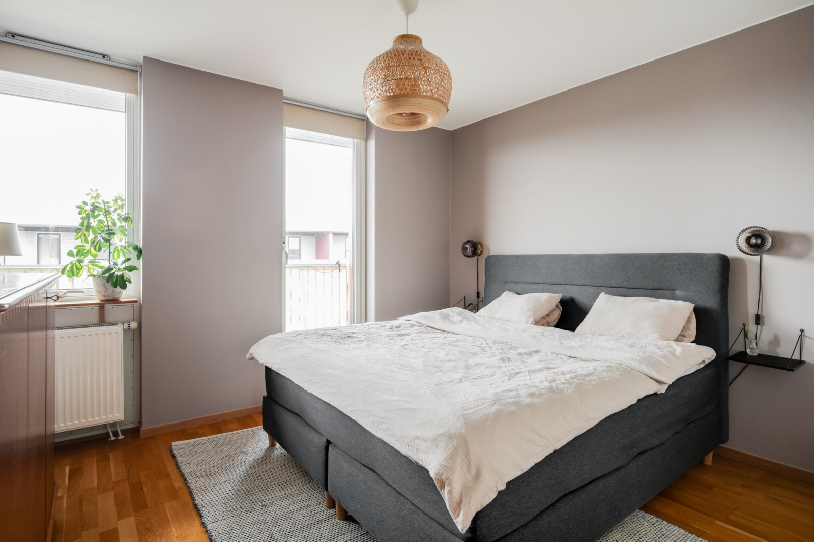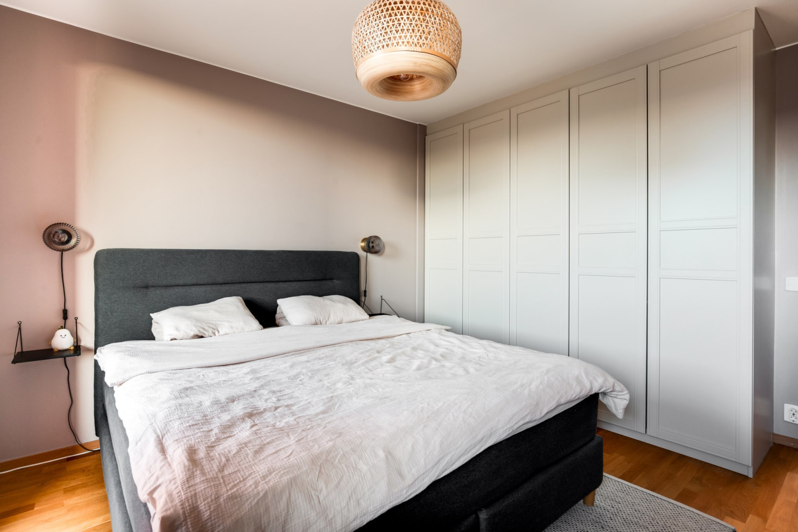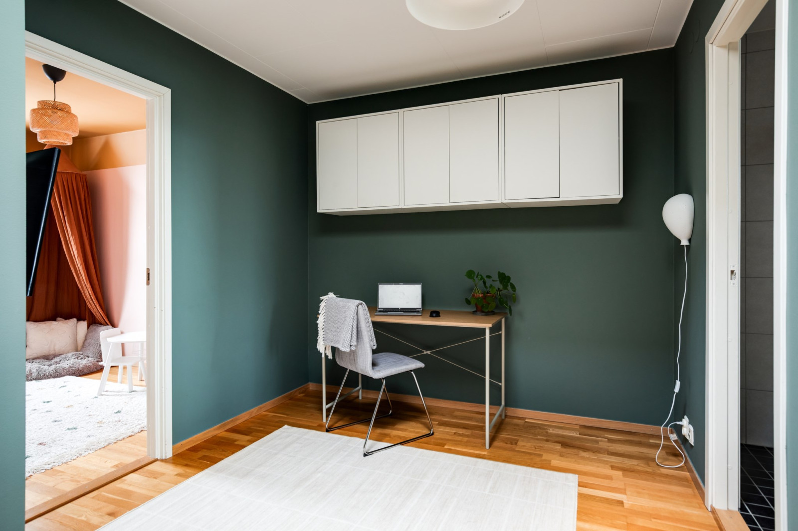 Parkettgolv, målad vägg. Garderobsvägg. Utgång till solig västerbalkong.