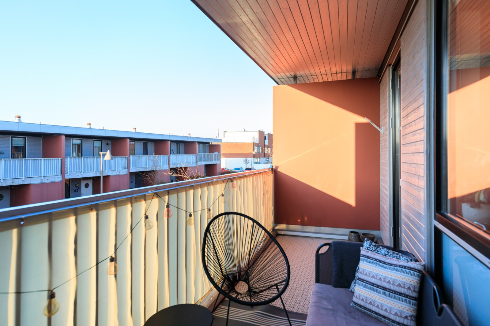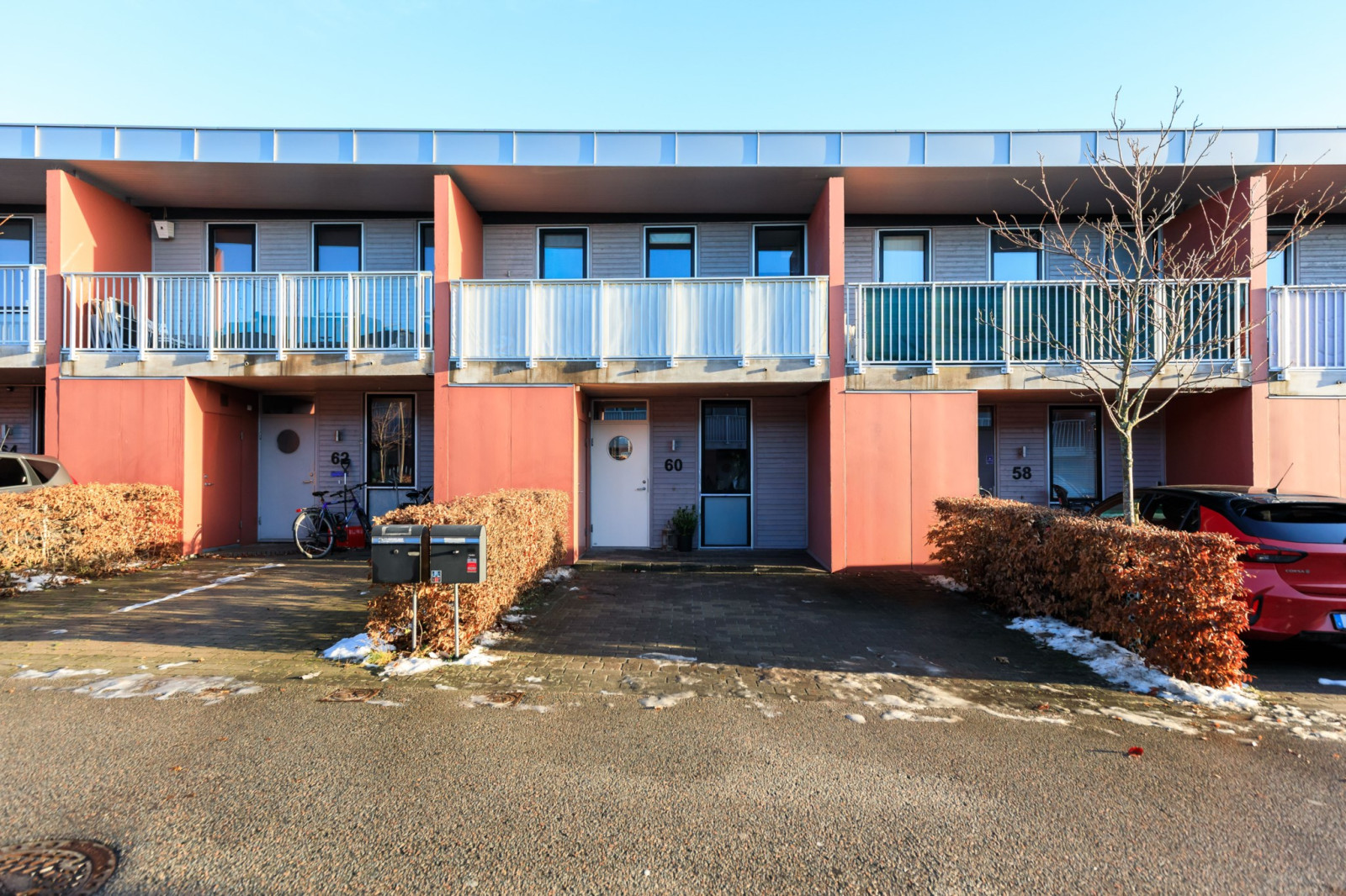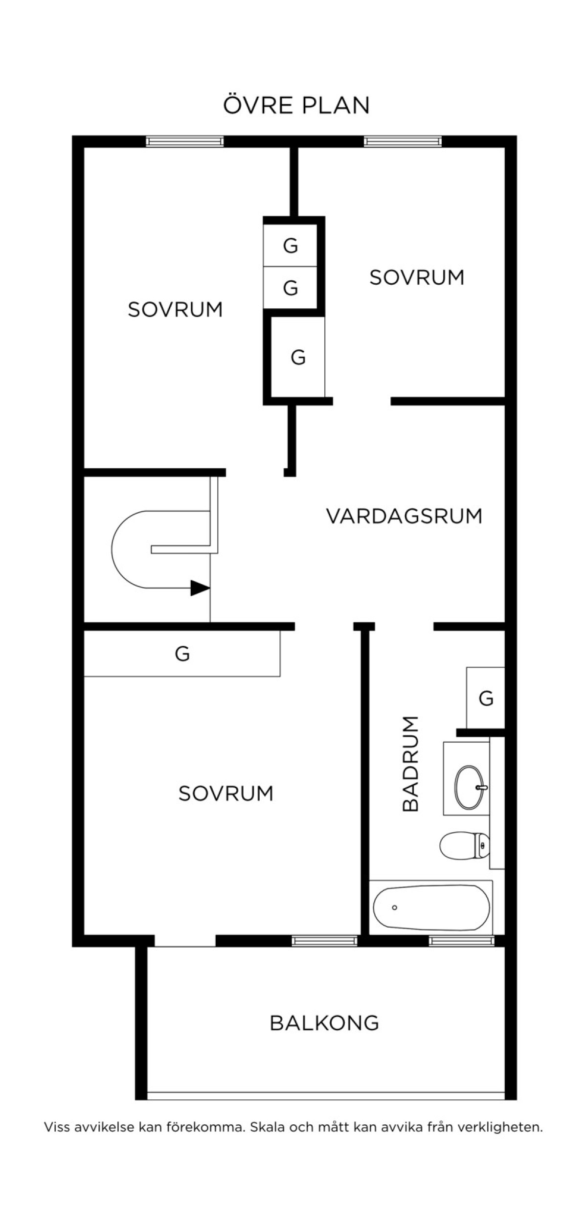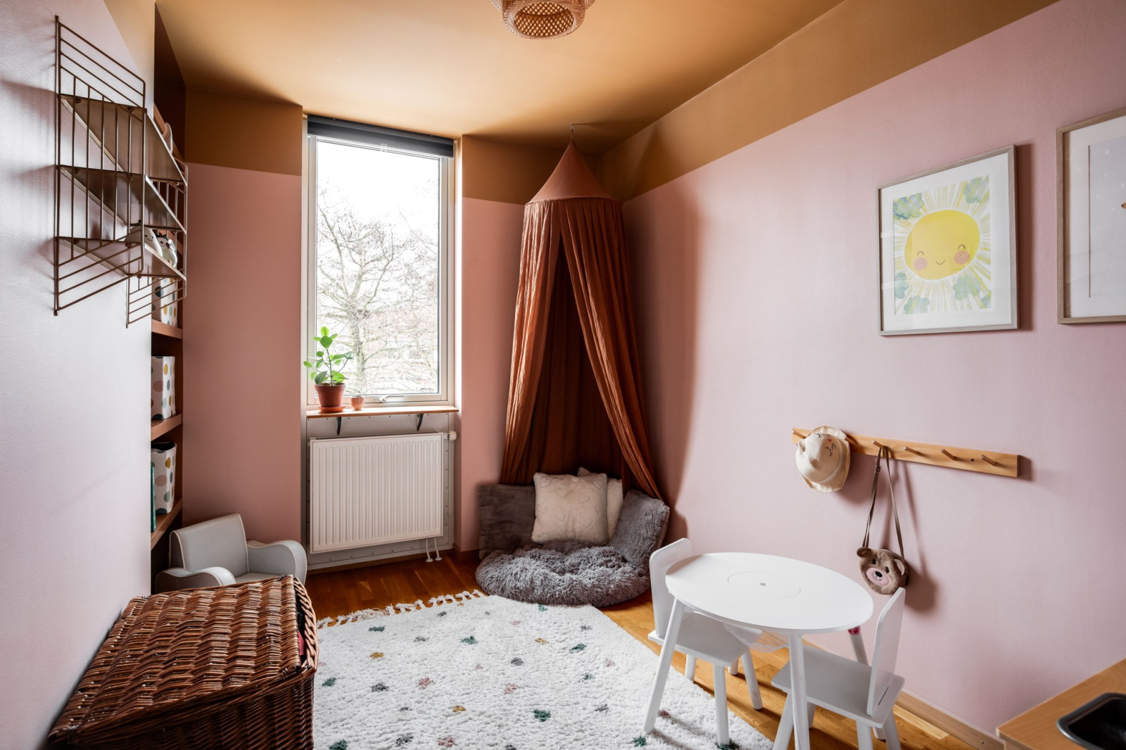Parkettgolv, målad vägg. Garderobsvägg. Utgång till solig västerbalkong.