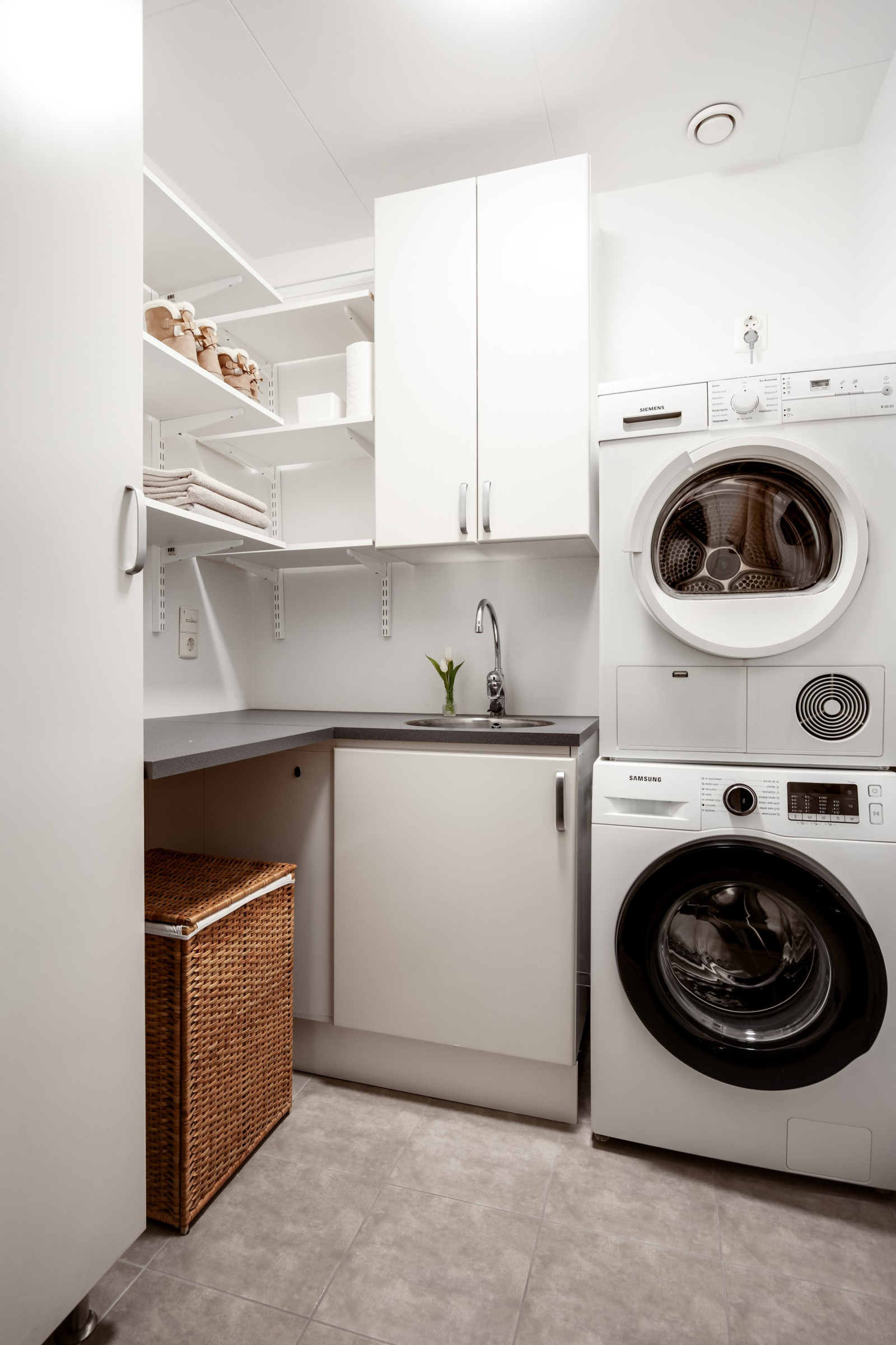 Klinkergolv, målad vägg. Tvättho, ovanskåp, tvättmaskin och torktumlare -2023.