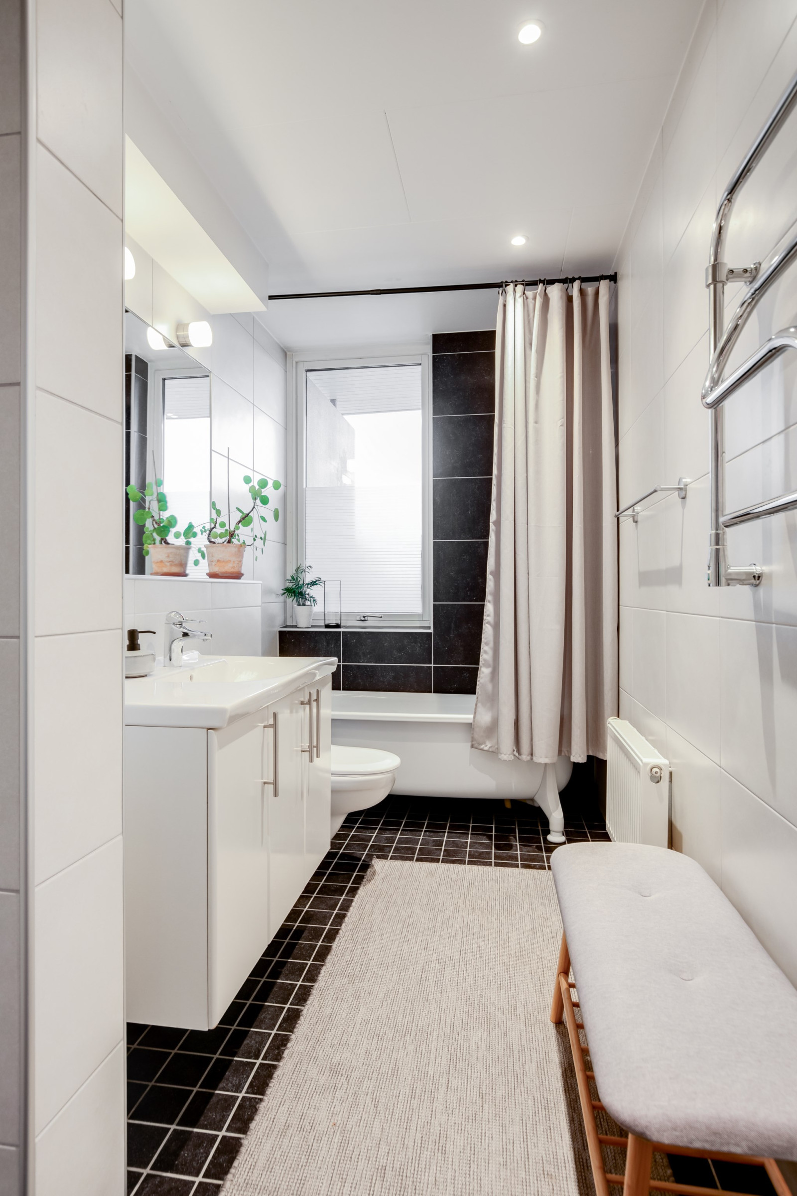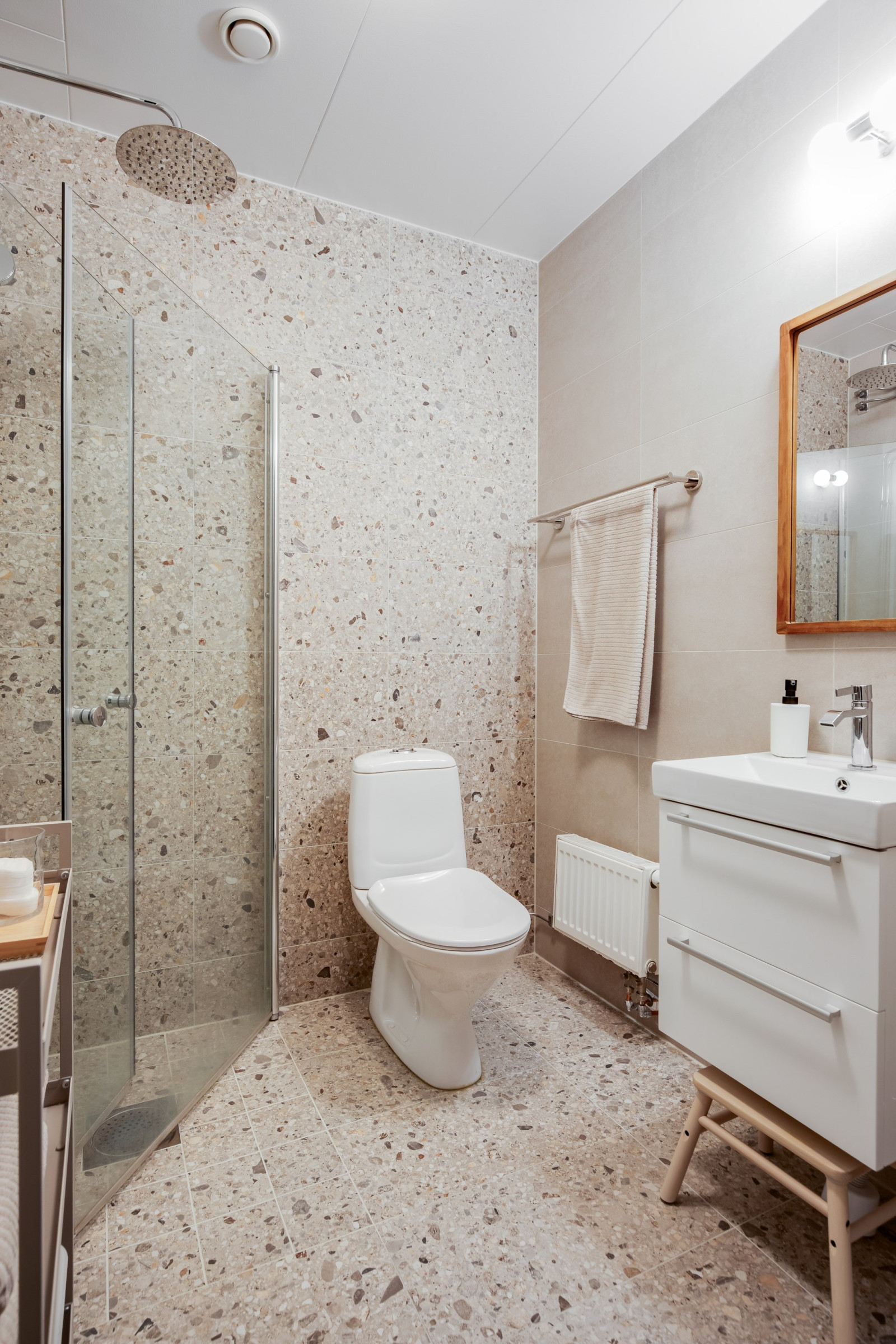 Klinkergolv, kakel på vägg. Wc, tvättställskommod med lådor, handdukshängare och duschplats bakom eleganta duschväggar. Hela utrymmet är totalrenoverat under 2024 i omsorgsfullt utvalda färger. Arbetet har utförts av WEAB, våtrumsintyg finns.