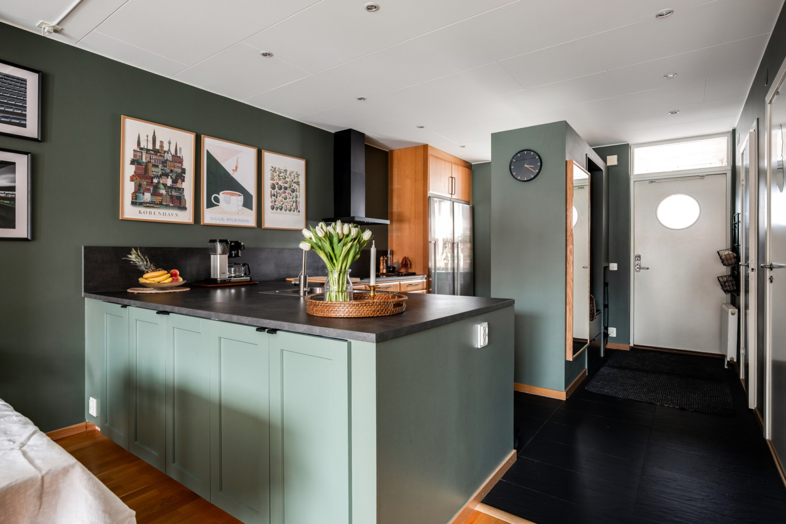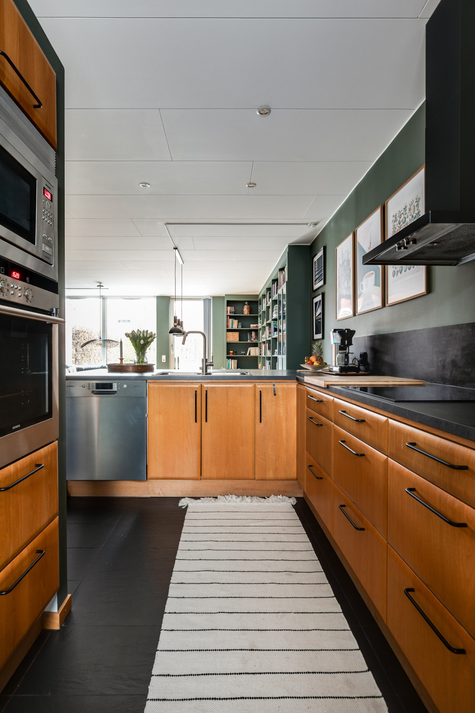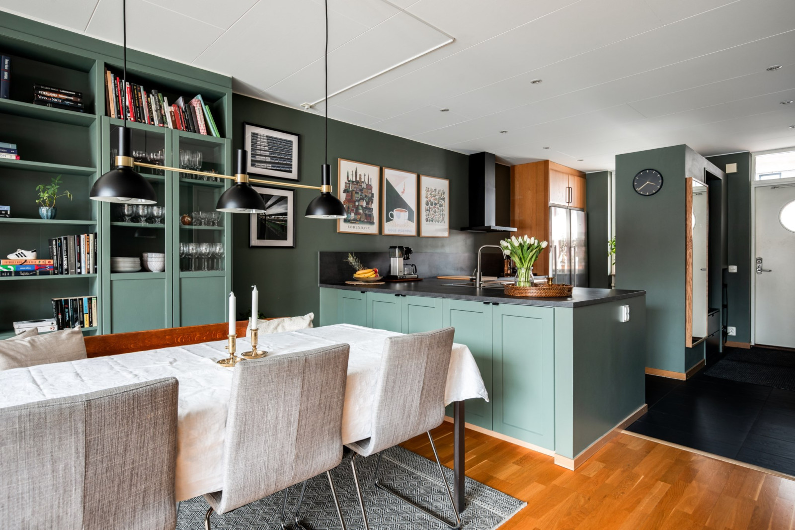 Klinkergolv, målad vägg. Elegant kök i ek från Myresjök med stilrent stänkskydd ovanför bänkskivan. Köket har delvis renoverats under 2023 då skiljevägg tagits ned mellan kök och vardagsrum. Ny bänkskiva, stänkskydd, vask, keramikhäll, fläkt och köksskåp har satts upp. Kyl, frys, inbyggd ugn, inbyggd microugn och diskmaskin. Infälld belysning i tak. Skiljeväggens borttagande har resulterat i ett luftigt intryck med gott om arbetsyta och praktisk förvaring.