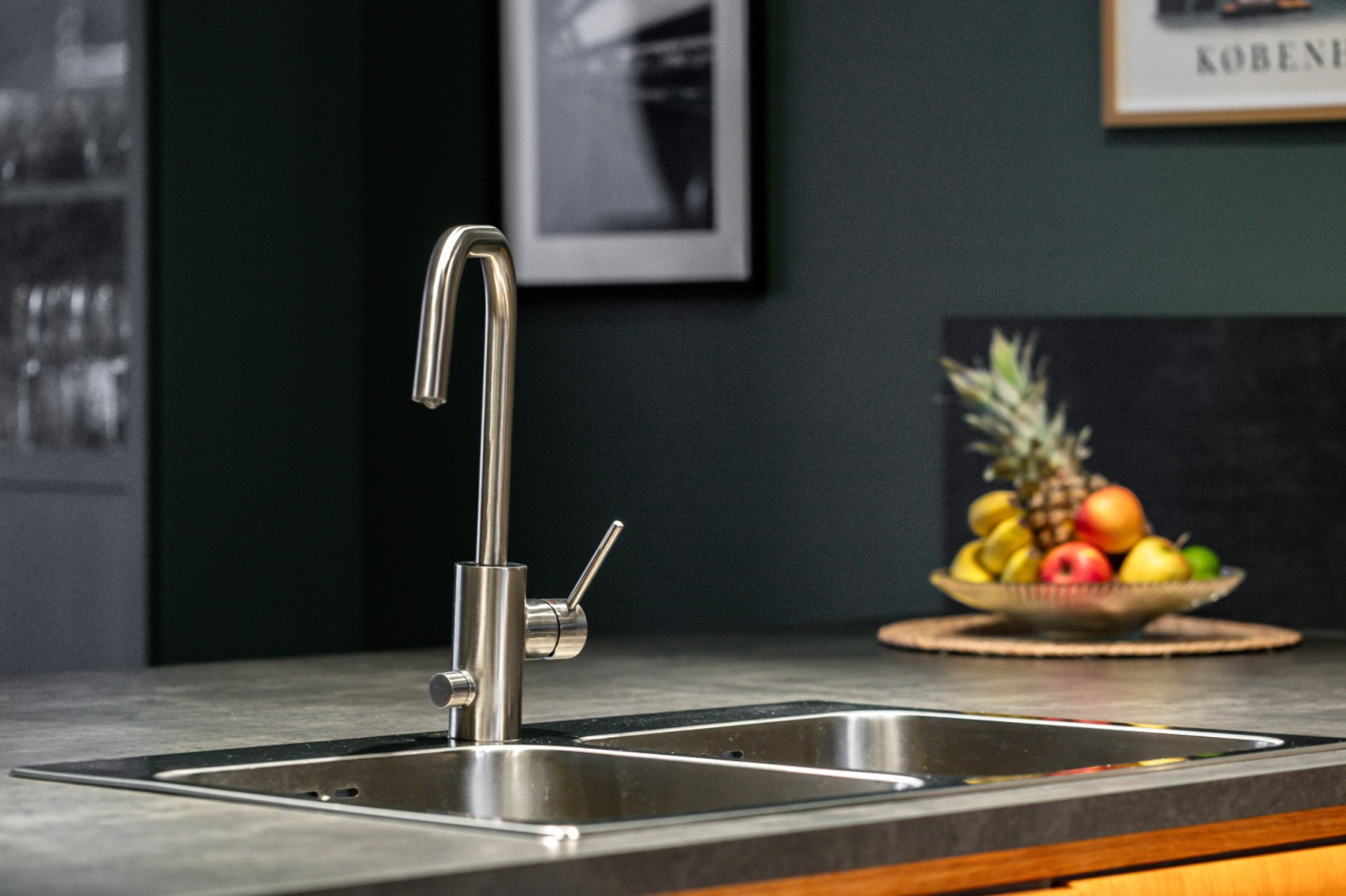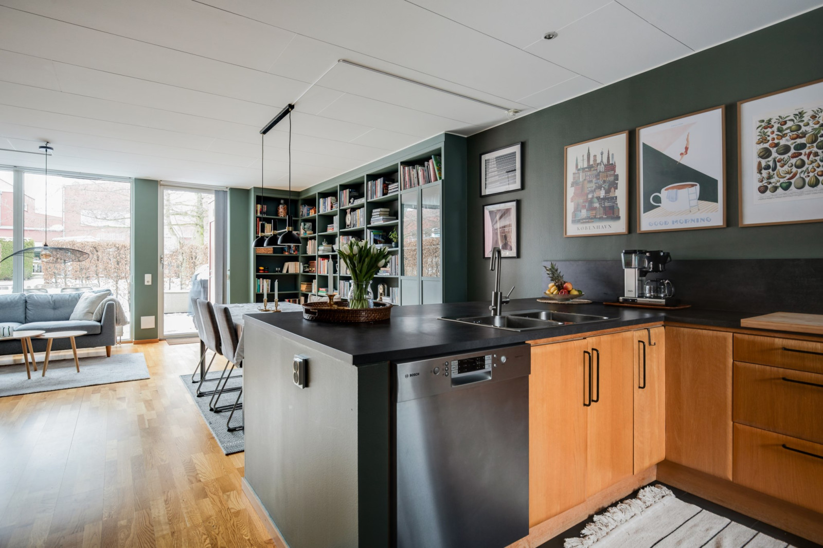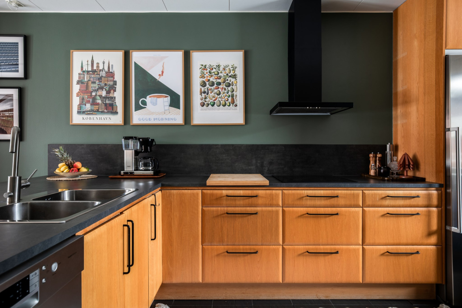 Klinkergolv, målad vägg. Elegant kök i ek från Myresjök med stilrent stänkskydd ovanför bänkskivan. Köket har delvis renoverats under 2023 då skiljevägg tagits ned mellan kök och vardagsrum. Ny bänkskiva, stänkskydd, vask, keramikhäll, fläkt och köksskåp har satts upp. Kyl, frys, inbyggd ugn, inbyggd microugn och diskmaskin. Infälld belysning i tak. Skiljeväggens borttagande har resulterat i ett luftigt intryck med gott om arbetsyta och praktisk förvaring.
