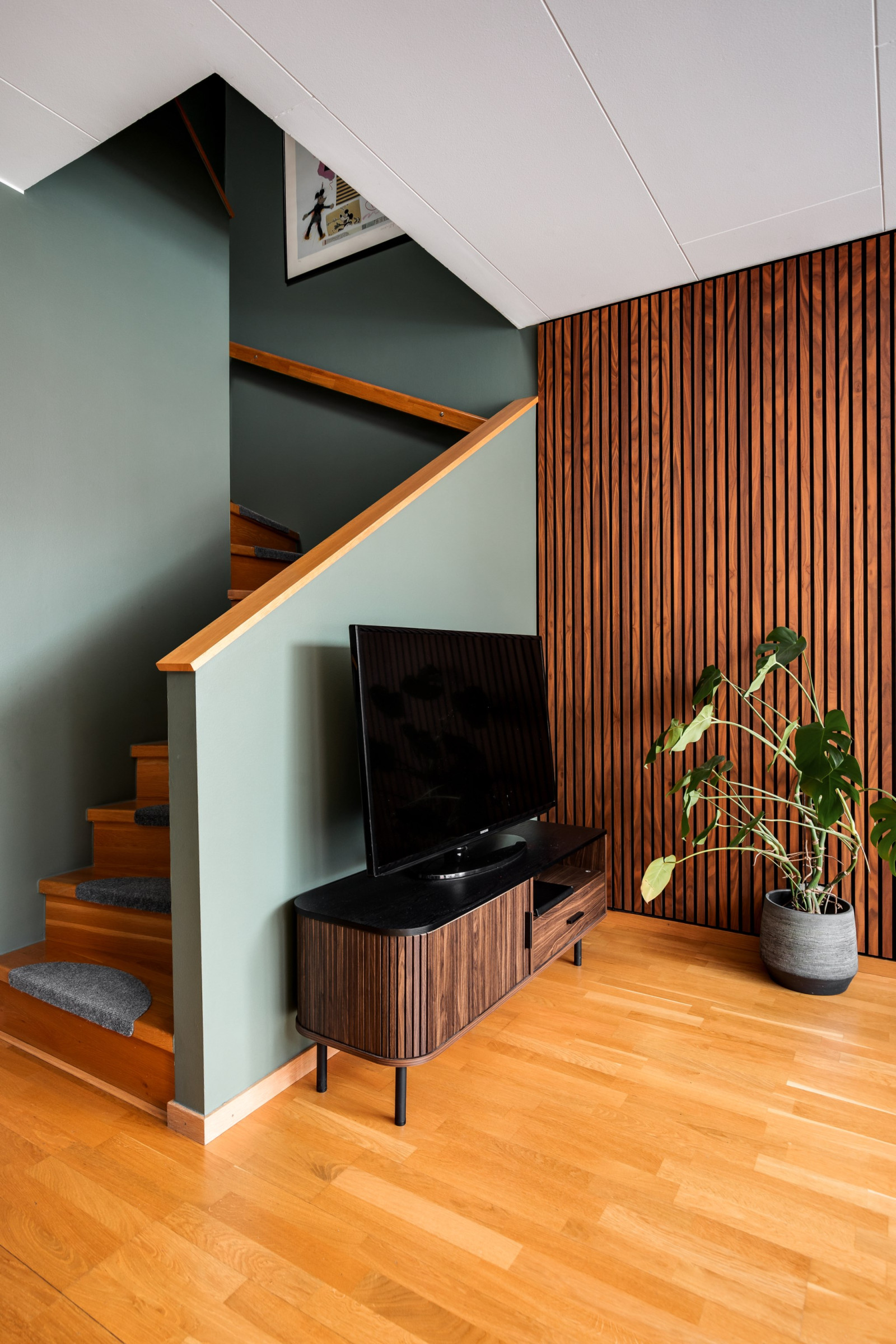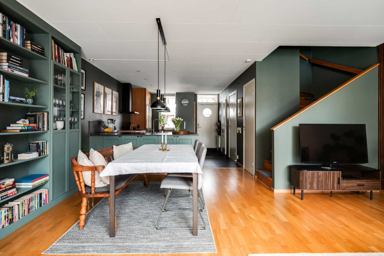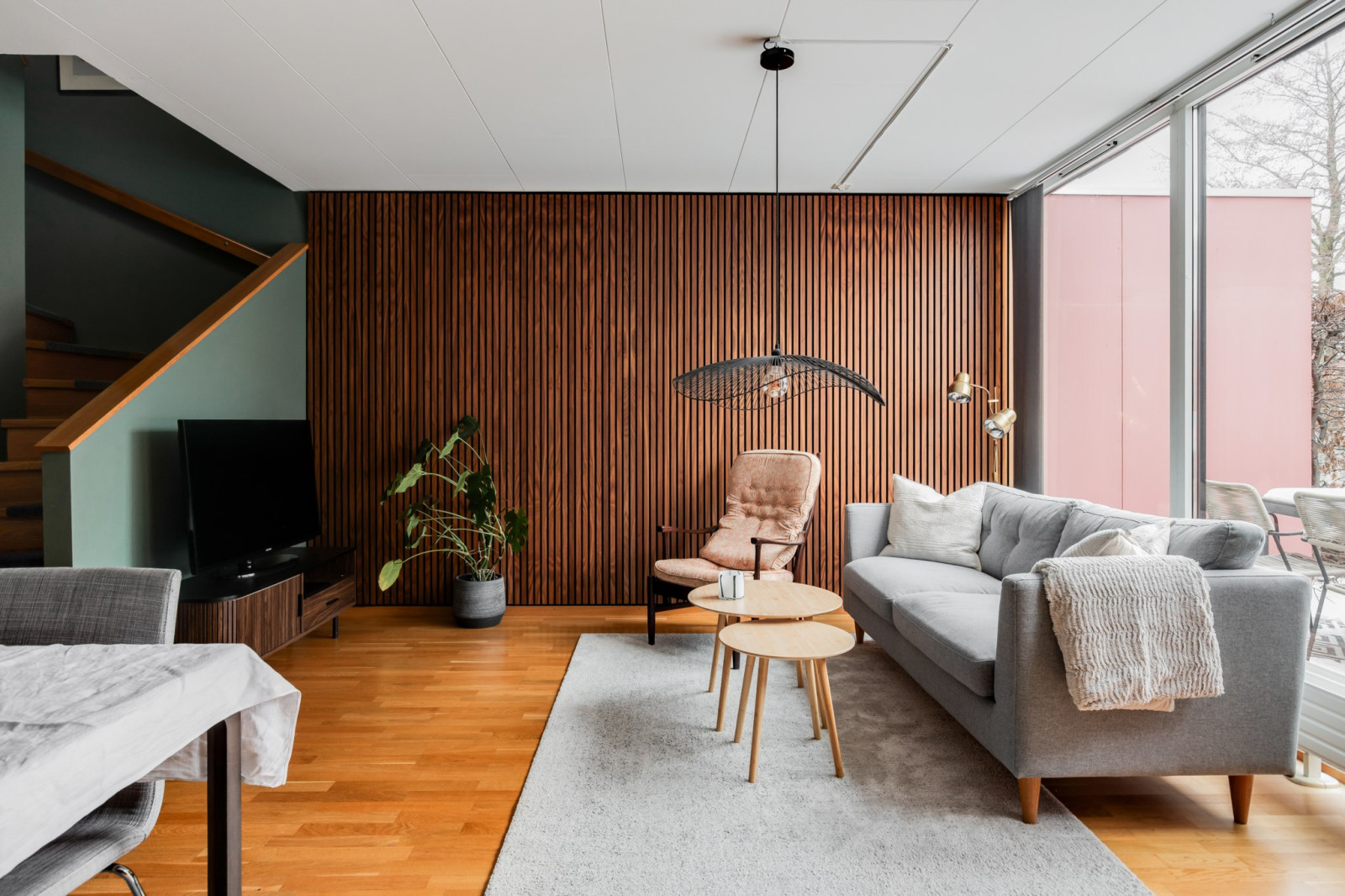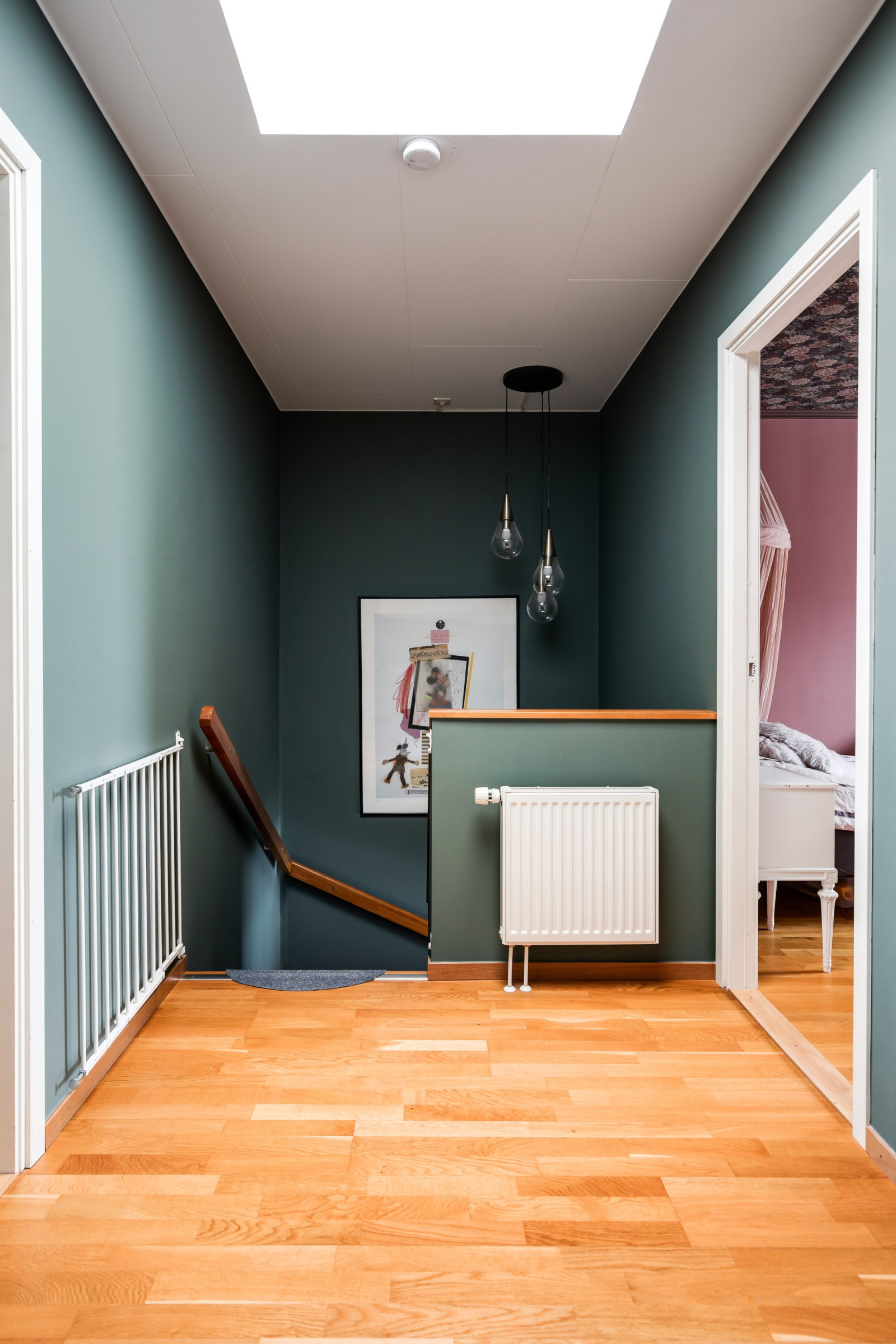 Parkettgolv, målad vägg/akustikpanel (Wood on wall). Trevlig och funktionell platsbyggd bokhylla som ingår i köpet. Utgång till trädäck och trädgårdstäppa. Trappa upp till övre plan.