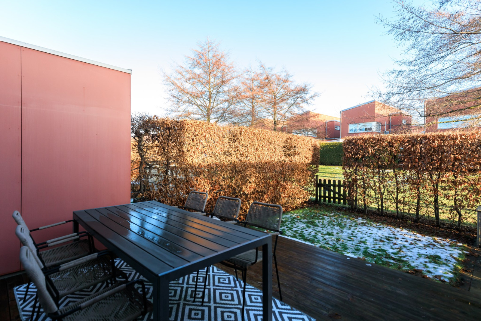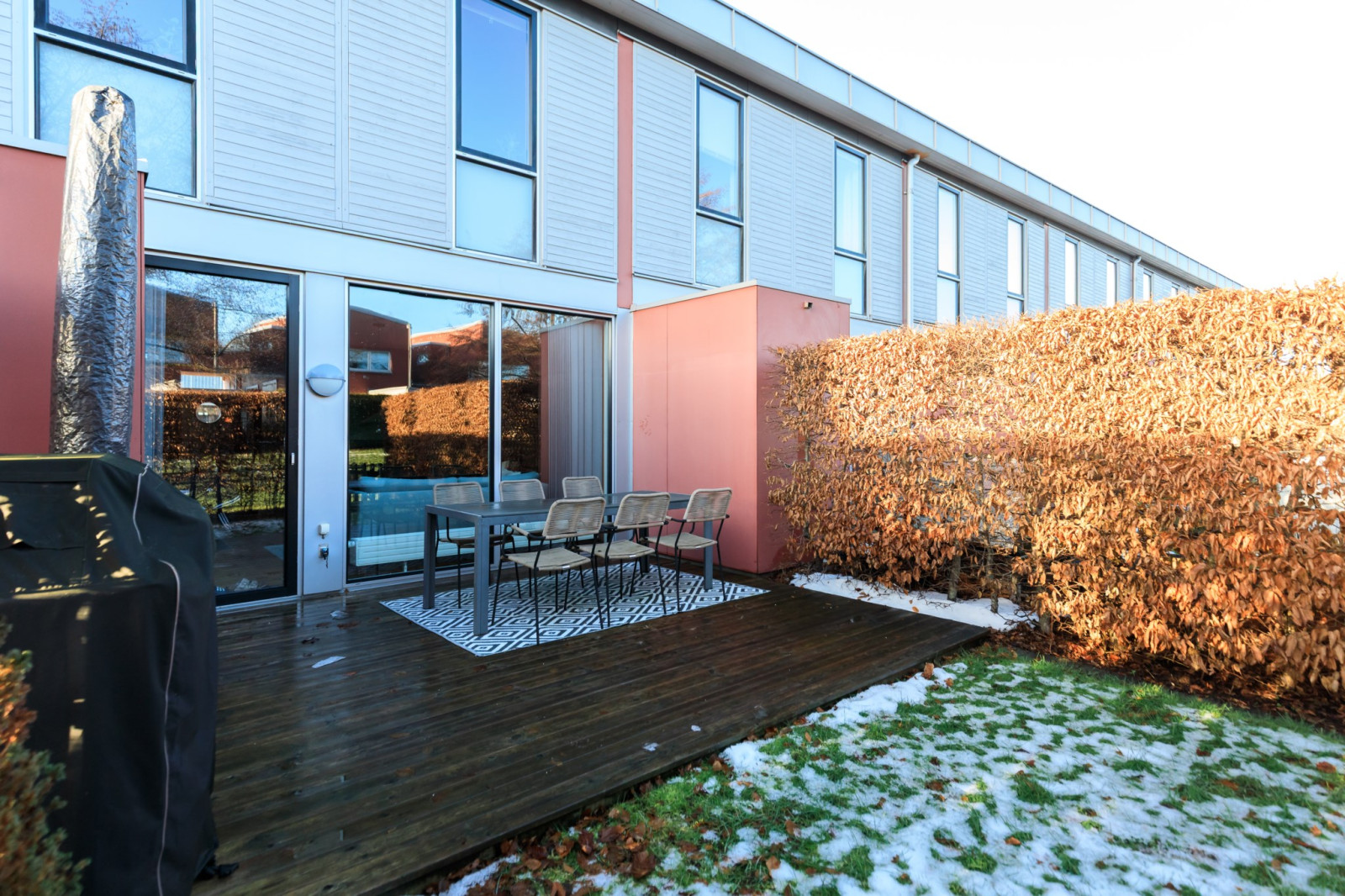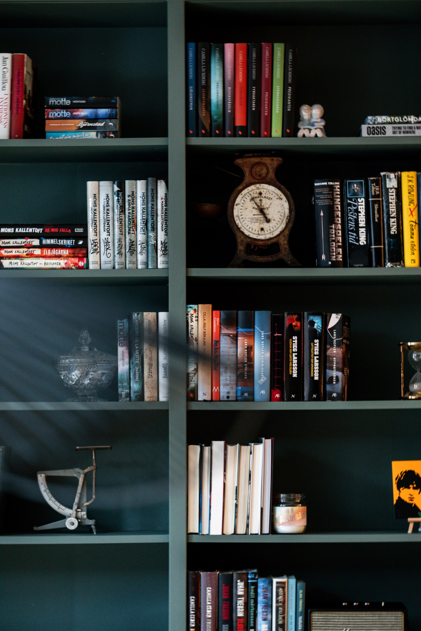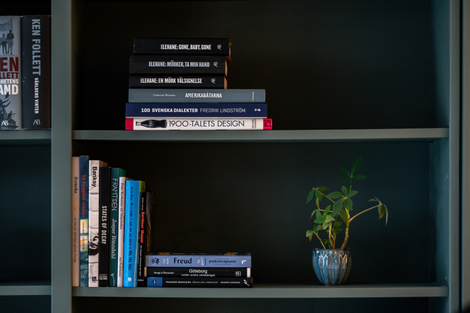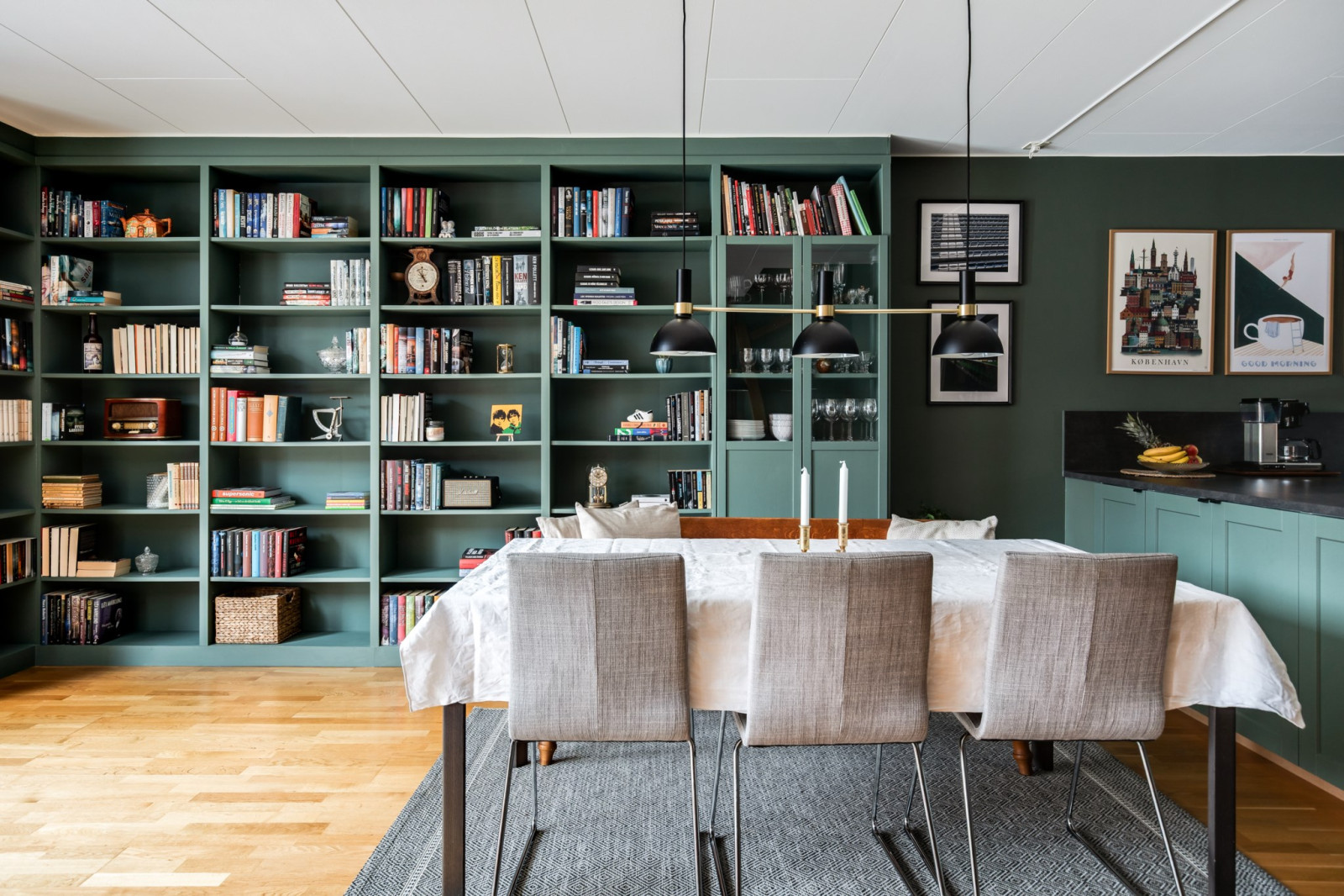Parkettgolv, målad vägg/akustikpanel (Wood on wall). Trevlig och funktionell platsbyggd bokhylla som ingår i köpet. Utgång till trädäck och trädgårdstäppa. Trappa upp till övre plan.